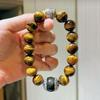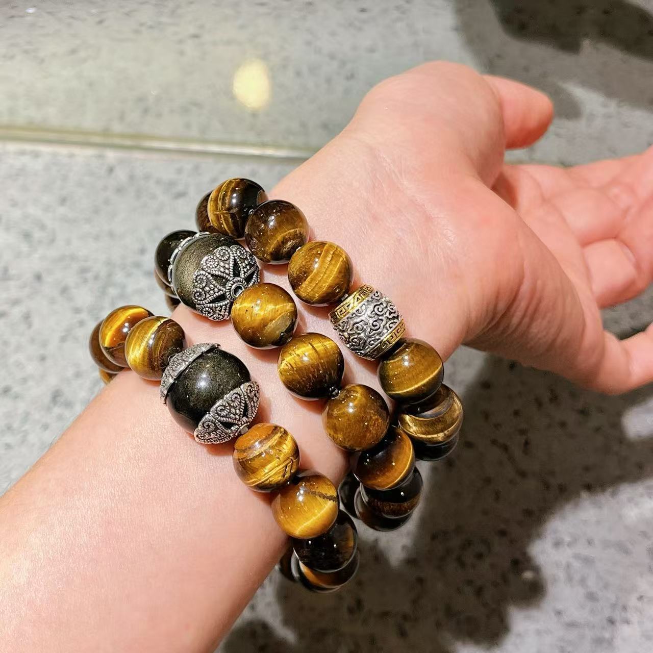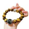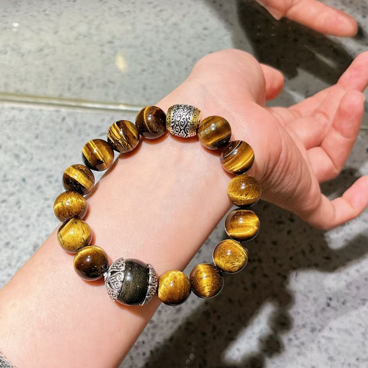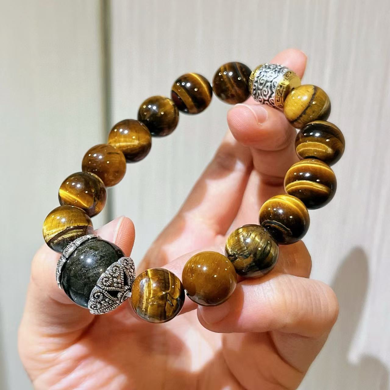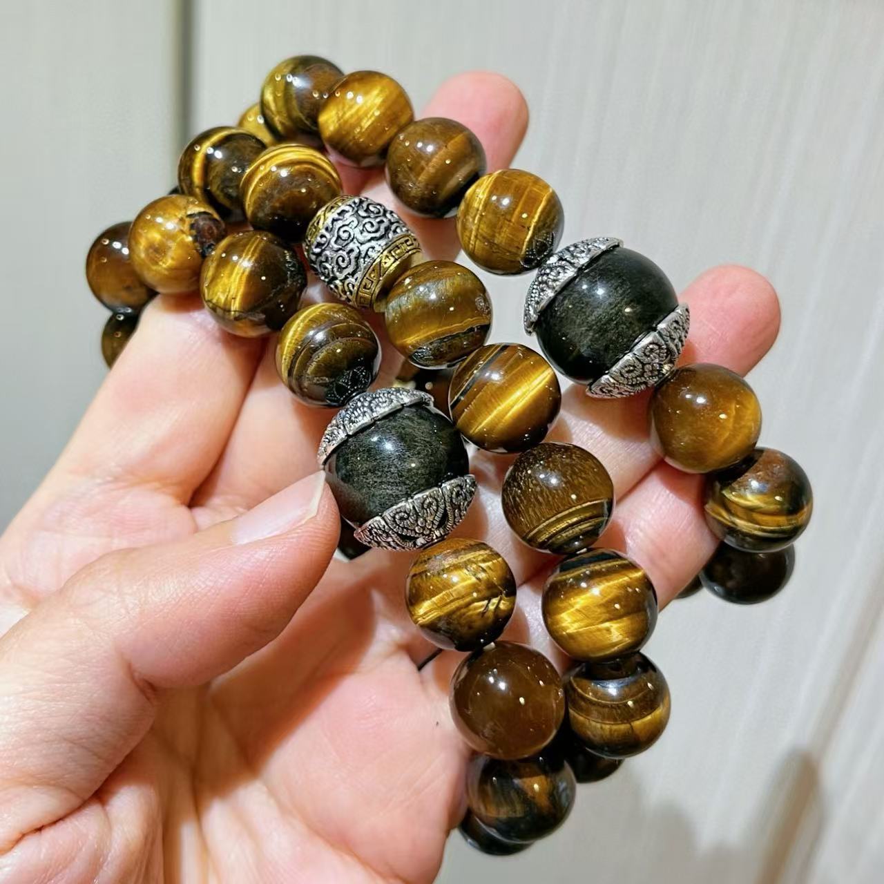 Pulsera de Ojo de Tigre Natural de Grano Grande de 12 mm Pulsera de Obsidiana Plateada de 14 mm de Contraste para Hombre con Sentido del Diseño
