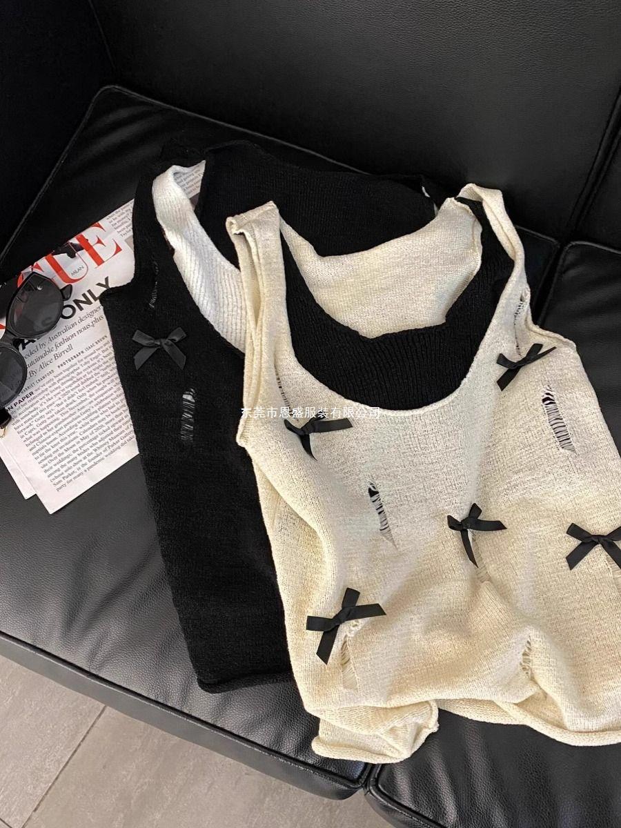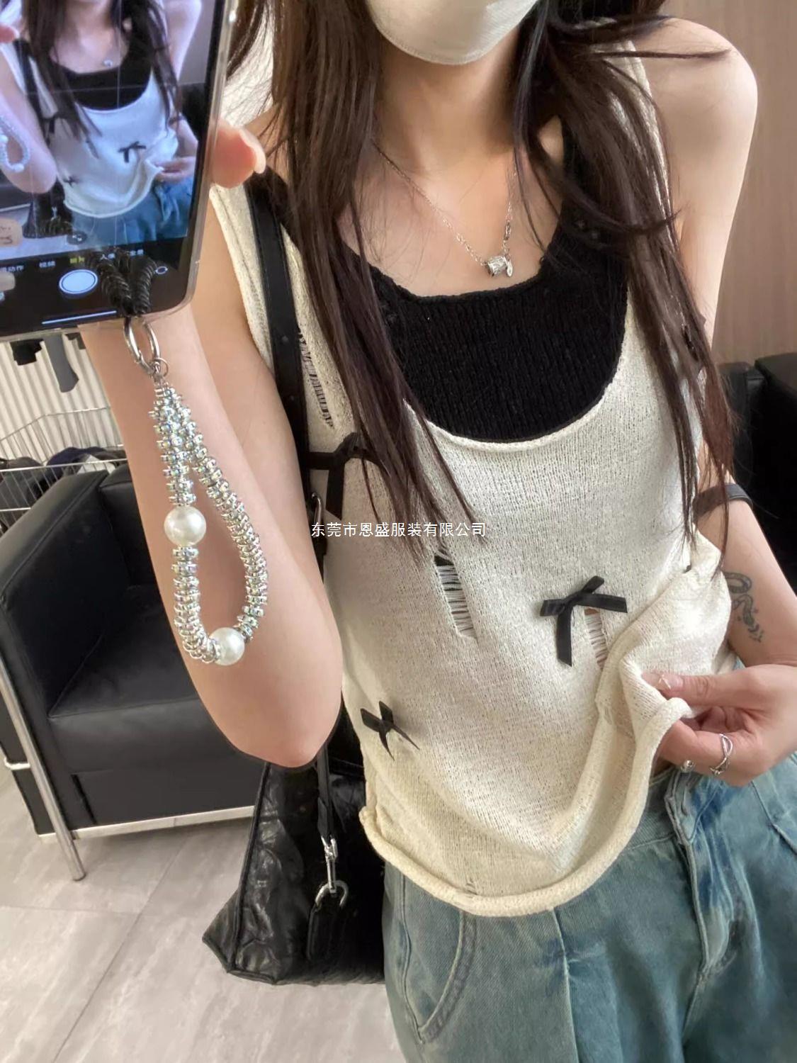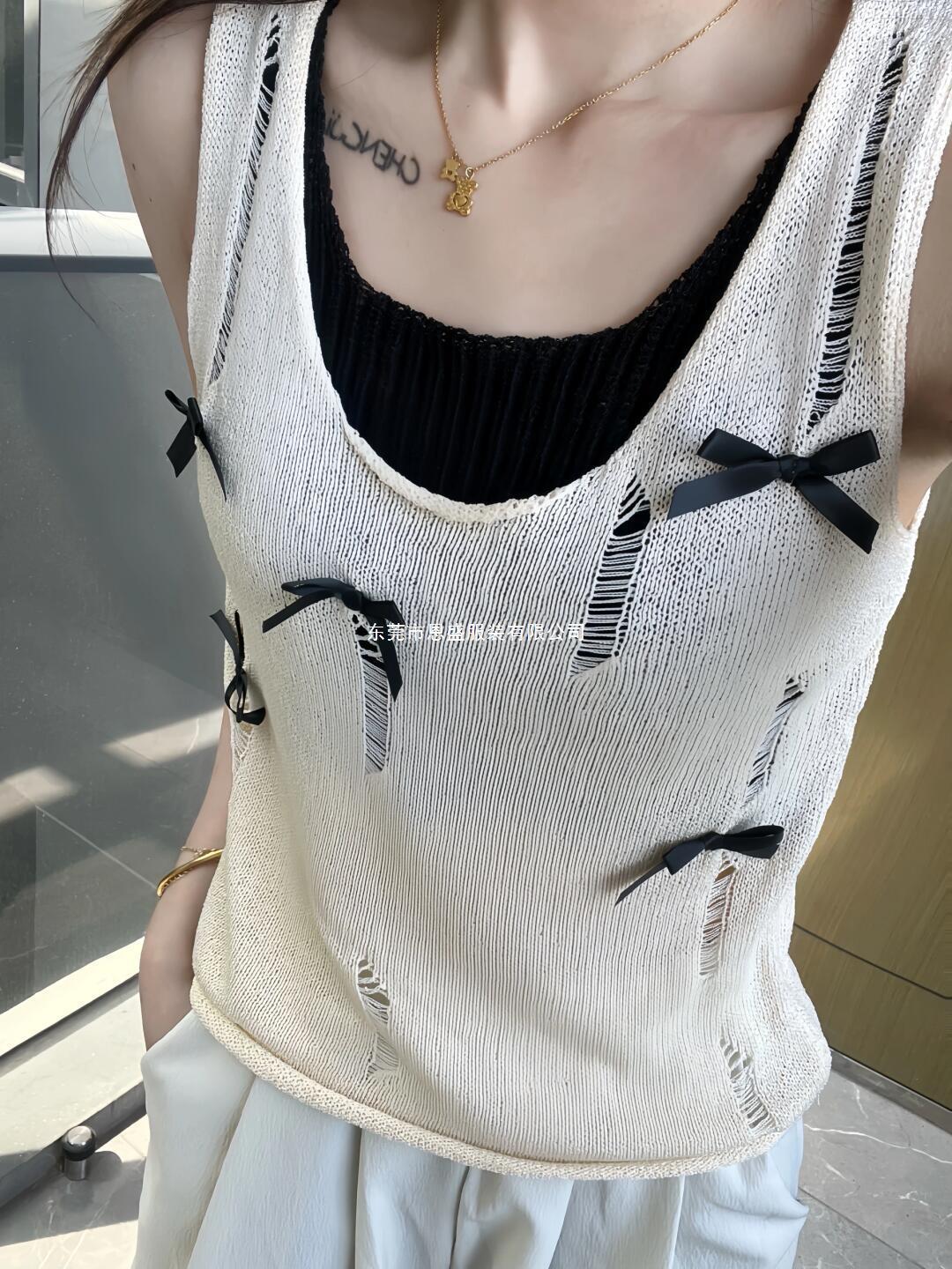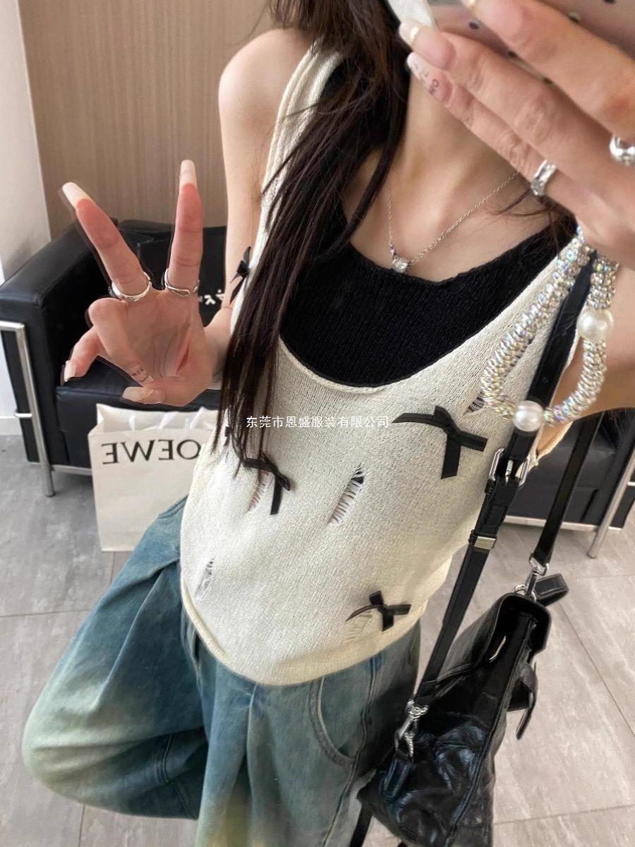 Compra Estilo Perezoso Color Contrastante Chica Hot Dos Piezas Tirantes Nuevo Chaleco Verano Lazo Rizado Tejido Agujero Top Exterior al por mayor en Joom.pro