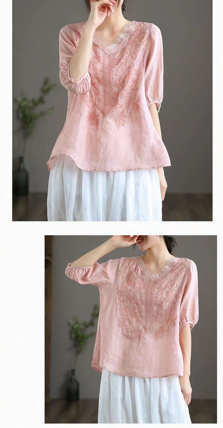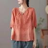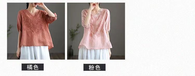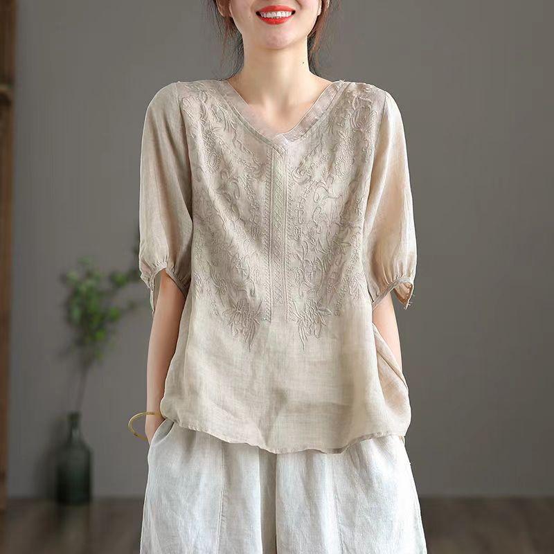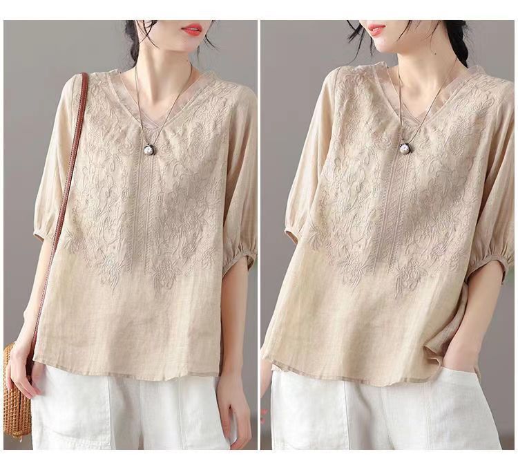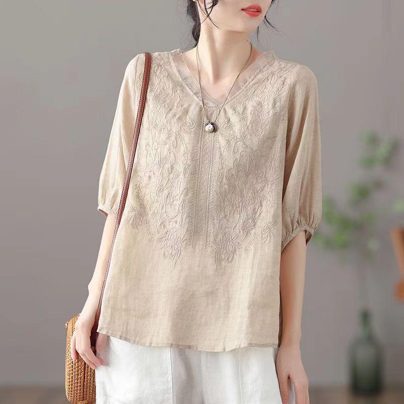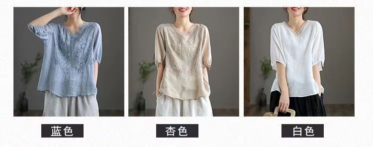 Compra 2024 Retro Tops Delgados Camisas de Manga Corta para Mujer Verano Nuevo Suelto Cuello en V Elegante Camisas de Algodón y Lino Color Albaricoque al por mayor en Joom.pro