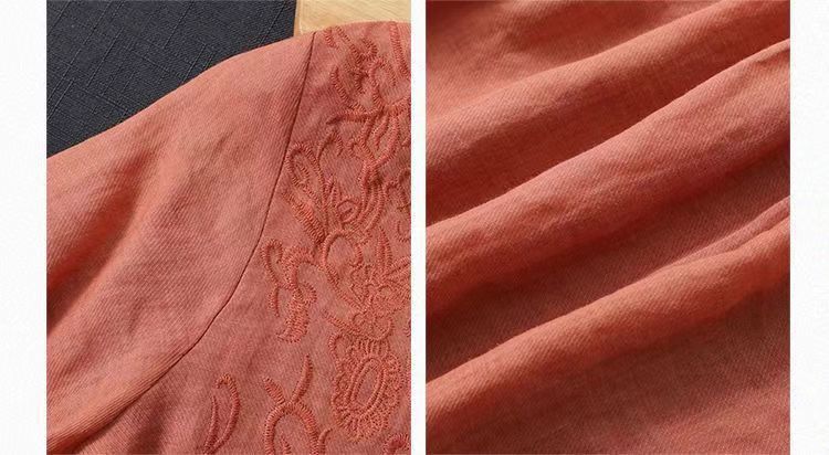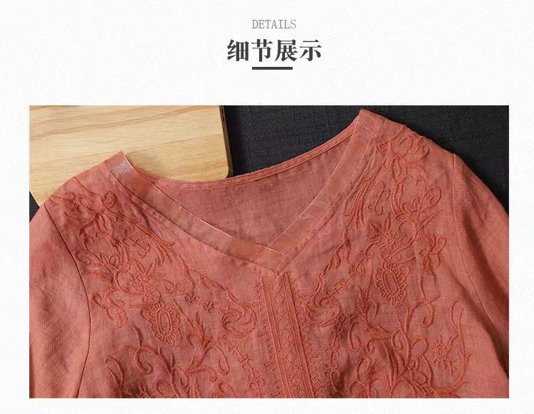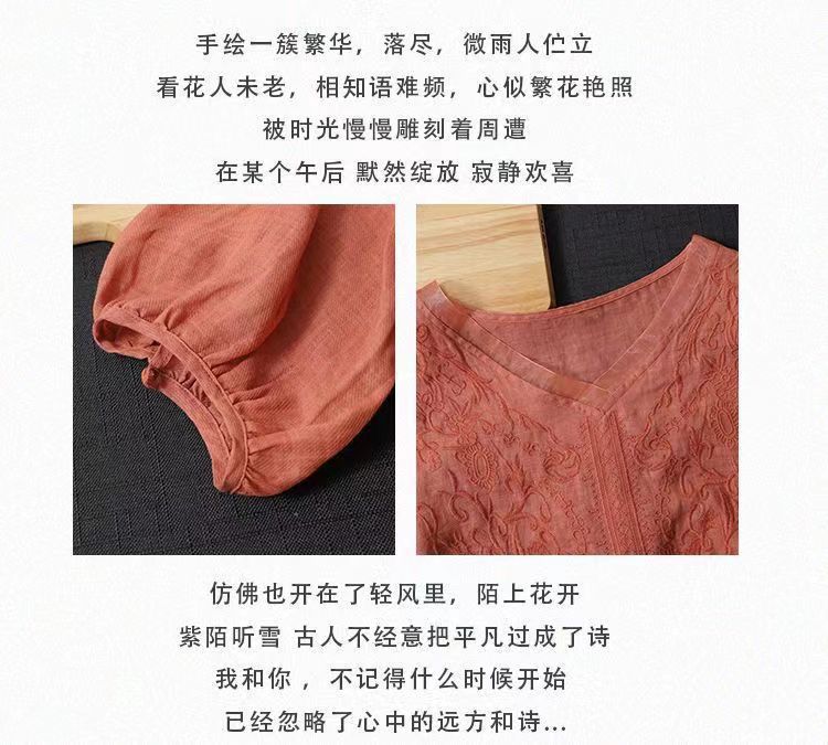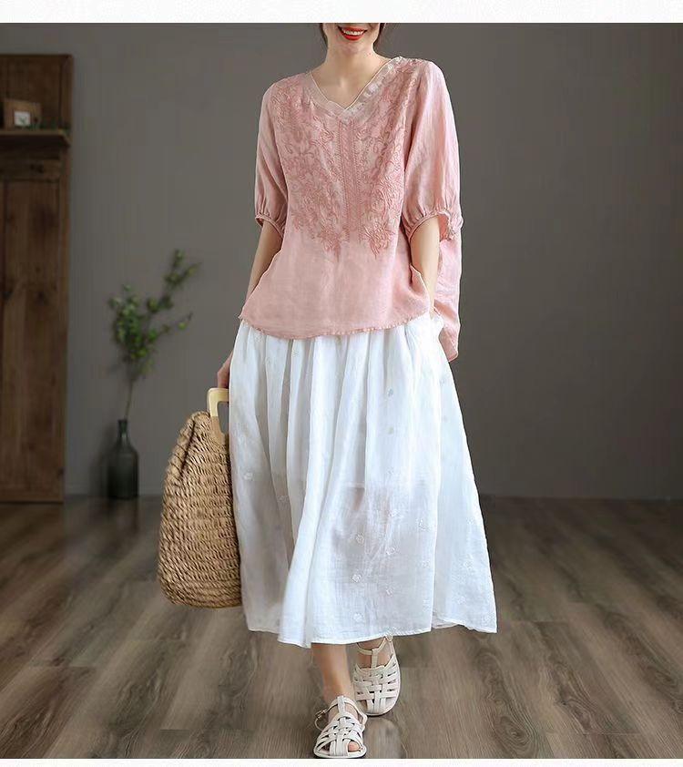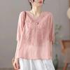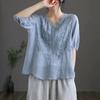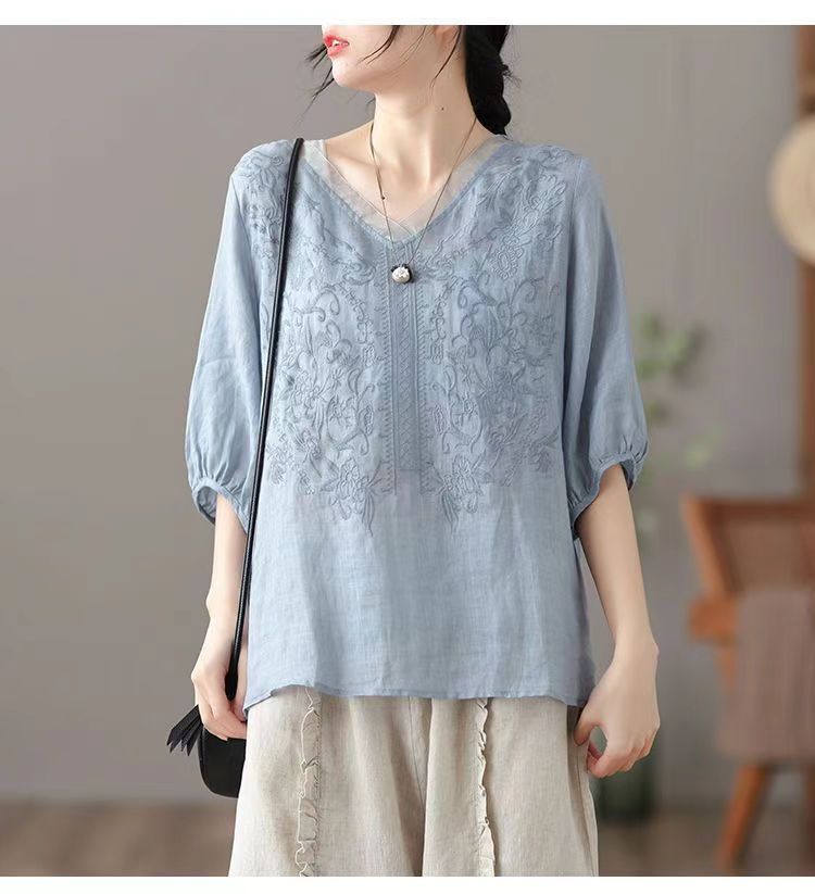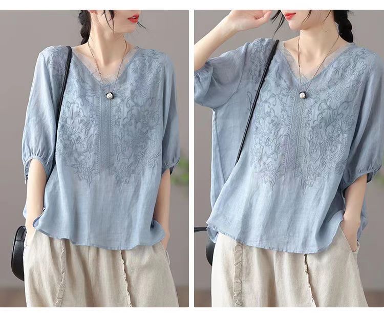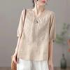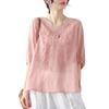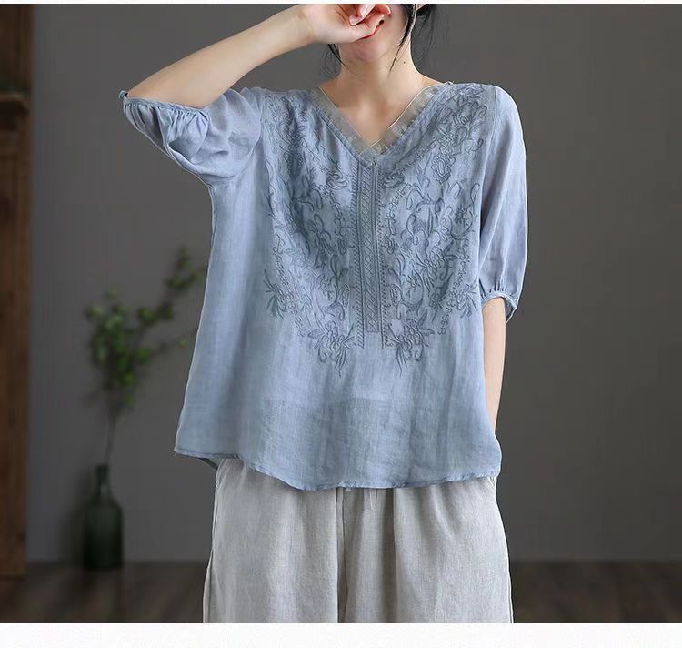 Compra 2024 Retro Tops Delgados Camisas de Manga Corta para Mujer Verano Nuevo Suelto Cuello en V Elegante Camisas de Algodón y Lino Color Albaricoque al por mayor en Joom.pro