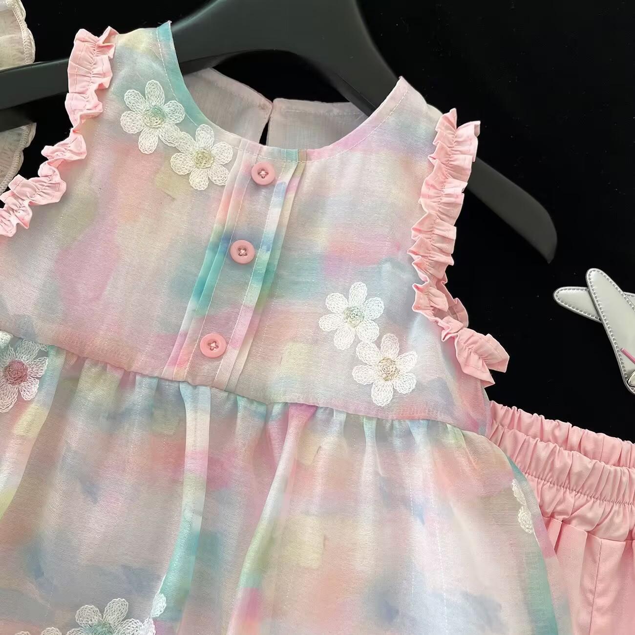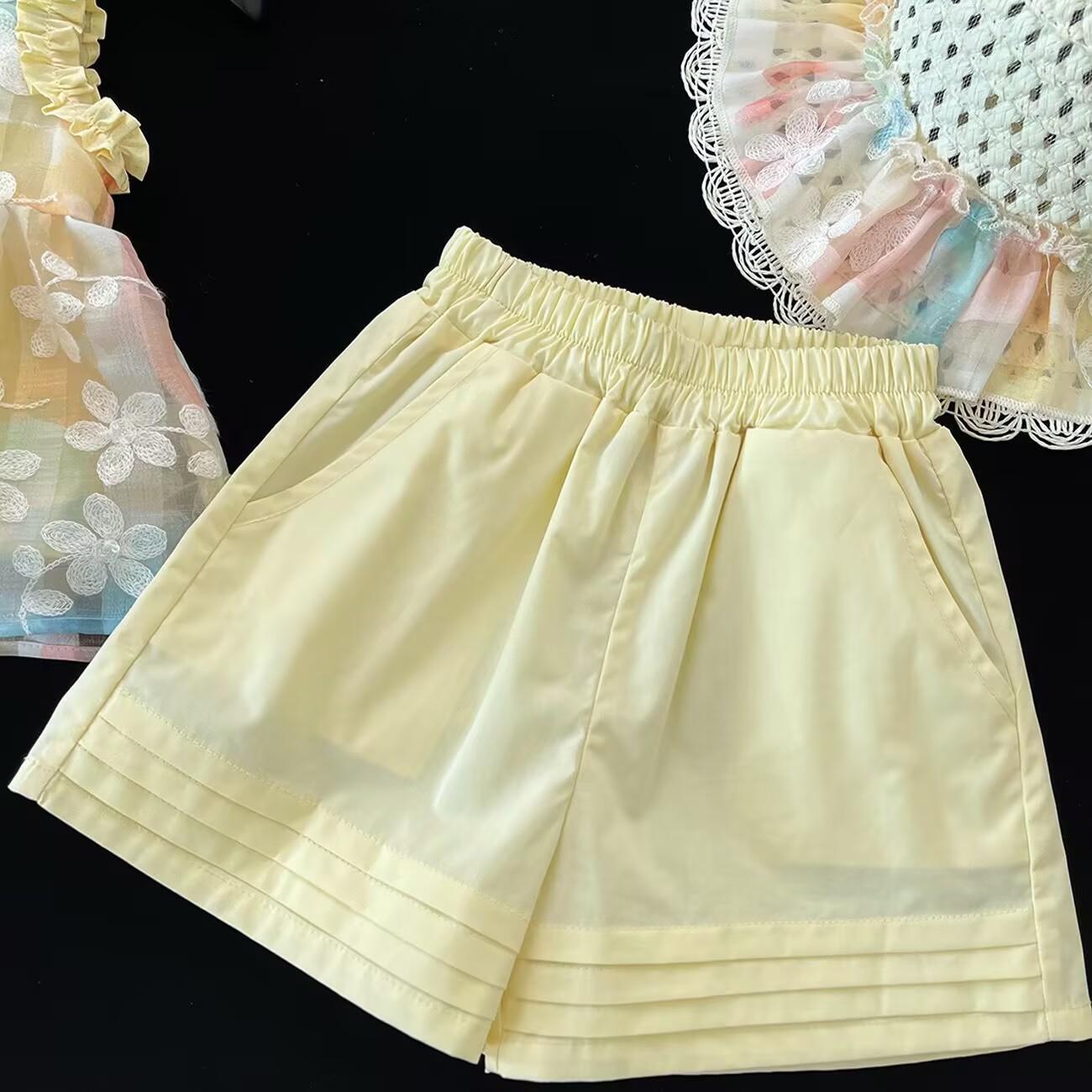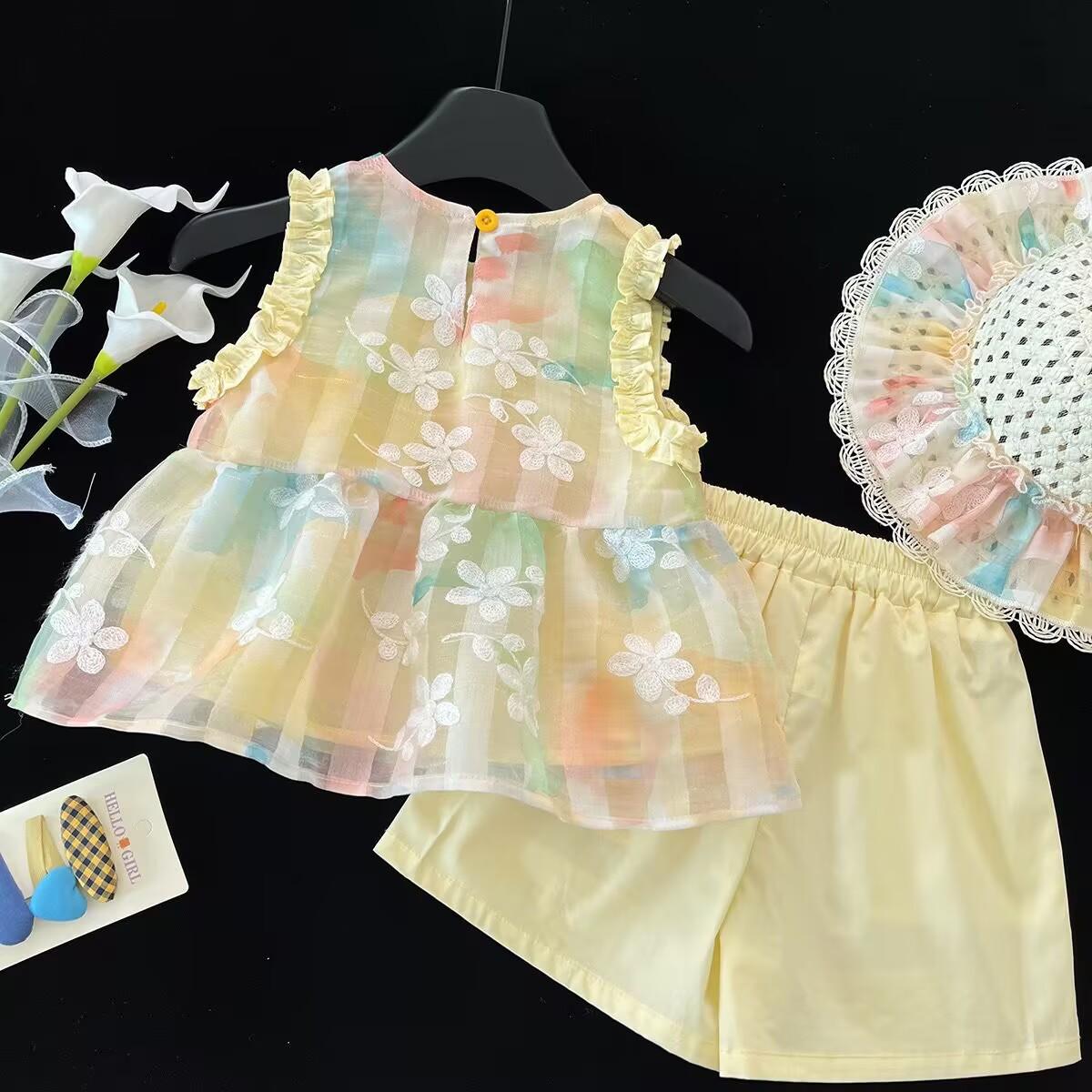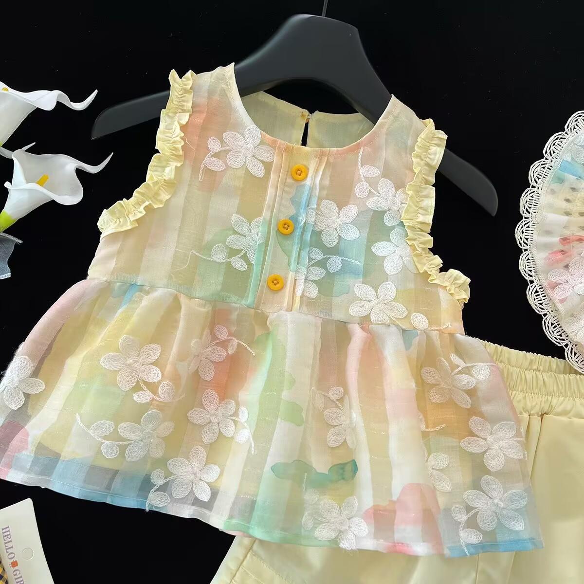 Traje de verano 2025 para niñas, nuevo chaleco bordado, camisa y pantalones cortos de encaje, conjunto de dos piezas de princesa de estilo coreano