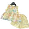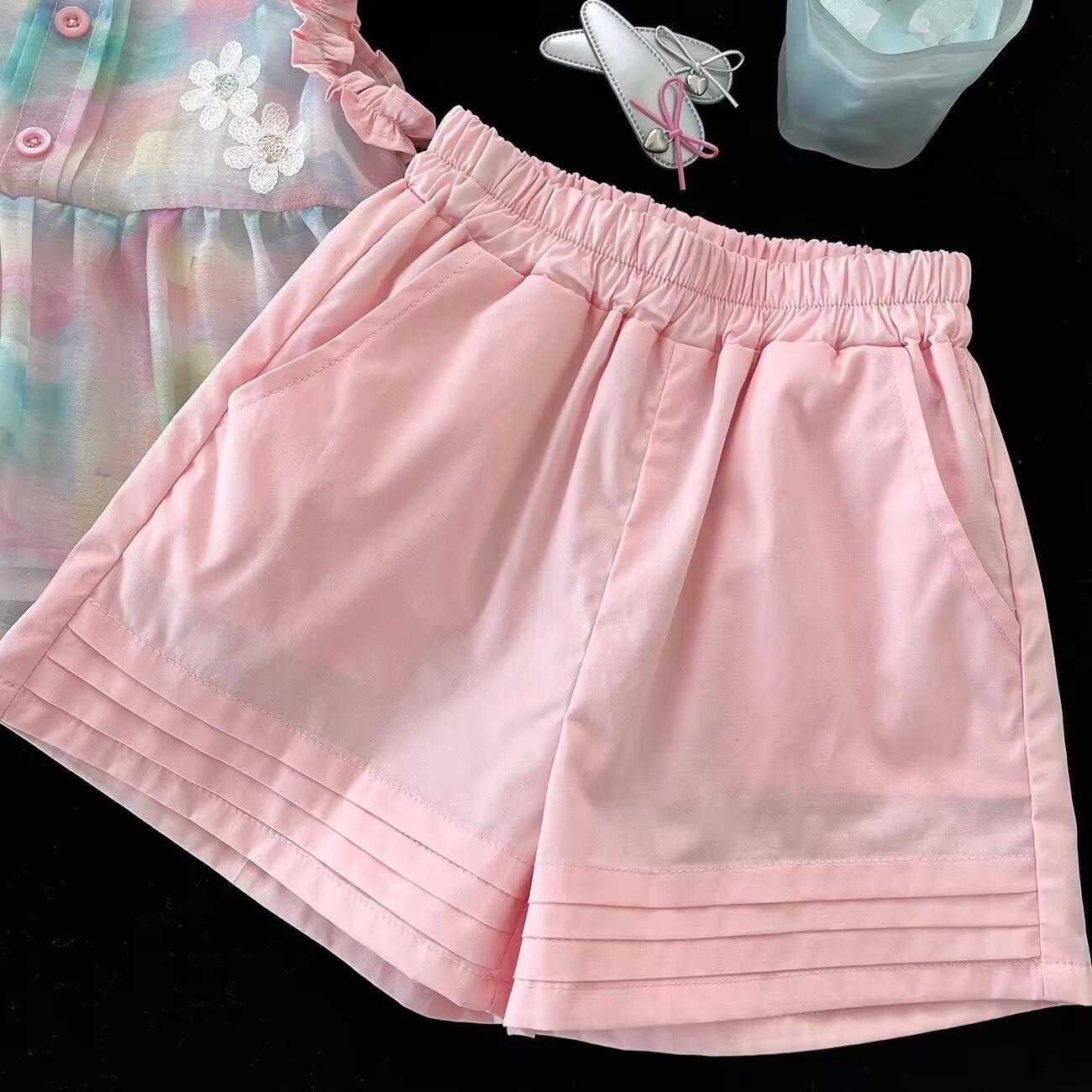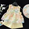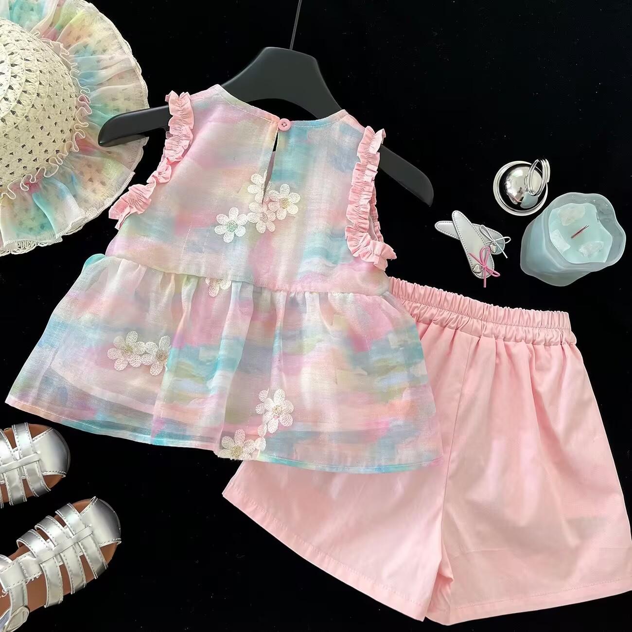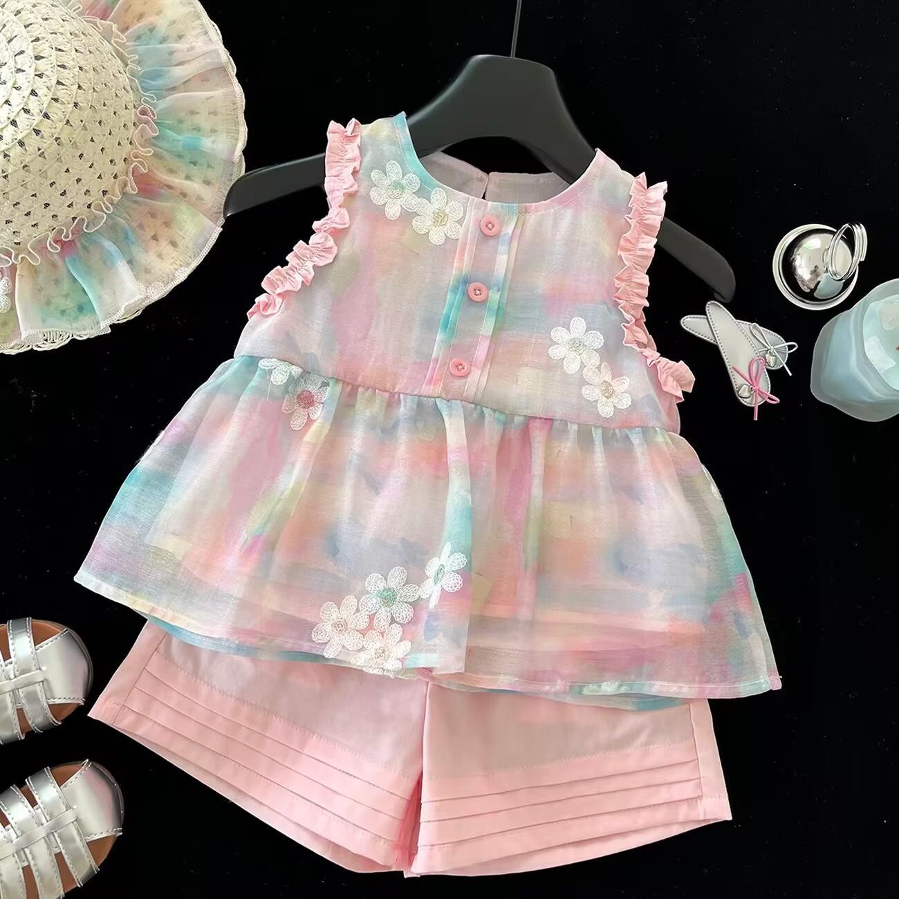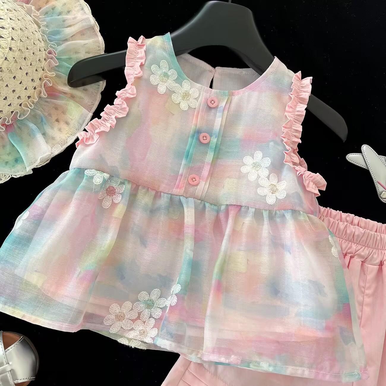 Traje de verano 2025 para niñas, nuevo chaleco bordado, camisa y pantalones cortos de encaje, conjunto de dos piezas de princesa de estilo coreano