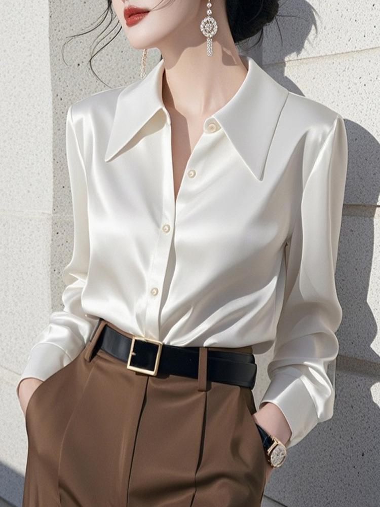 Moda Sentido de Alta Gama Hermosa Camisa Blanca de Solapa de Manga Larga para Mujer Estilo Nuevo de Primavera y Otoño Combinable para Oficina Profesional