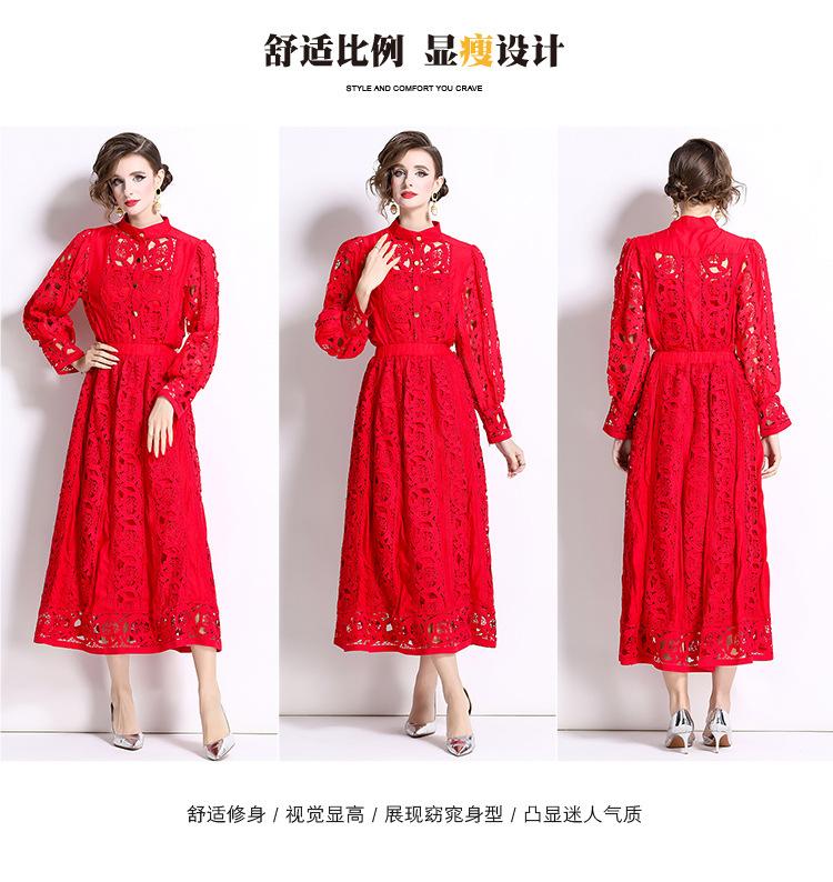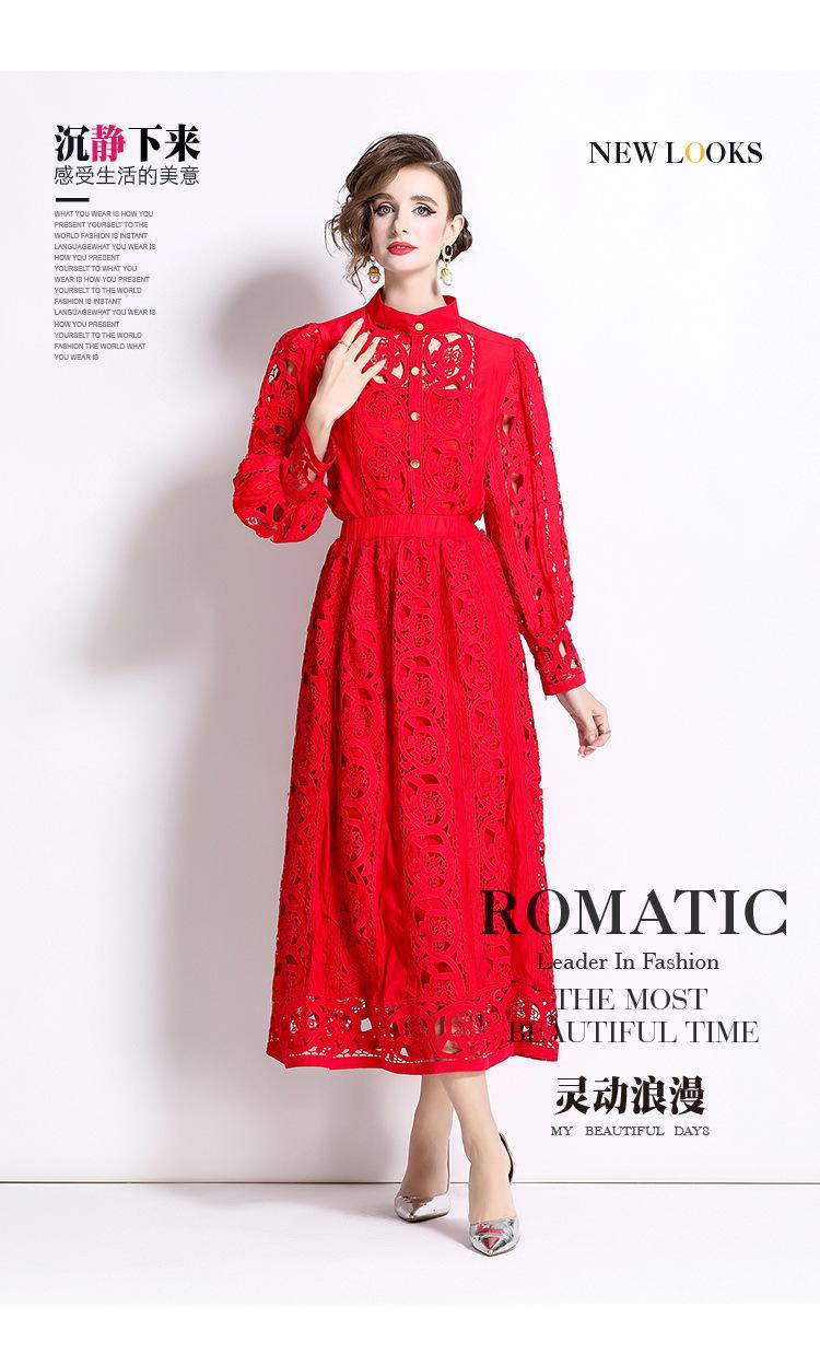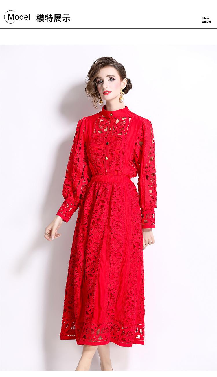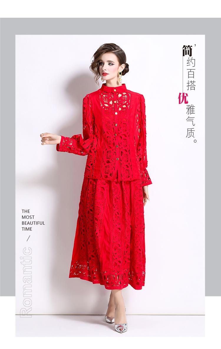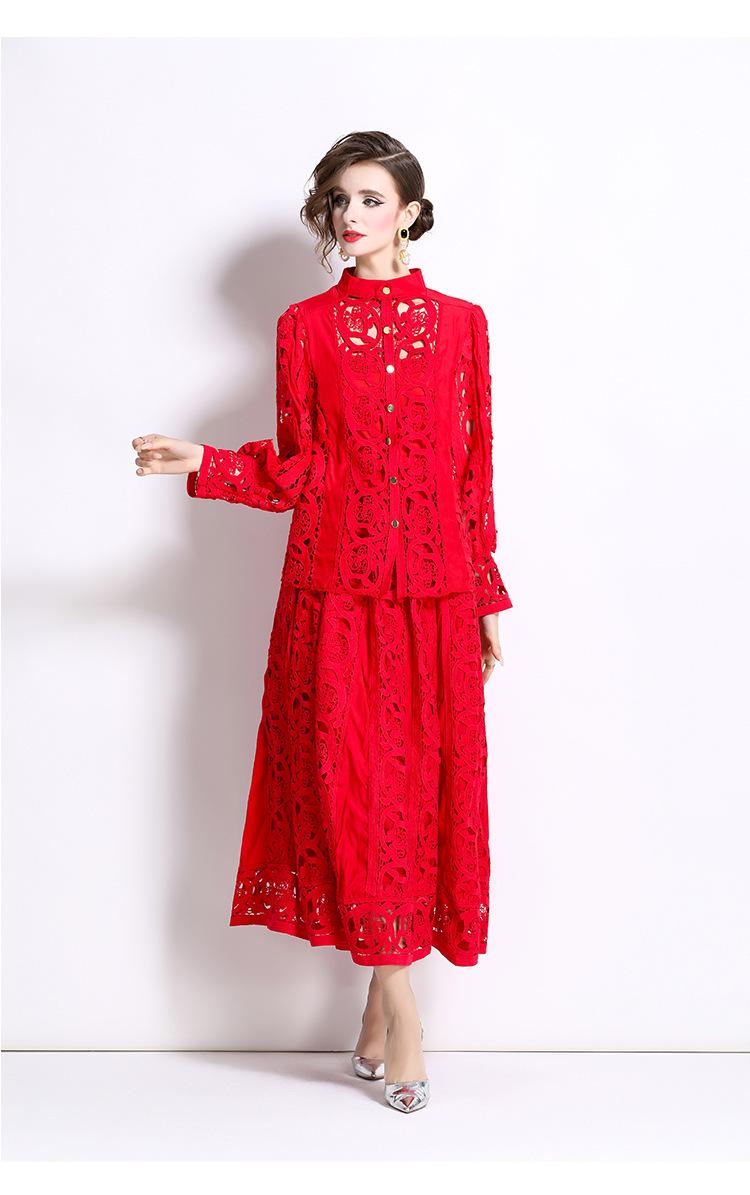 Moda transfronteriza 2024 nuevo temperamento francés top de encaje calado falda de cintura elástica conjunto de dos piezas