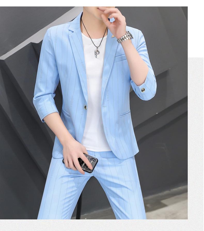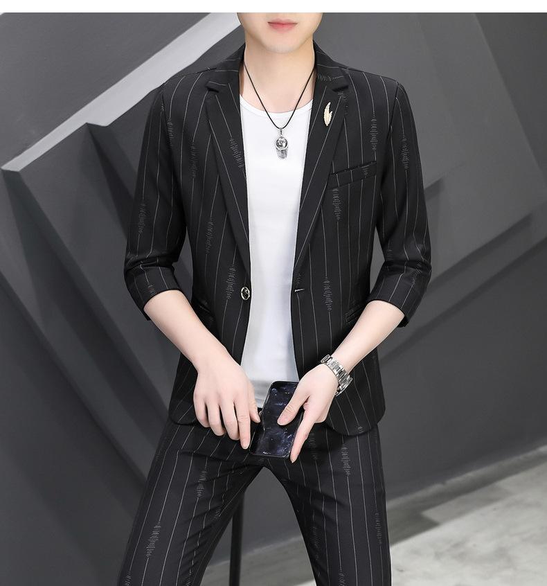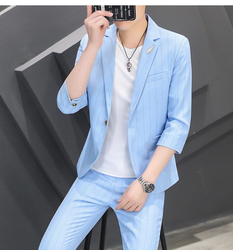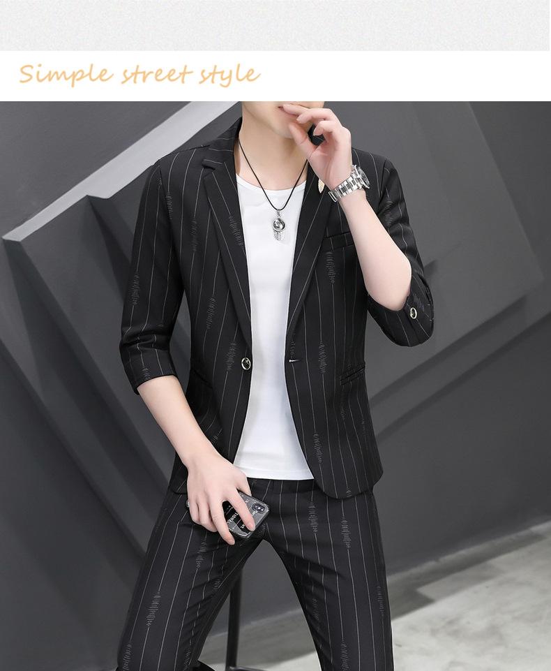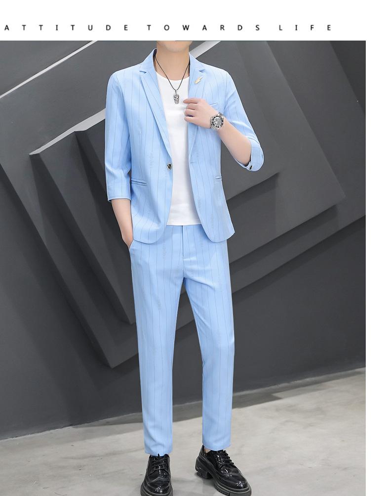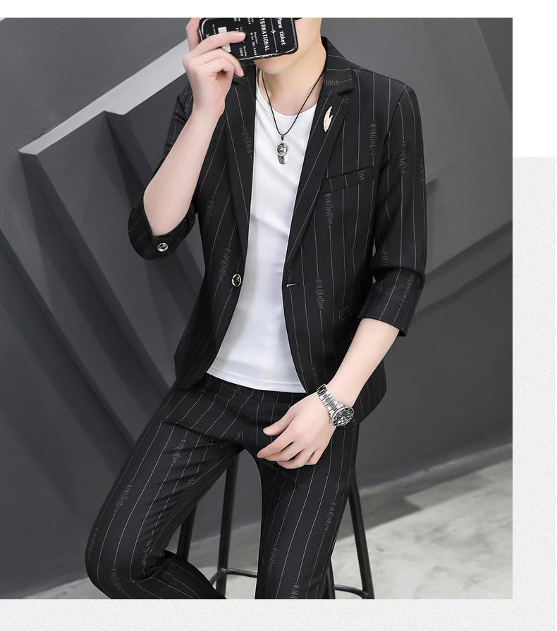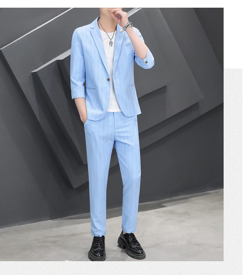 Traje de verano para hombre, traje informal fino a rayas de manga media, chaqueta para hombre, traje de dos piezas ajustado estilo coreano