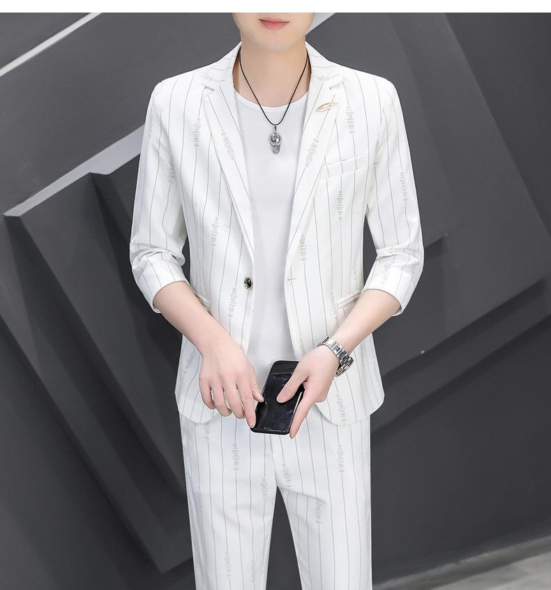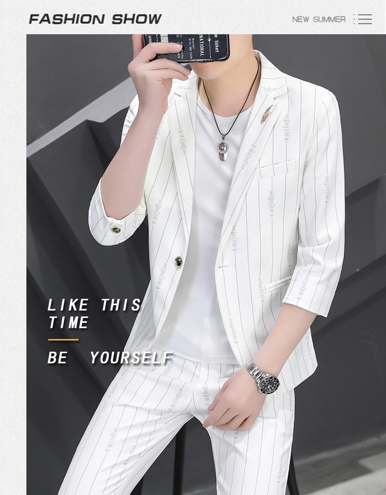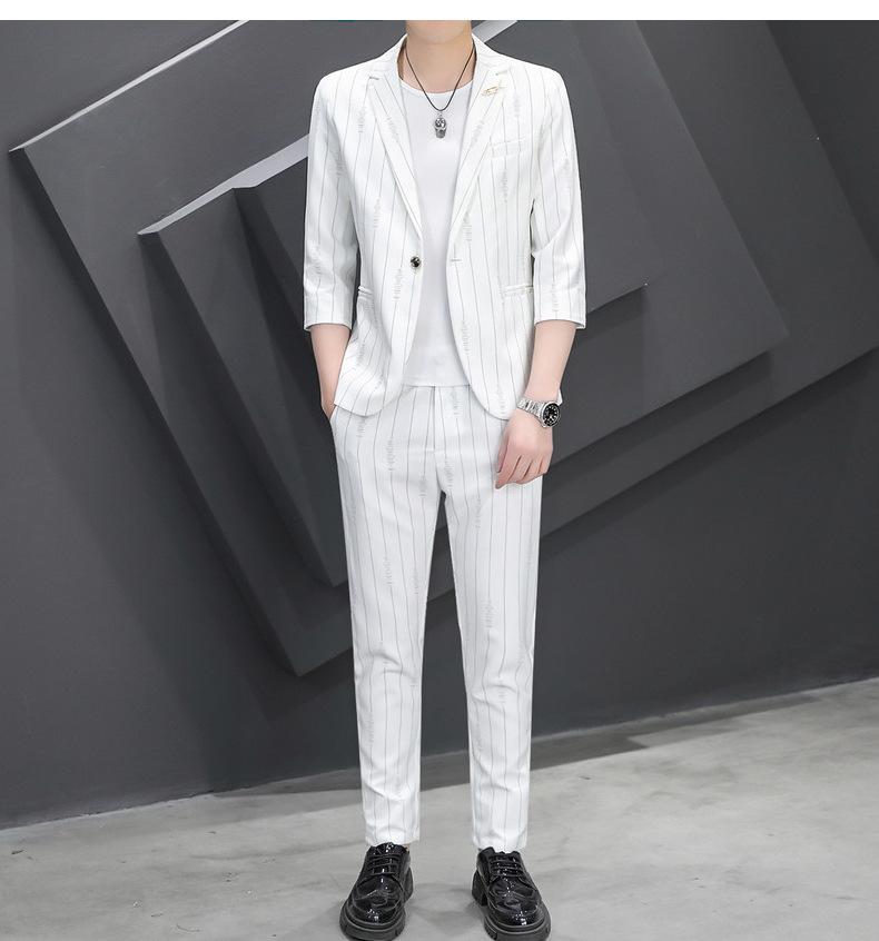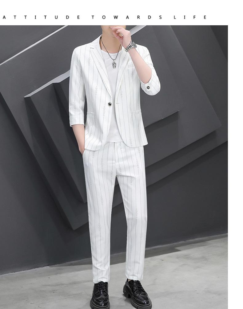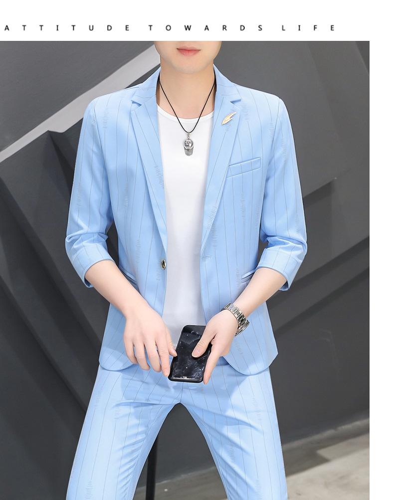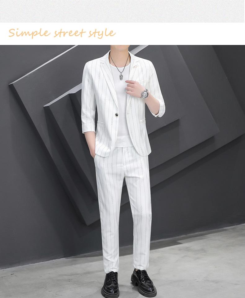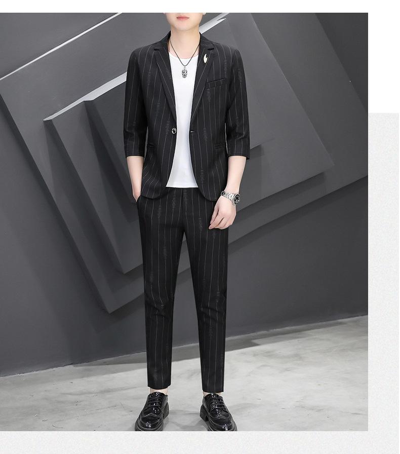 Traje de verano para hombre, traje informal fino a rayas de manga media, chaqueta para hombre, traje de dos piezas ajustado estilo coreano