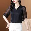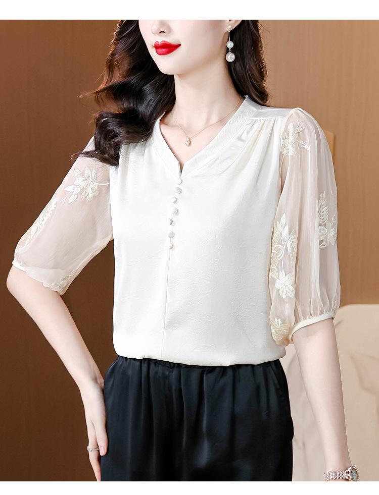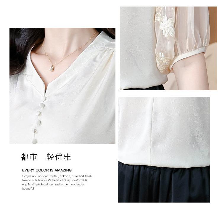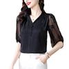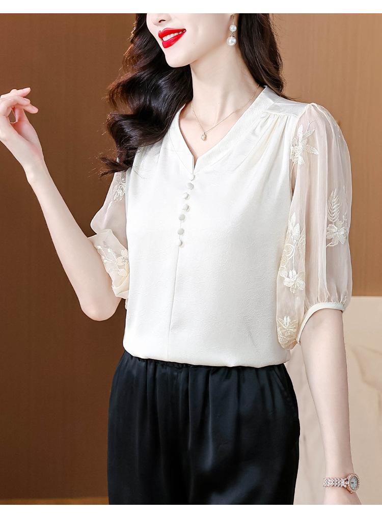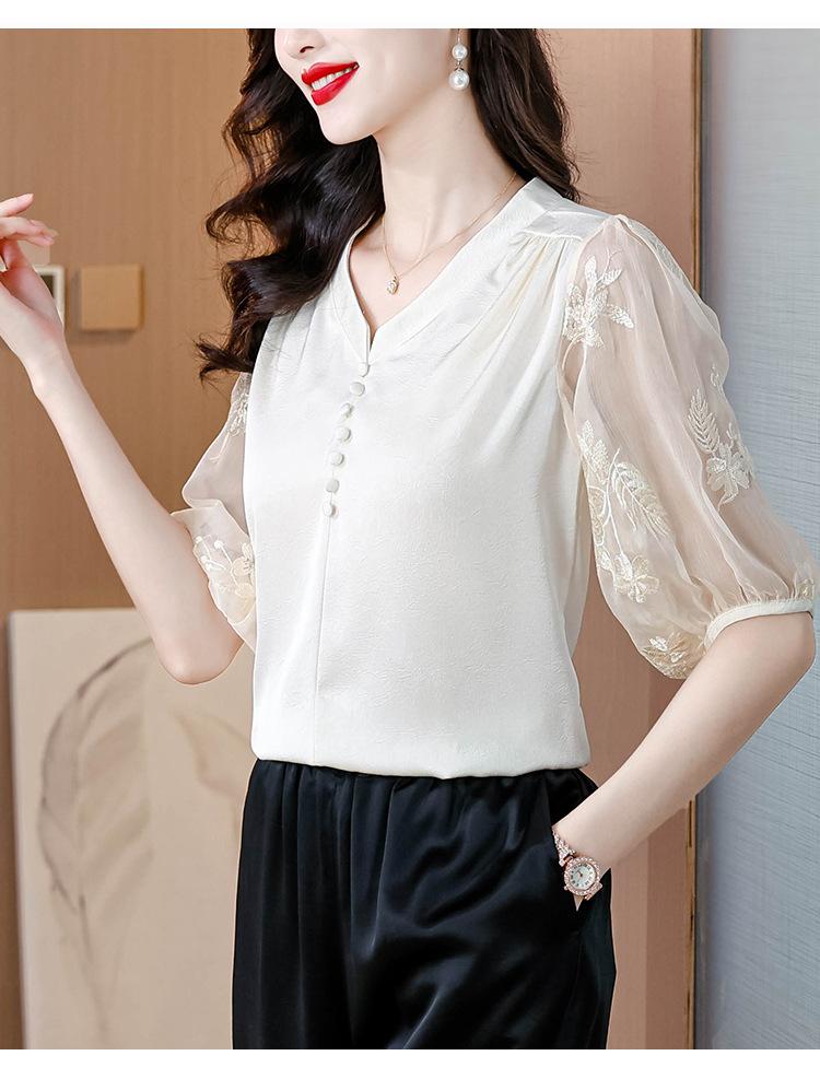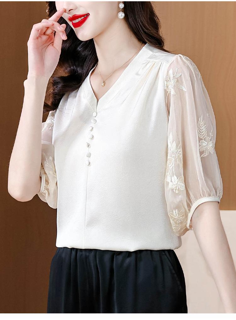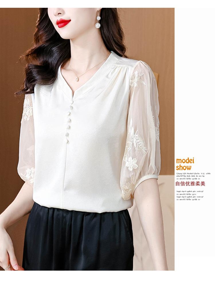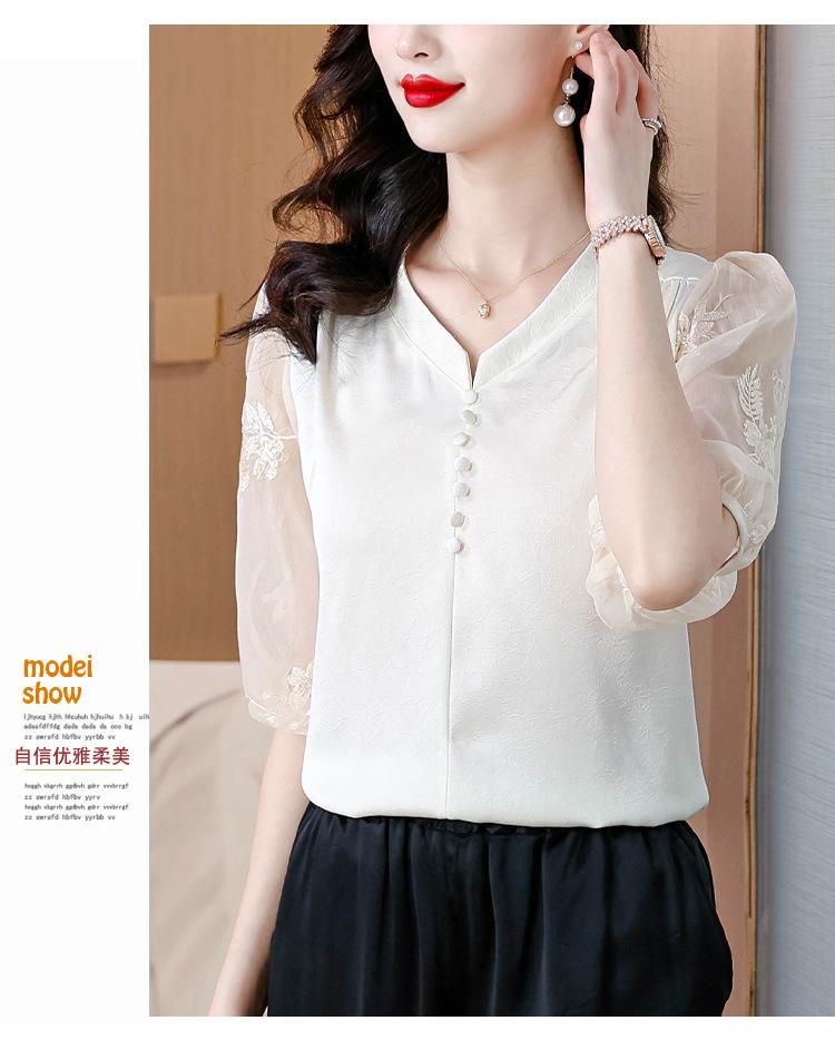 Camisa de gasa con bordado intenso para mujer, estilo nuevo de verano 2025, con cuello en V, holgada, antiedad, adelgazante y fina.
