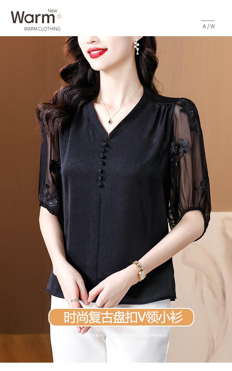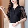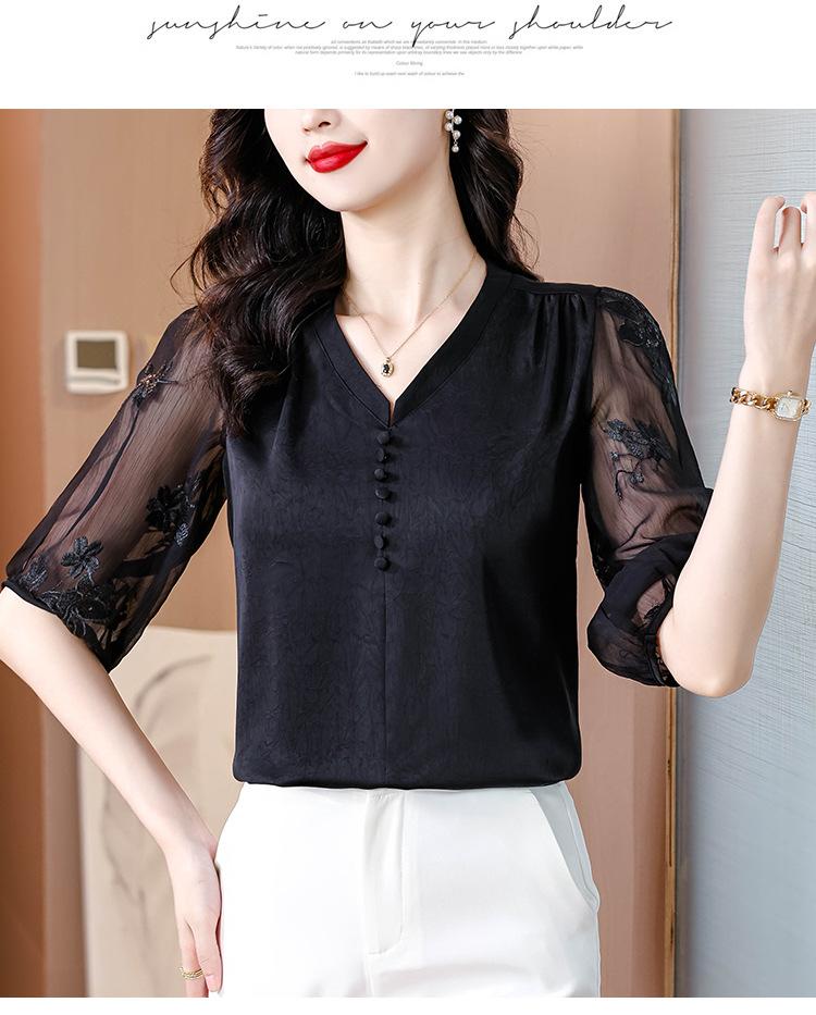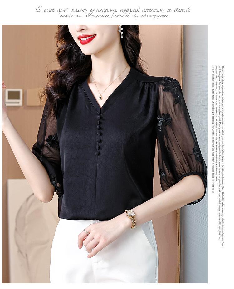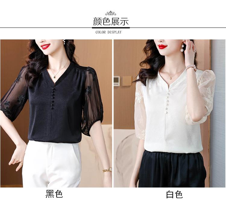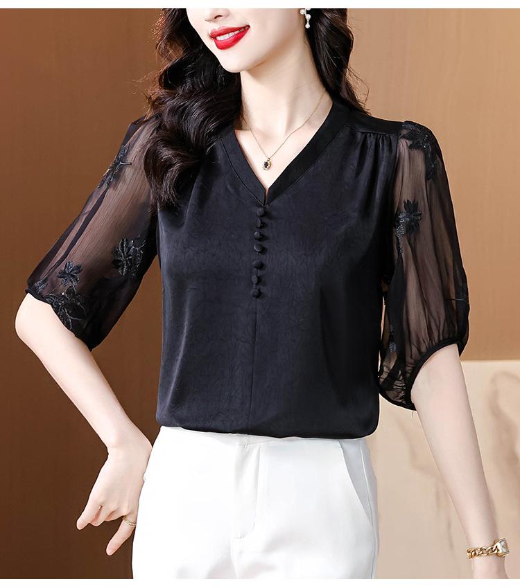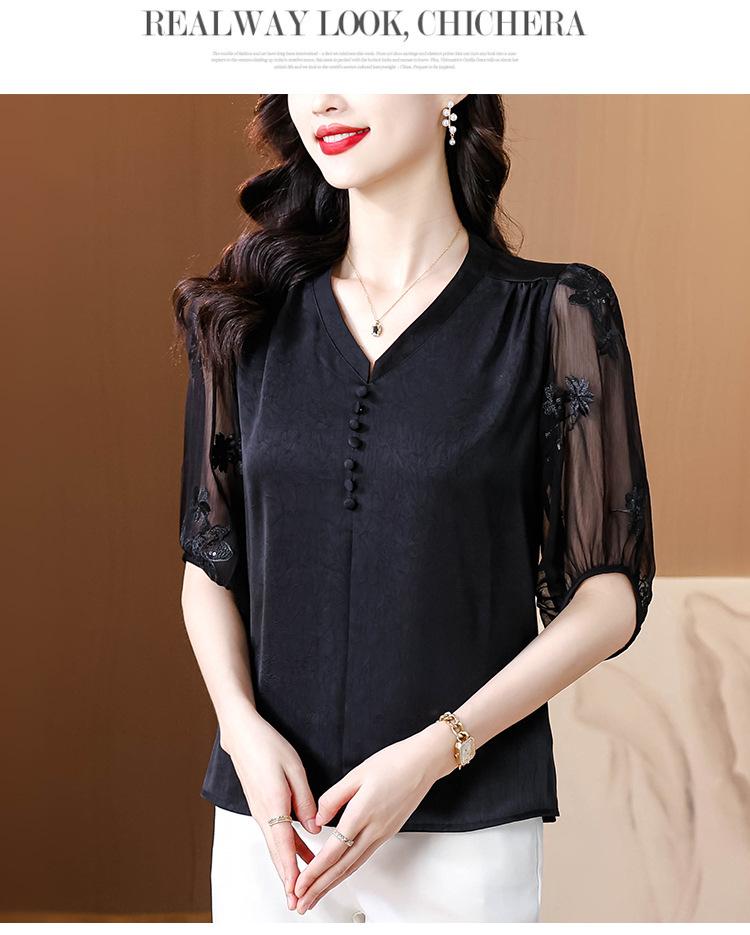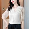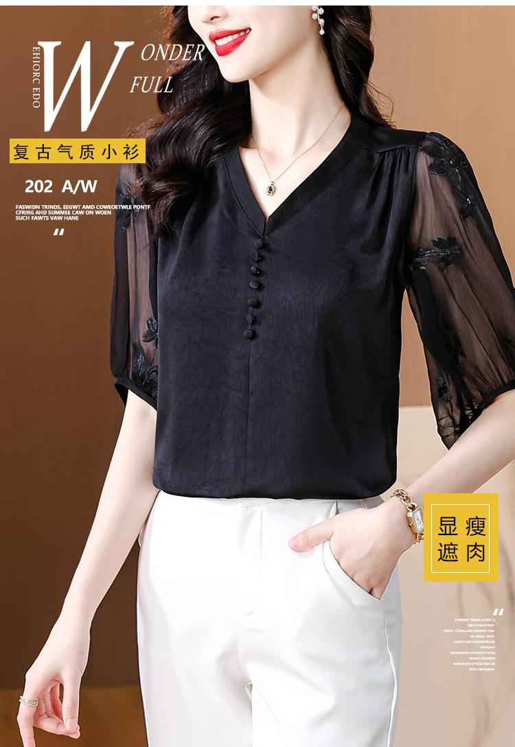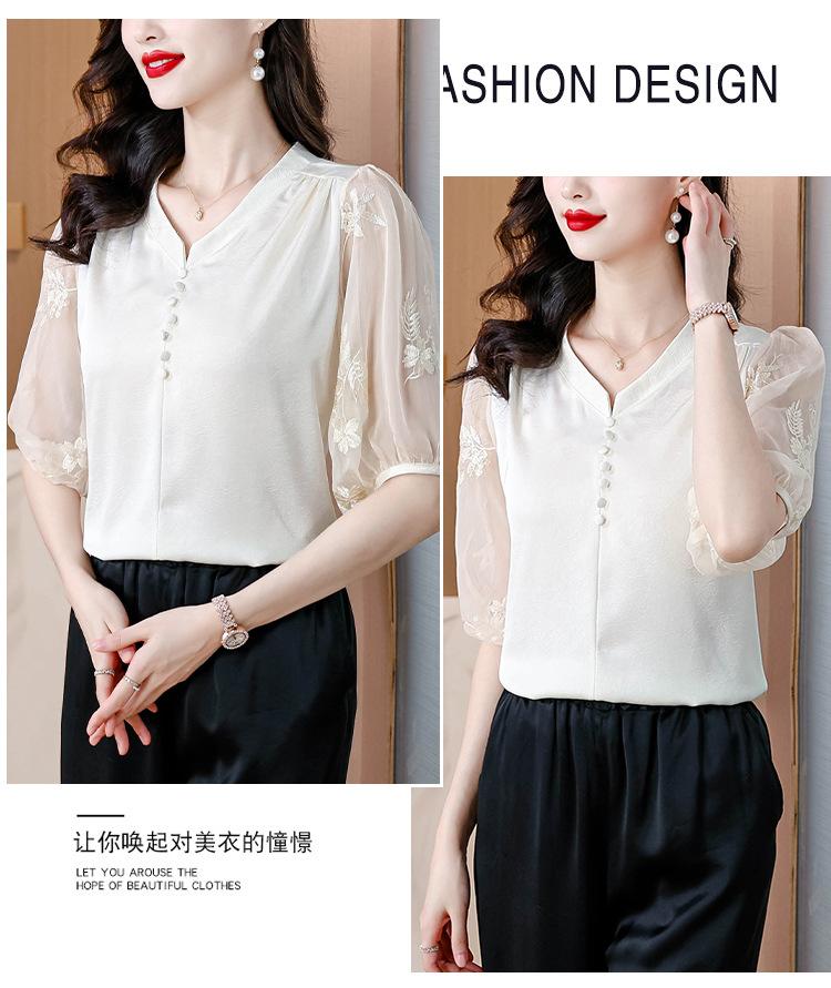 Camisa de gasa con bordado intenso para mujer, estilo nuevo de verano 2025, con cuello en V, holgada, antiedad, adelgazante y fina.