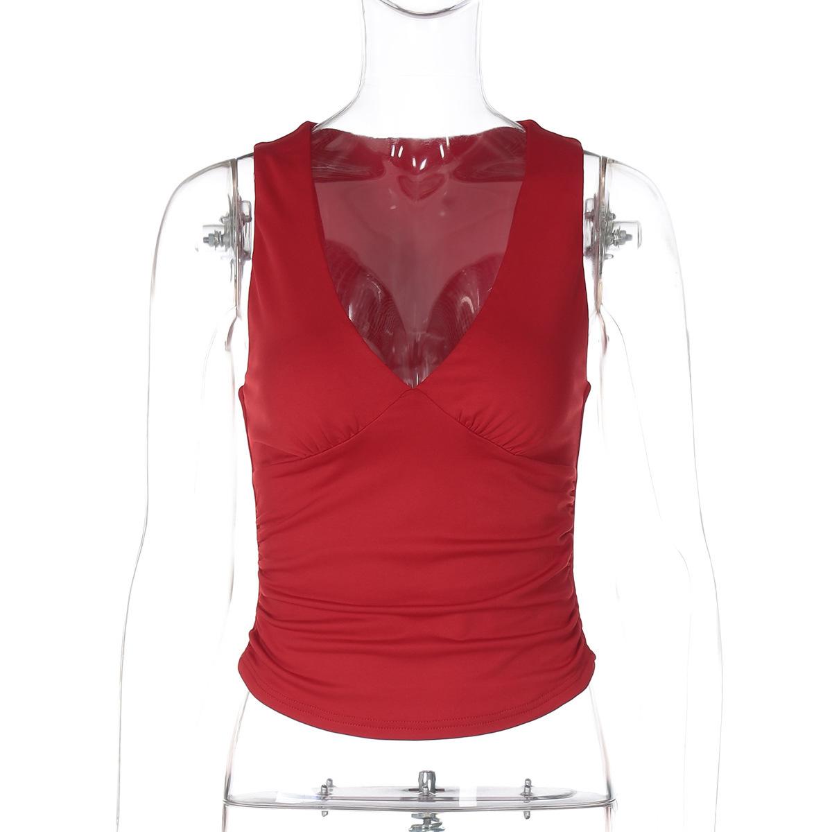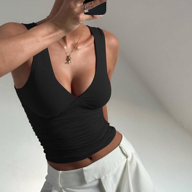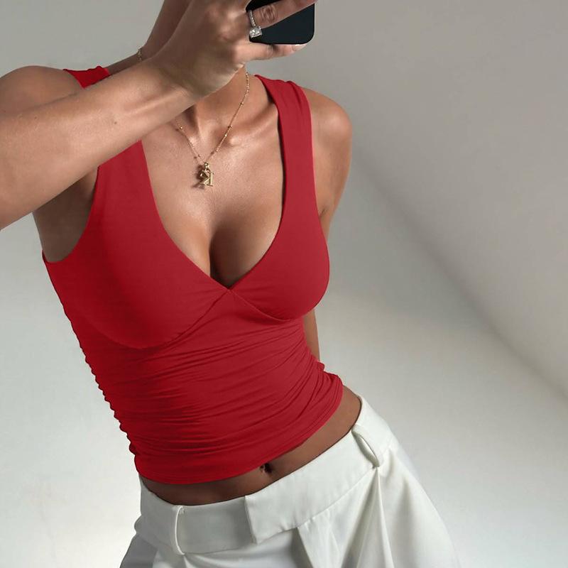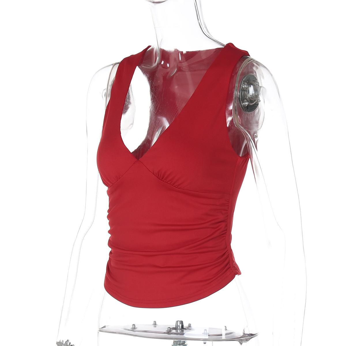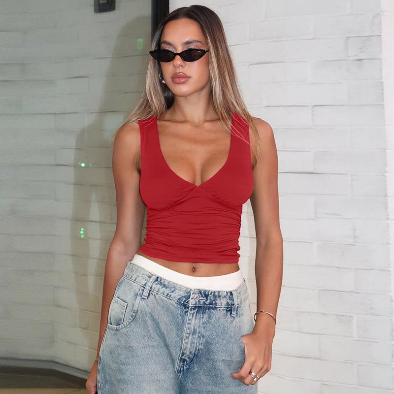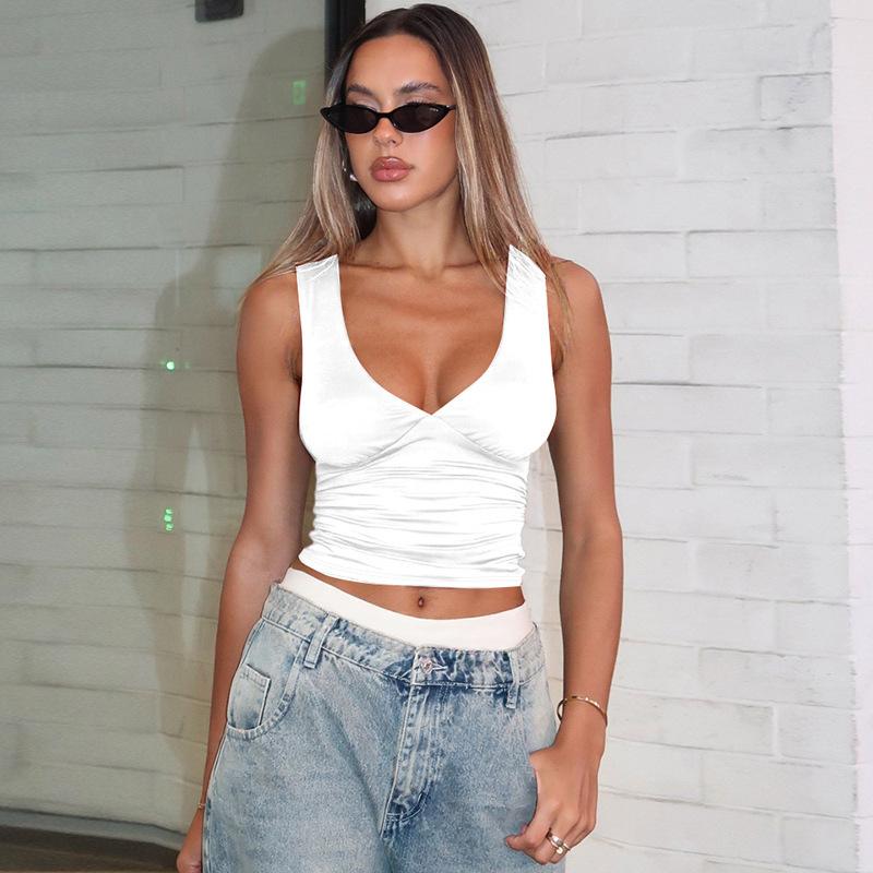 Amazon para mujer 2025 verano nueva moda callejera cuello en V ajustado plisado chica hot chaleco pequeño comercio exterior mayoreo