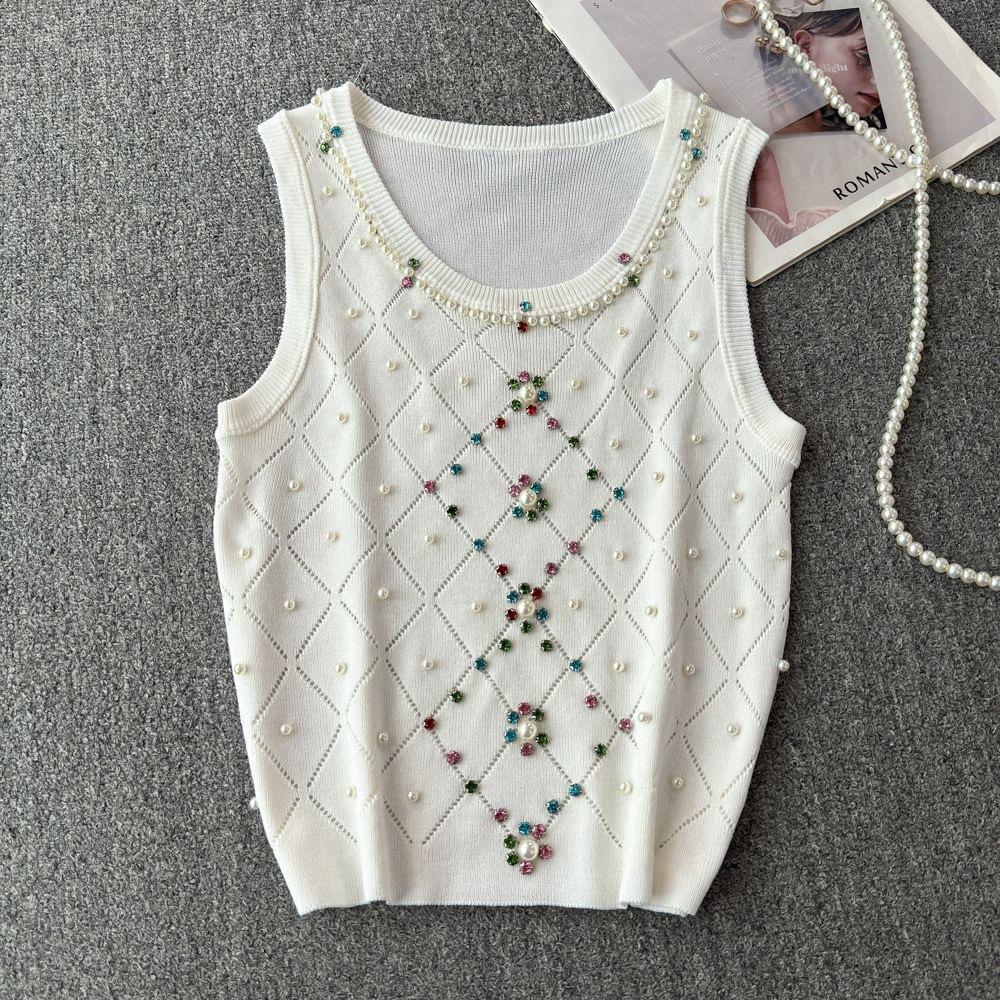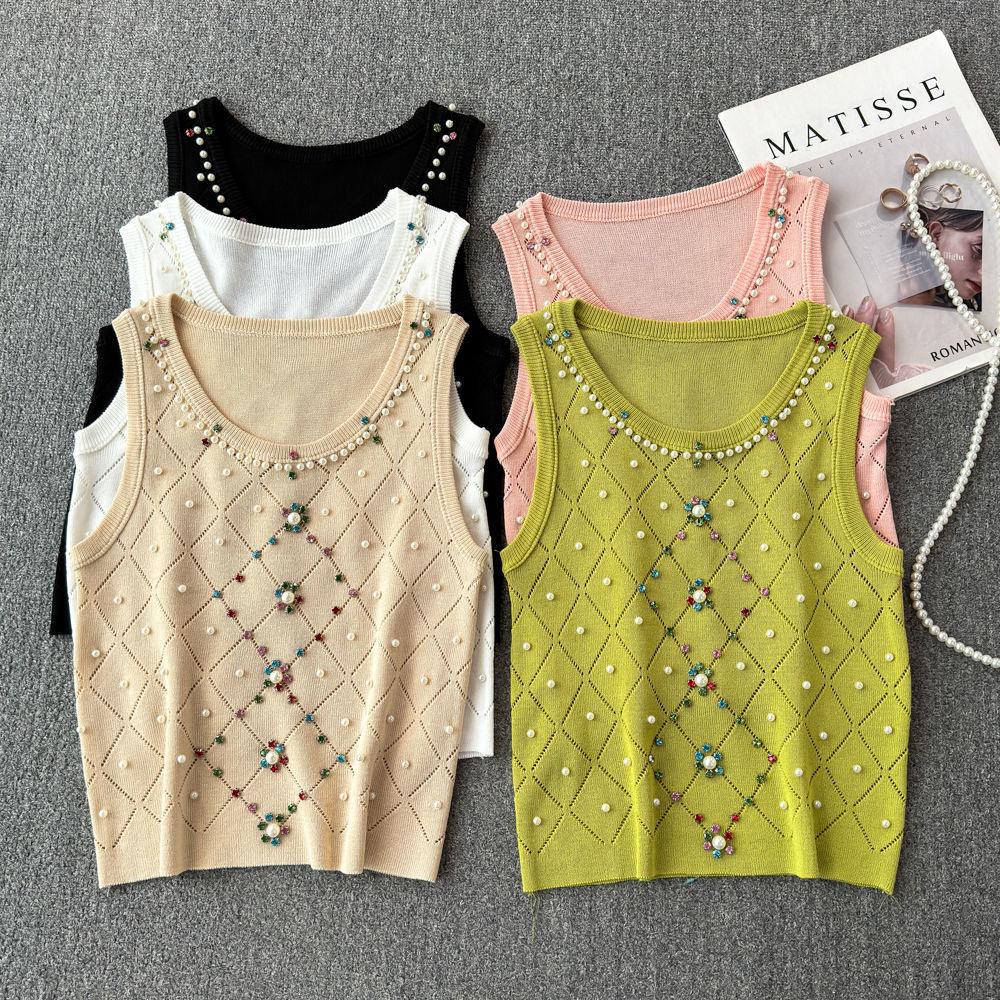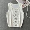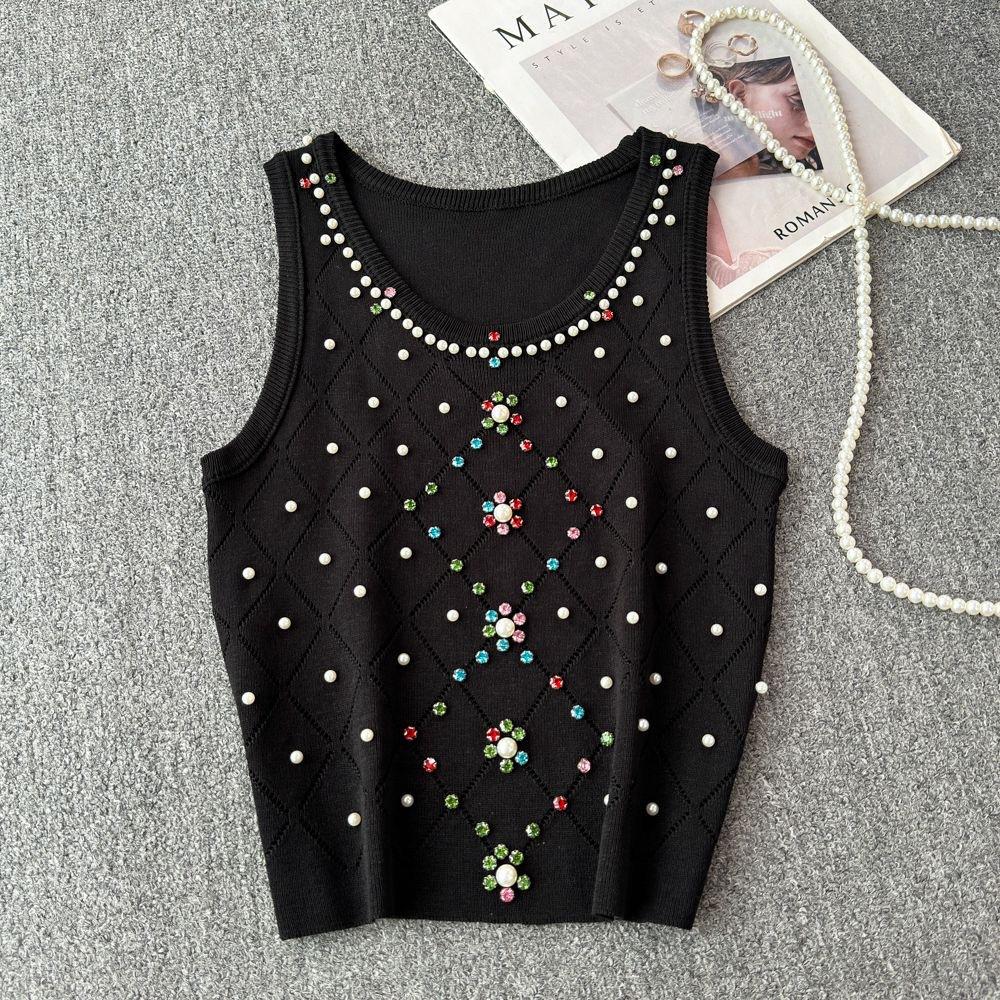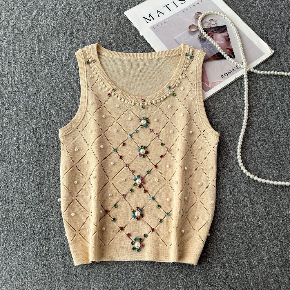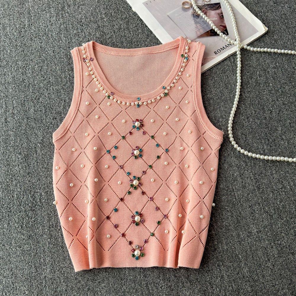 Camisola de Mujer 2023 Verano Nuevo Estilo Estilo Puro Lujuria Patrón Acolchado Diseño con Abalorios Sexy Top de Punto Descubriendo el Ombligo