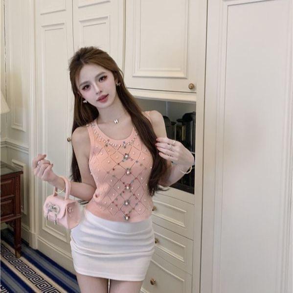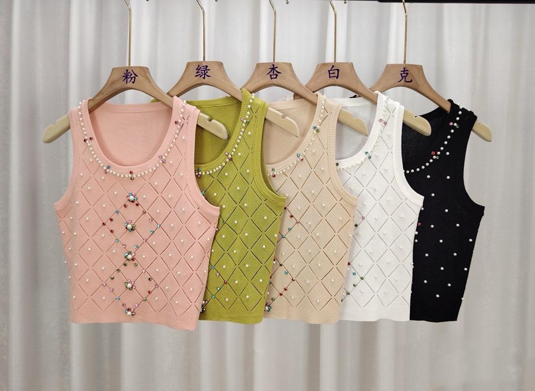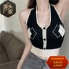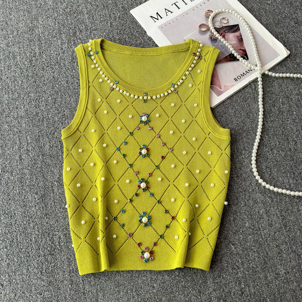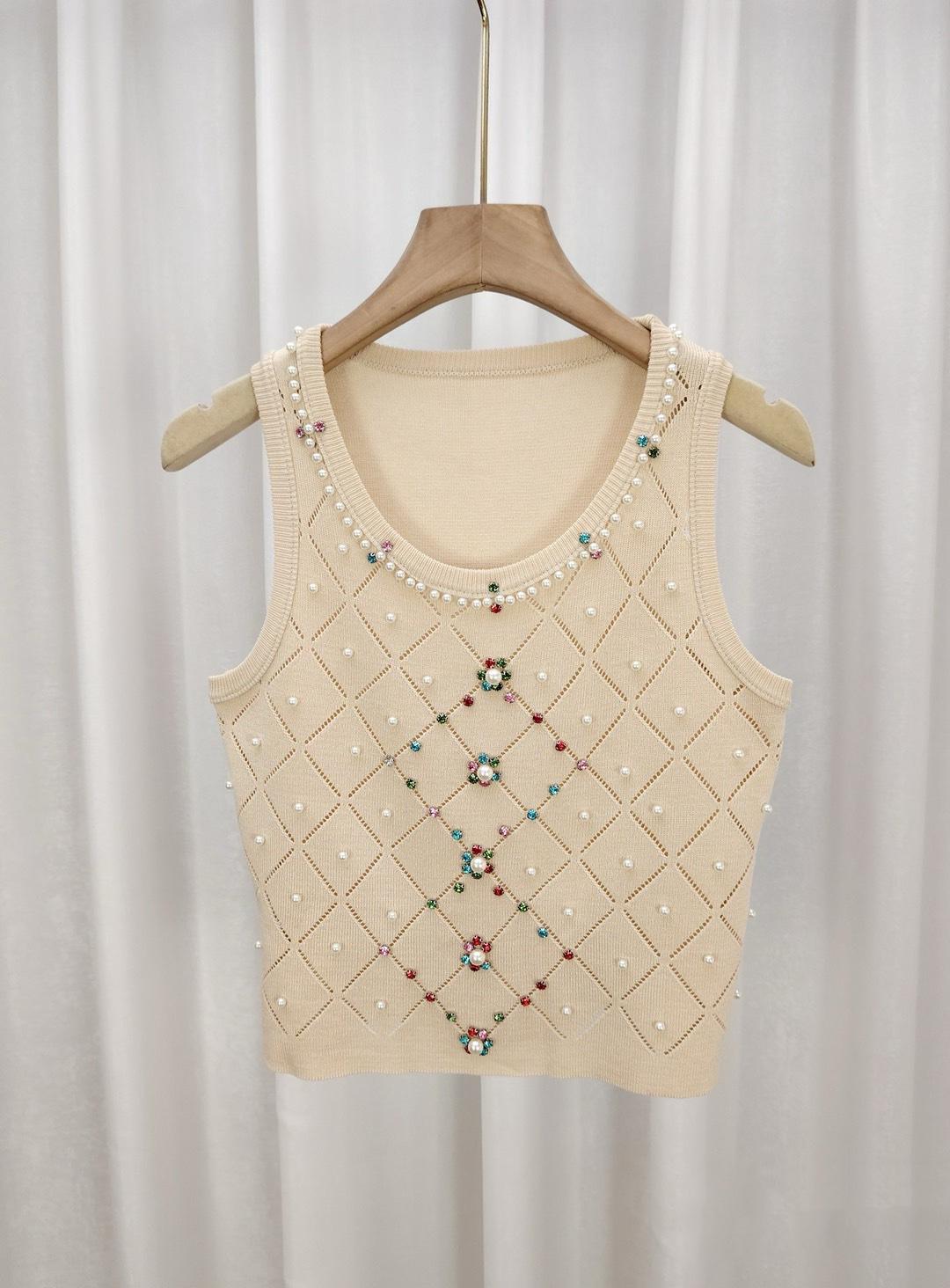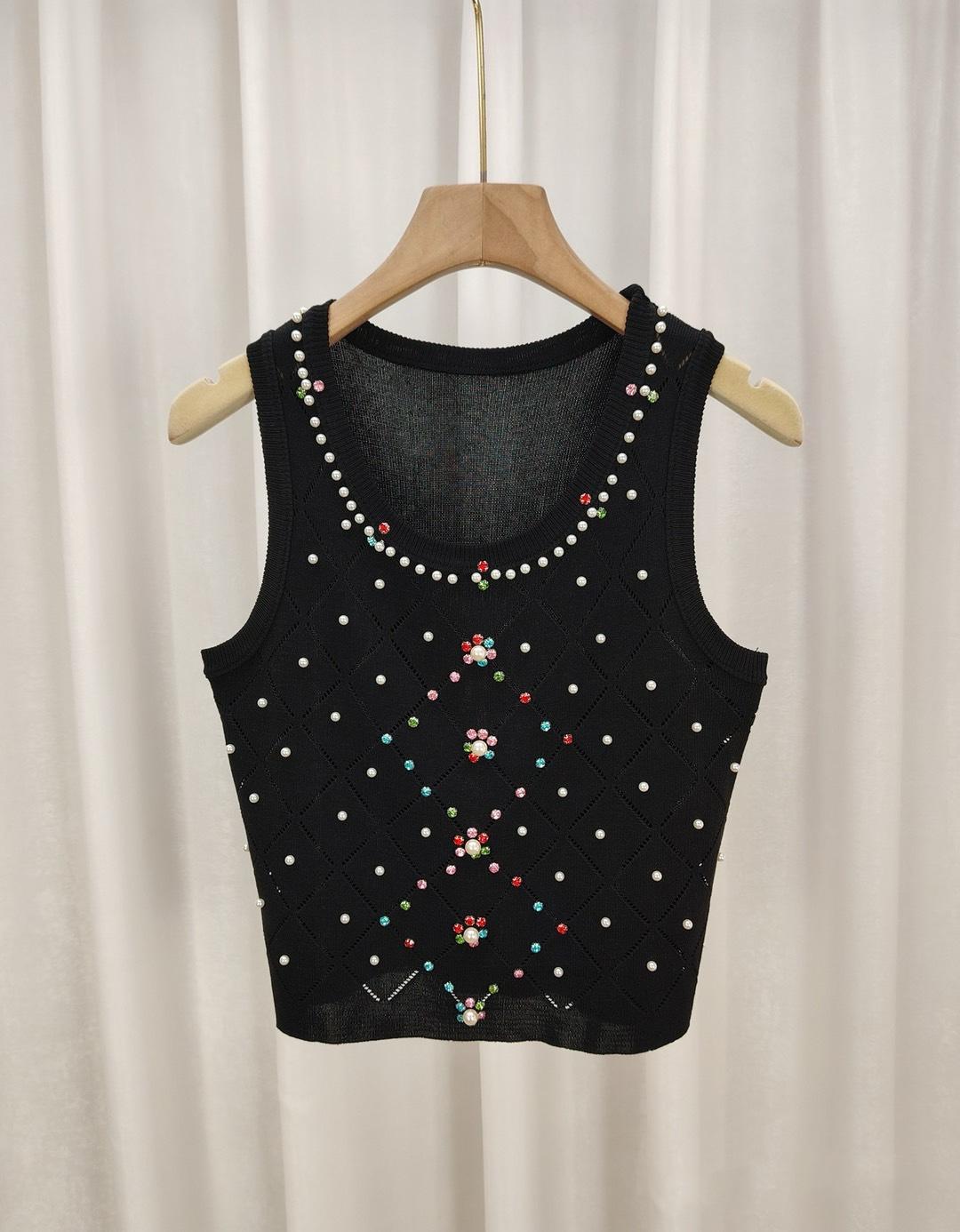 Camisola de Mujer 2023 Verano Nuevo Estilo Estilo Puro Lujuria Patrón Acolchado Diseño con Abalorios Sexy Top de Punto Descubriendo el Ombligo