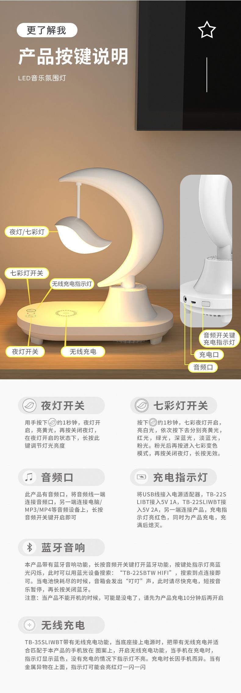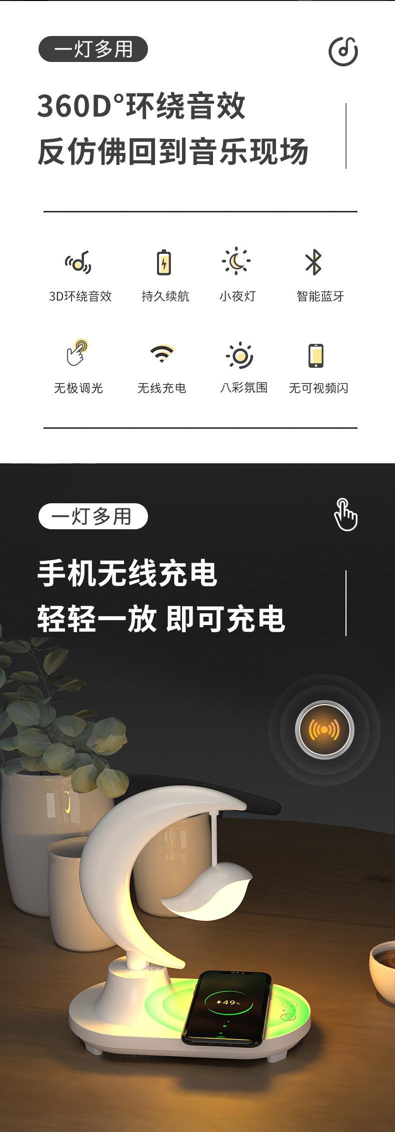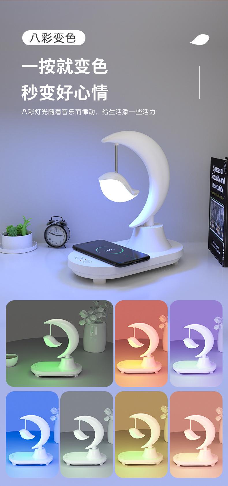 Características: batería incorporada, con función de altavoz Bluetooth, 8 colores de efectos de iluminación para elegir, luz nocturna blanca y amarilla conmutable, con función de carga inalámbrica de teléfono móvil.