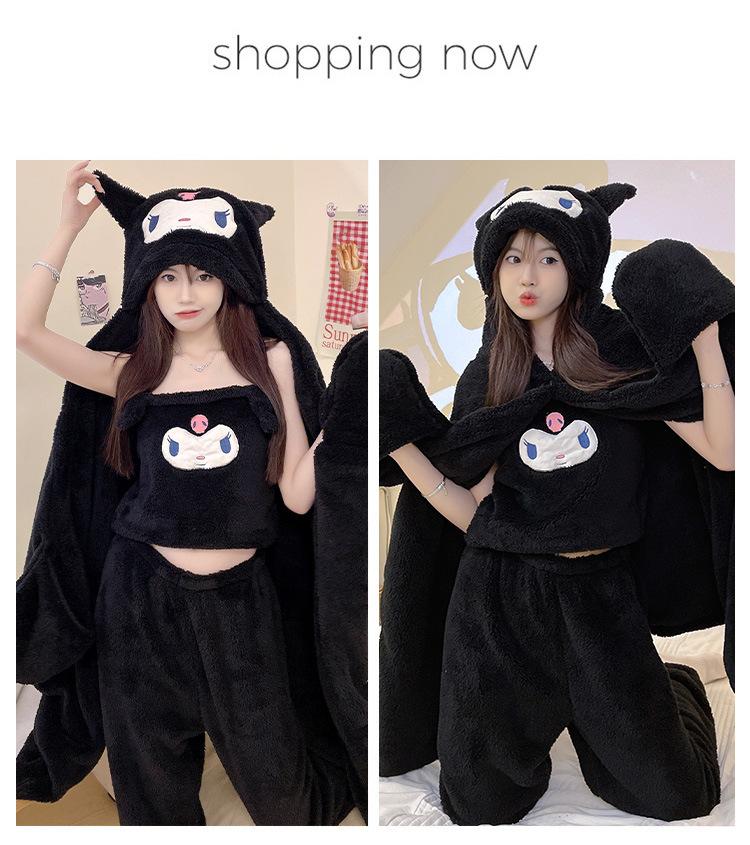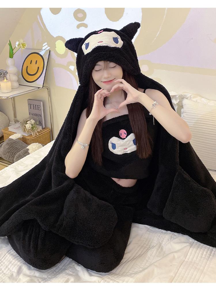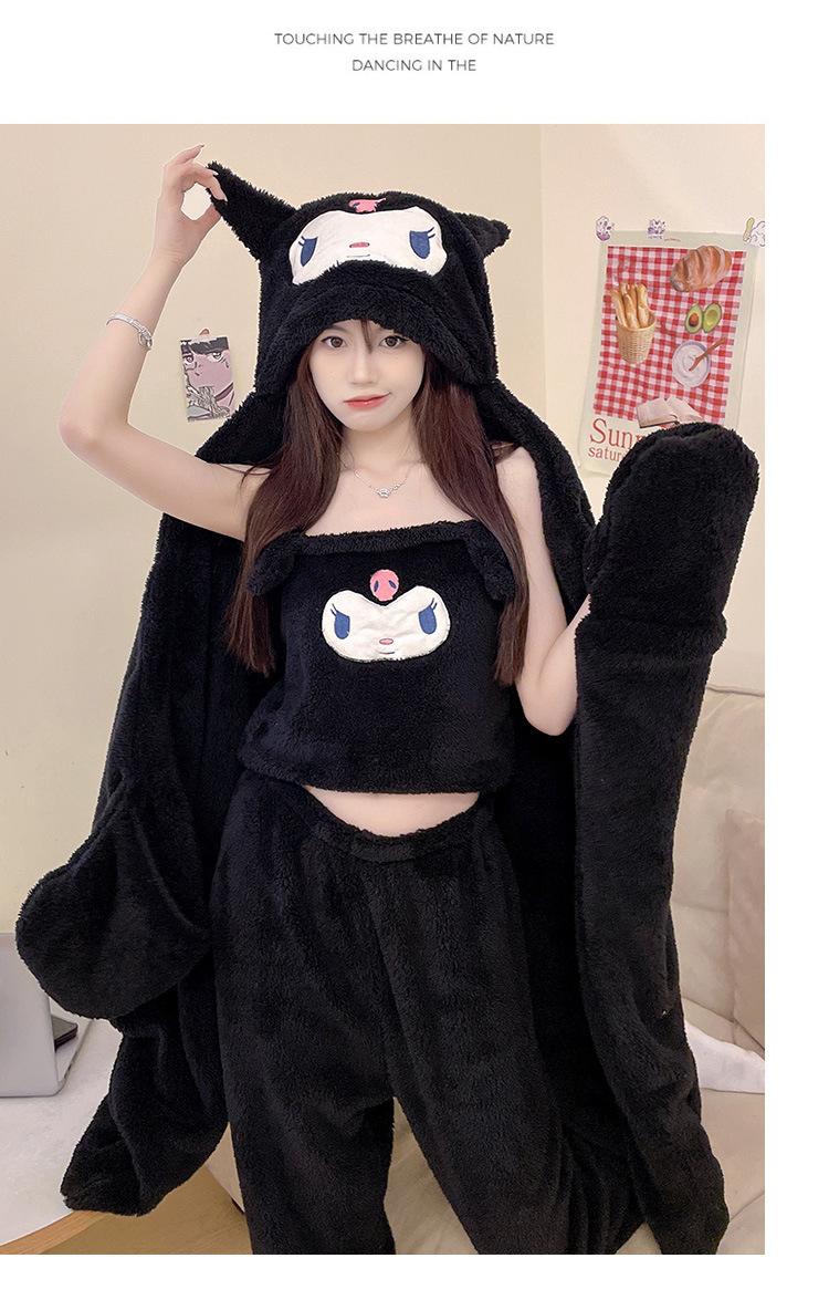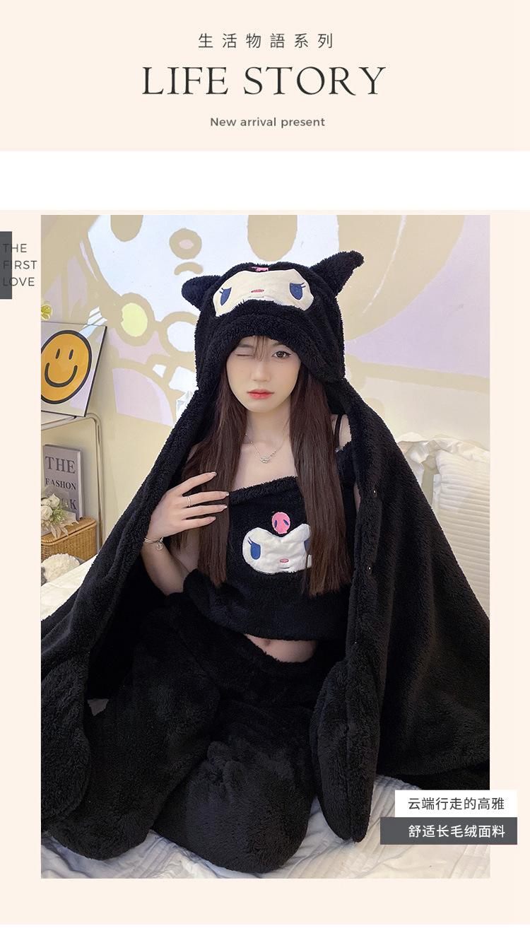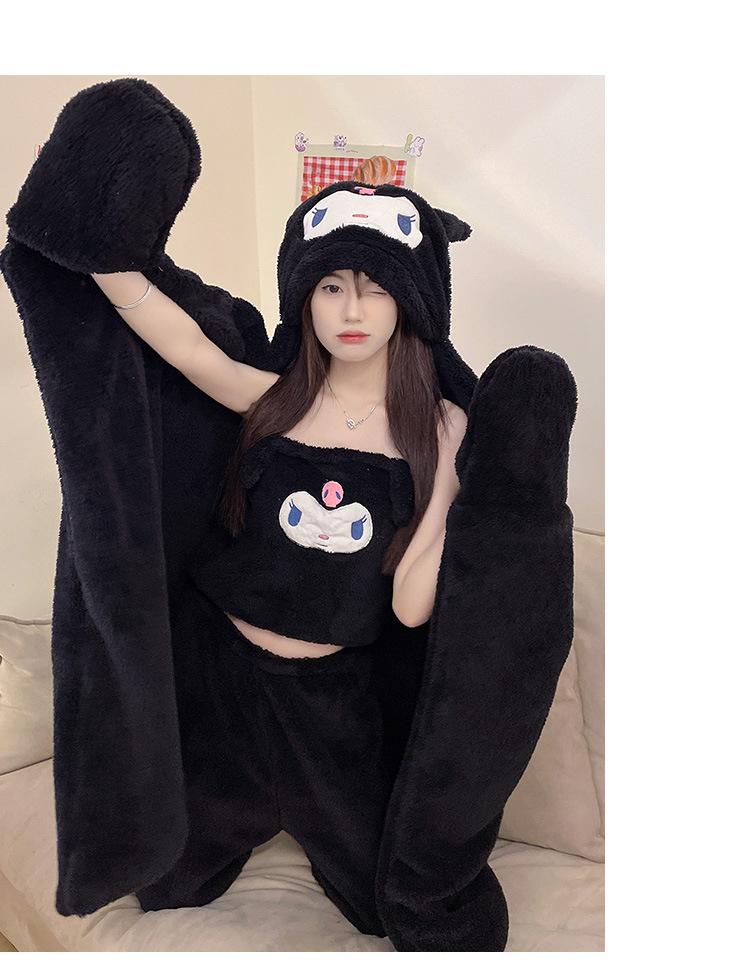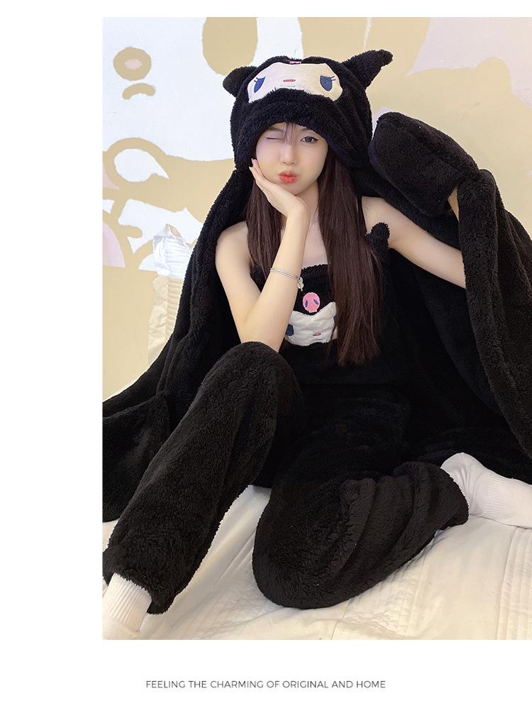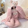 Pijama de Invierno de Vellón Coral de Nueva Llegada para Mujer, Felpa con Capucha, Bata Perezosa, Pantalones con Tirantes, Chal, Conjunto de Tres Piezas de Dibujos Animados