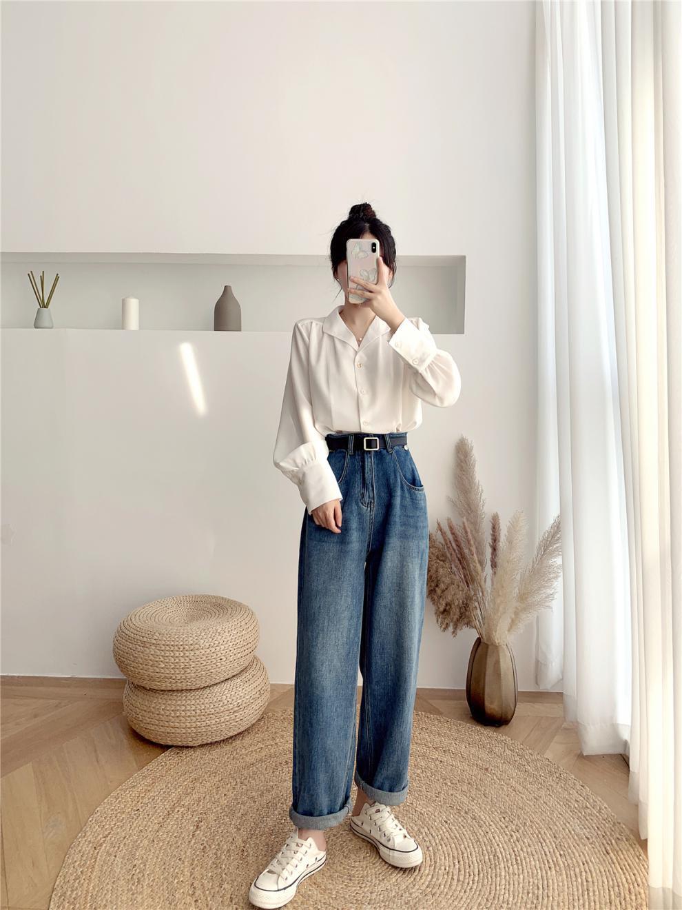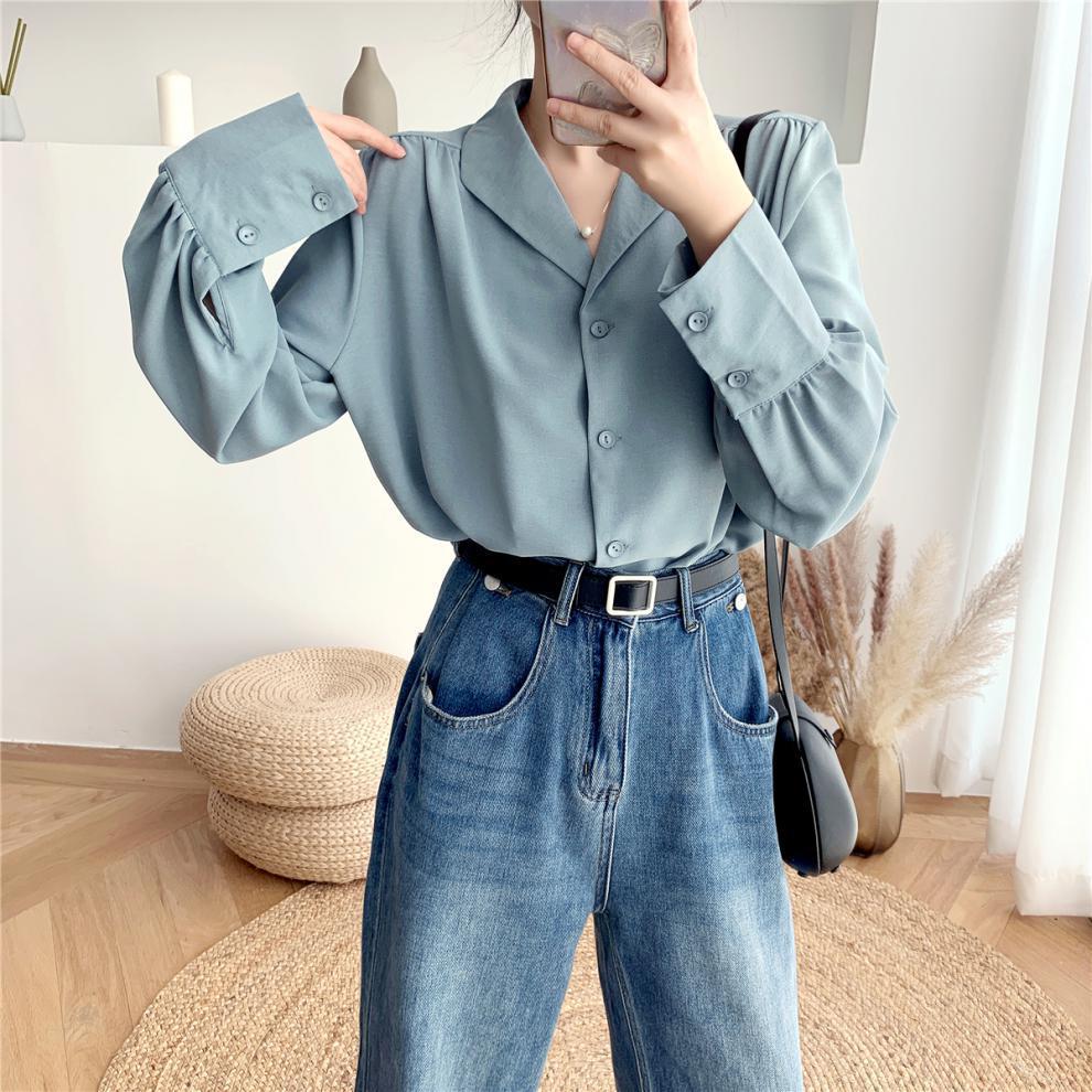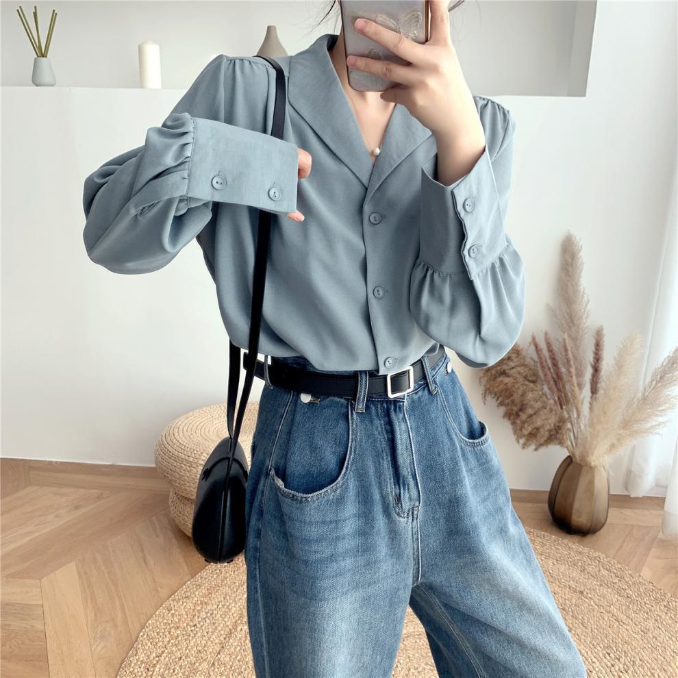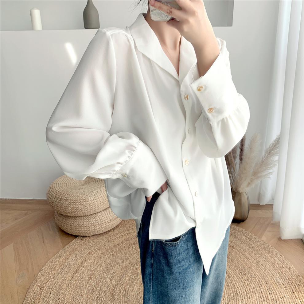 Compra Foto real ropa de otoño 2024 estilo retro de Hong Kong traje profesional coreano cuello solapa manga larga camisa solapa top blanco de mujer marea al por mayor en Joom.pro