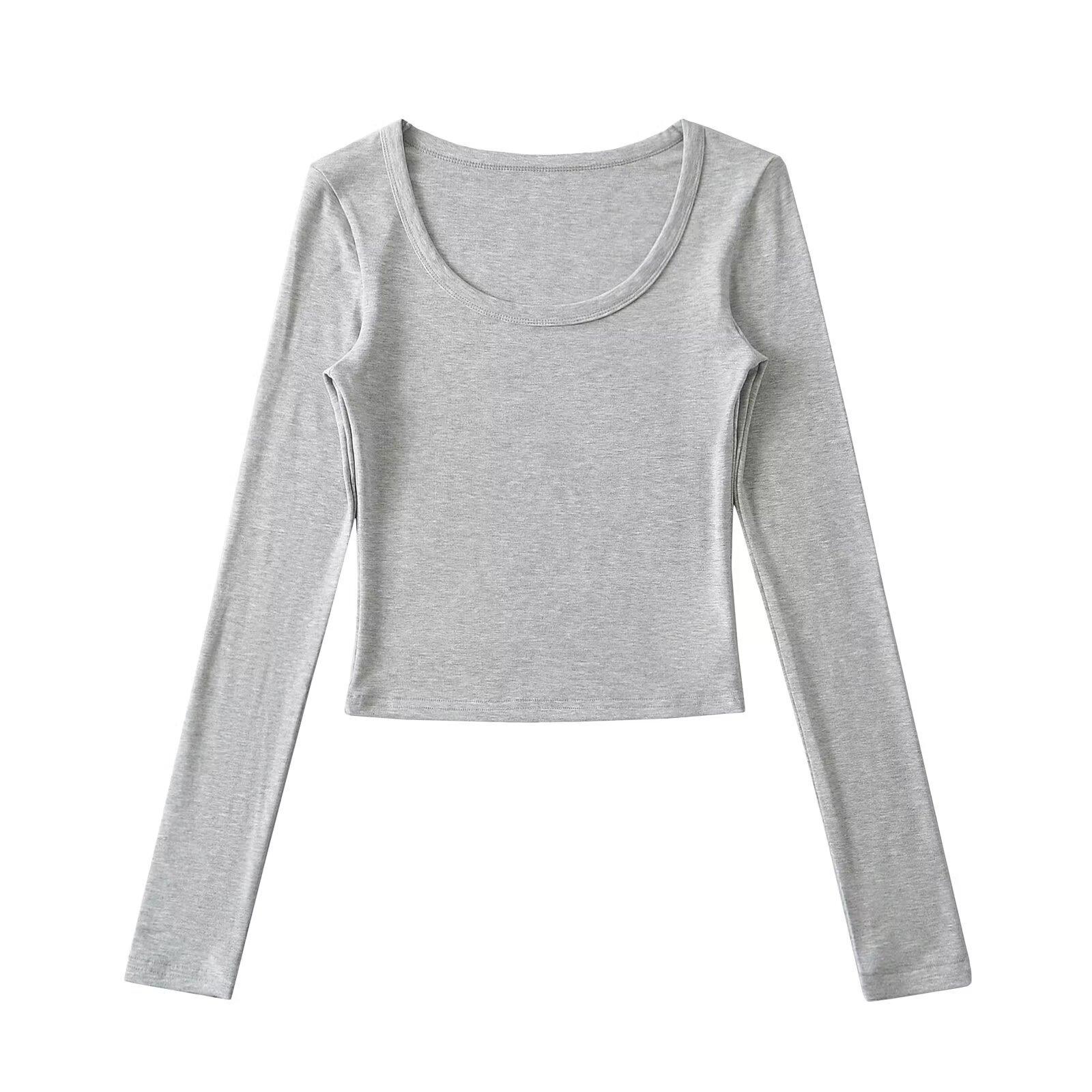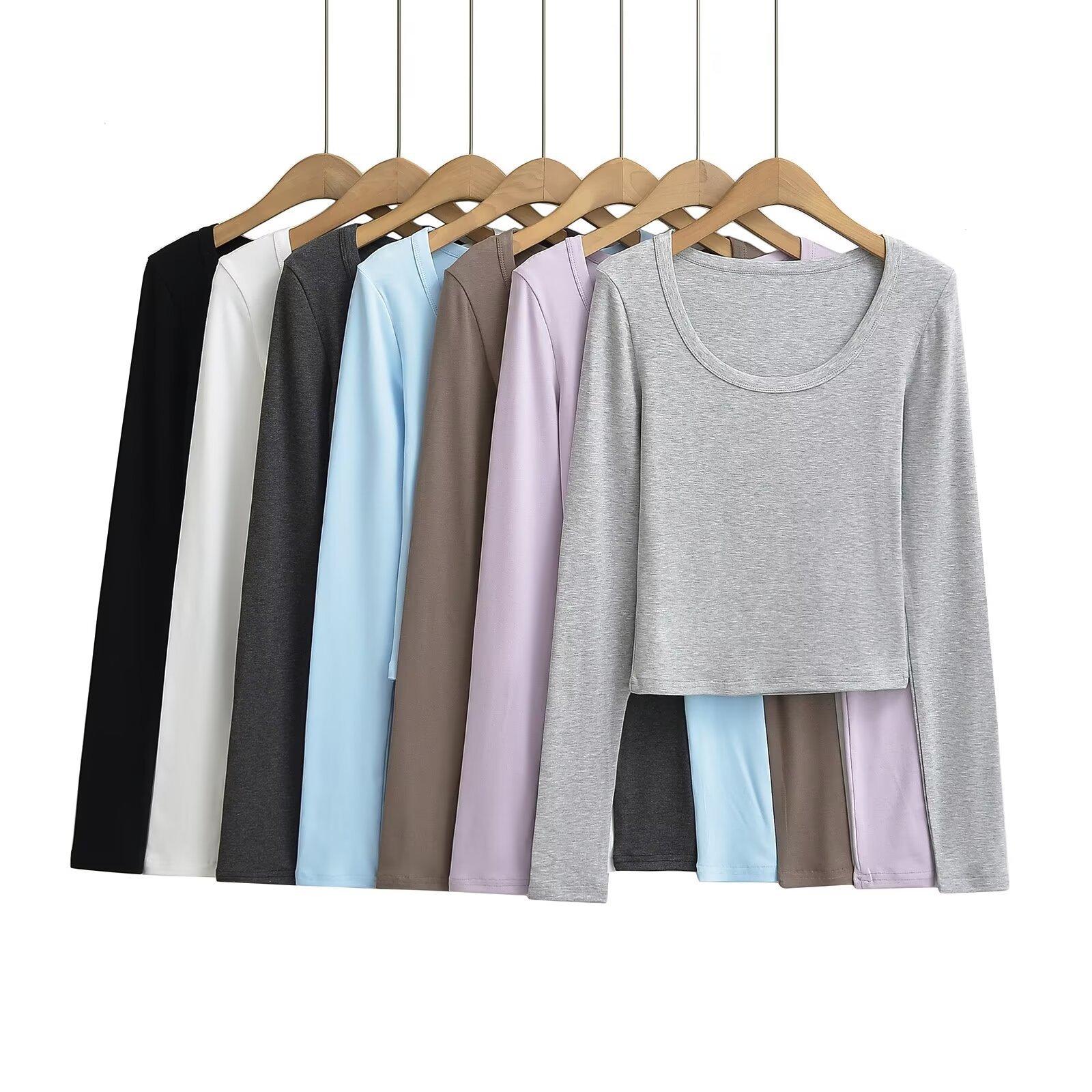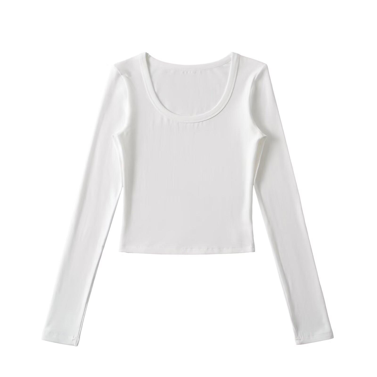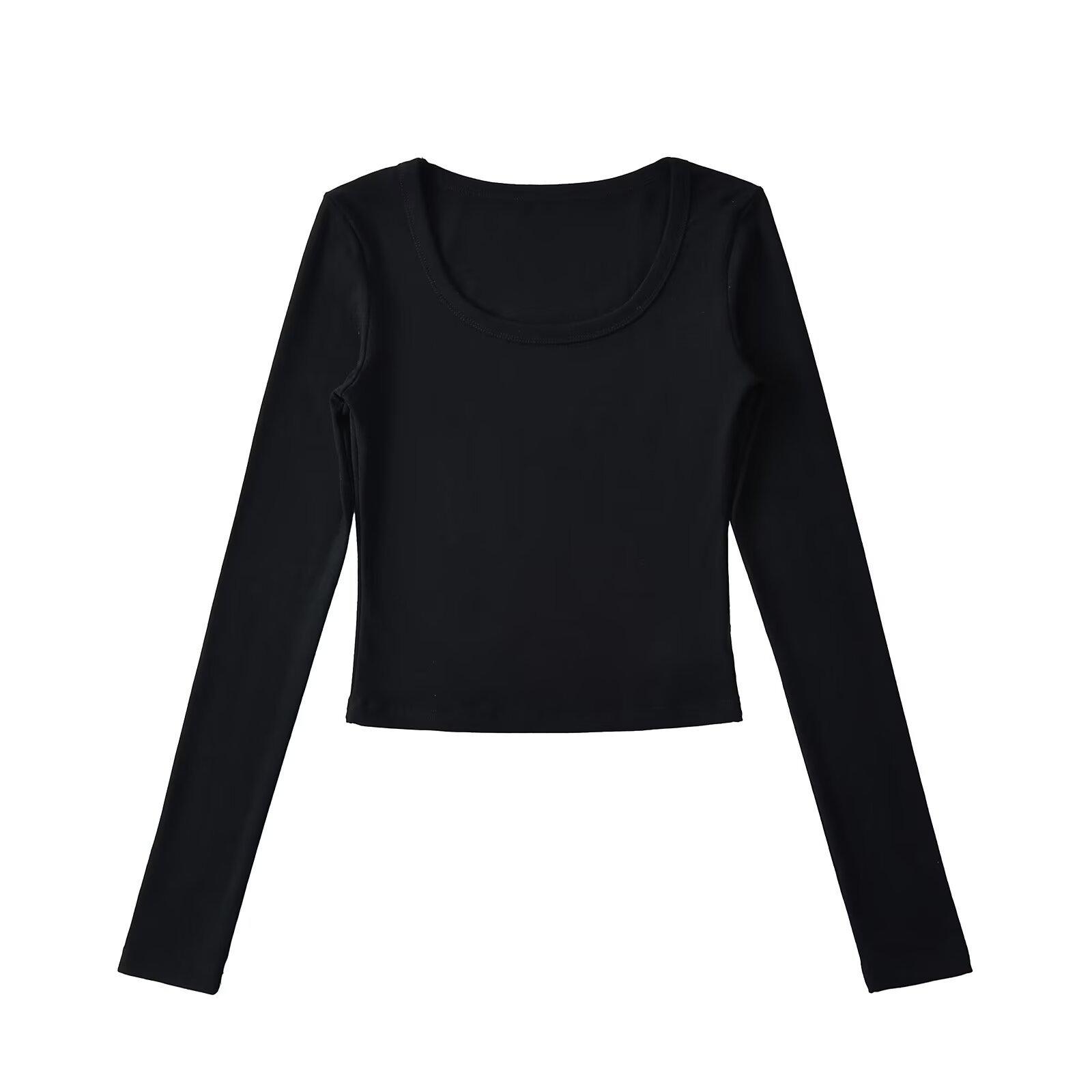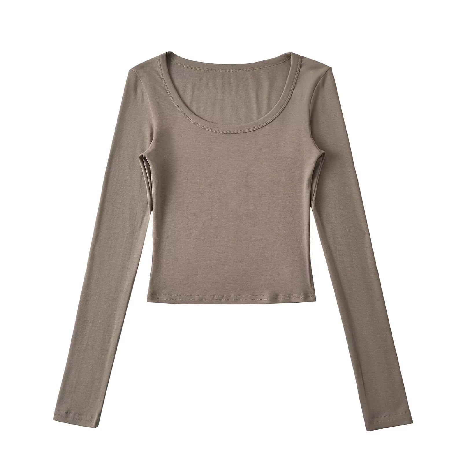 Camiseta de otoño e invierno con cuello redondo grande, ajustada, de manga corta, elástica, estilo europeo y americano, con bolsa de color en el pecho y placa ligera, sencilla para mujer