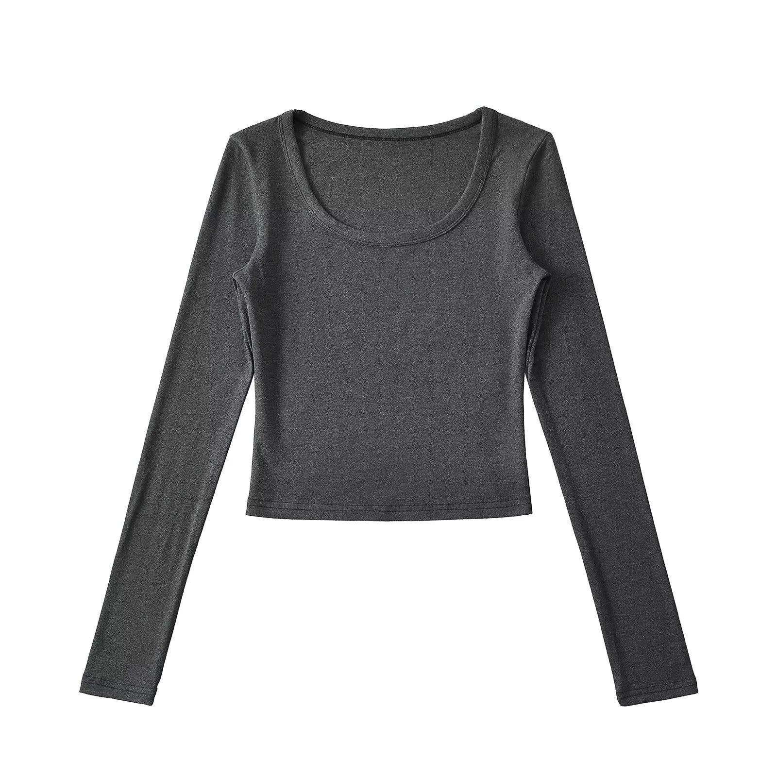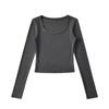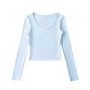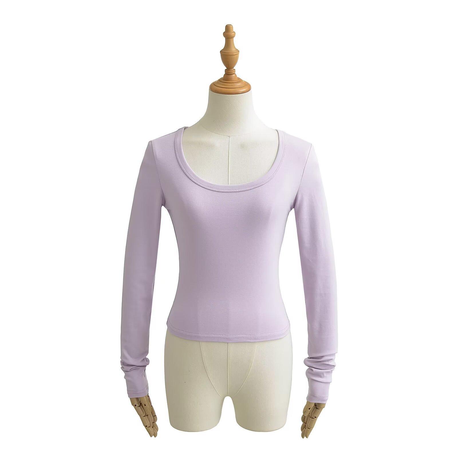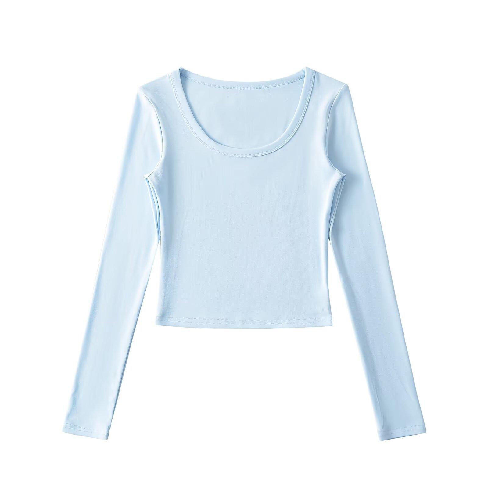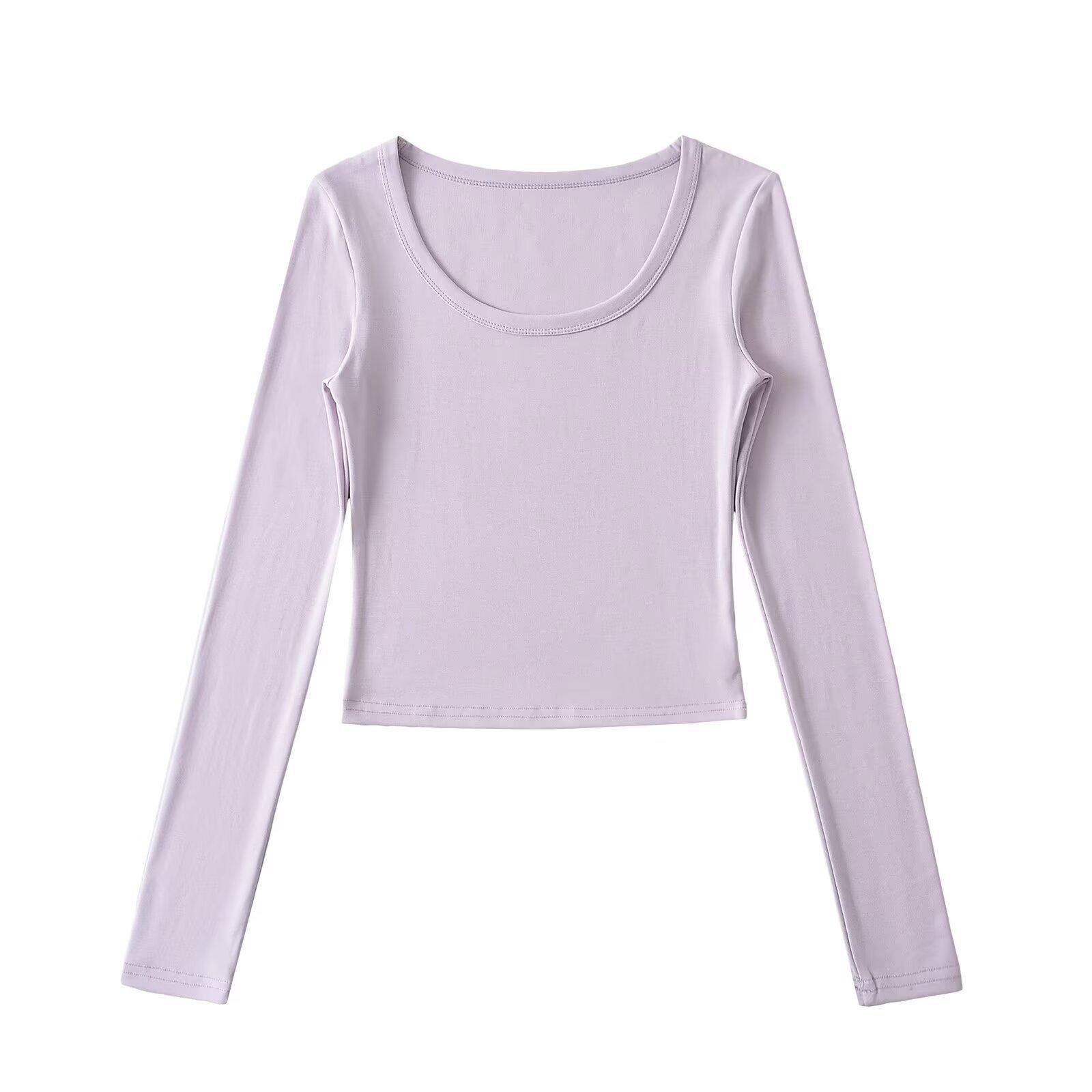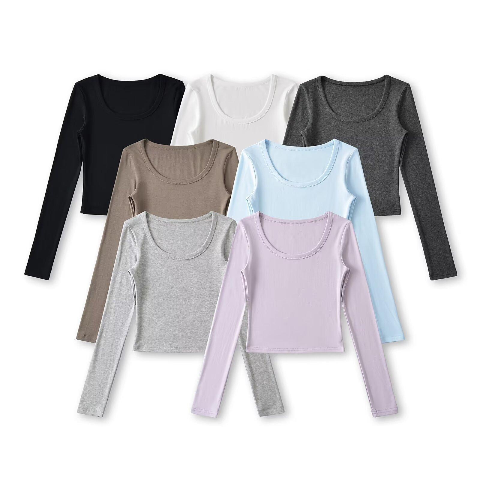 Camiseta de otoño e invierno con cuello redondo grande, ajustada, de manga corta, elástica, estilo europeo y americano, con bolsa de color en el pecho y placa ligera, sencilla para mujer