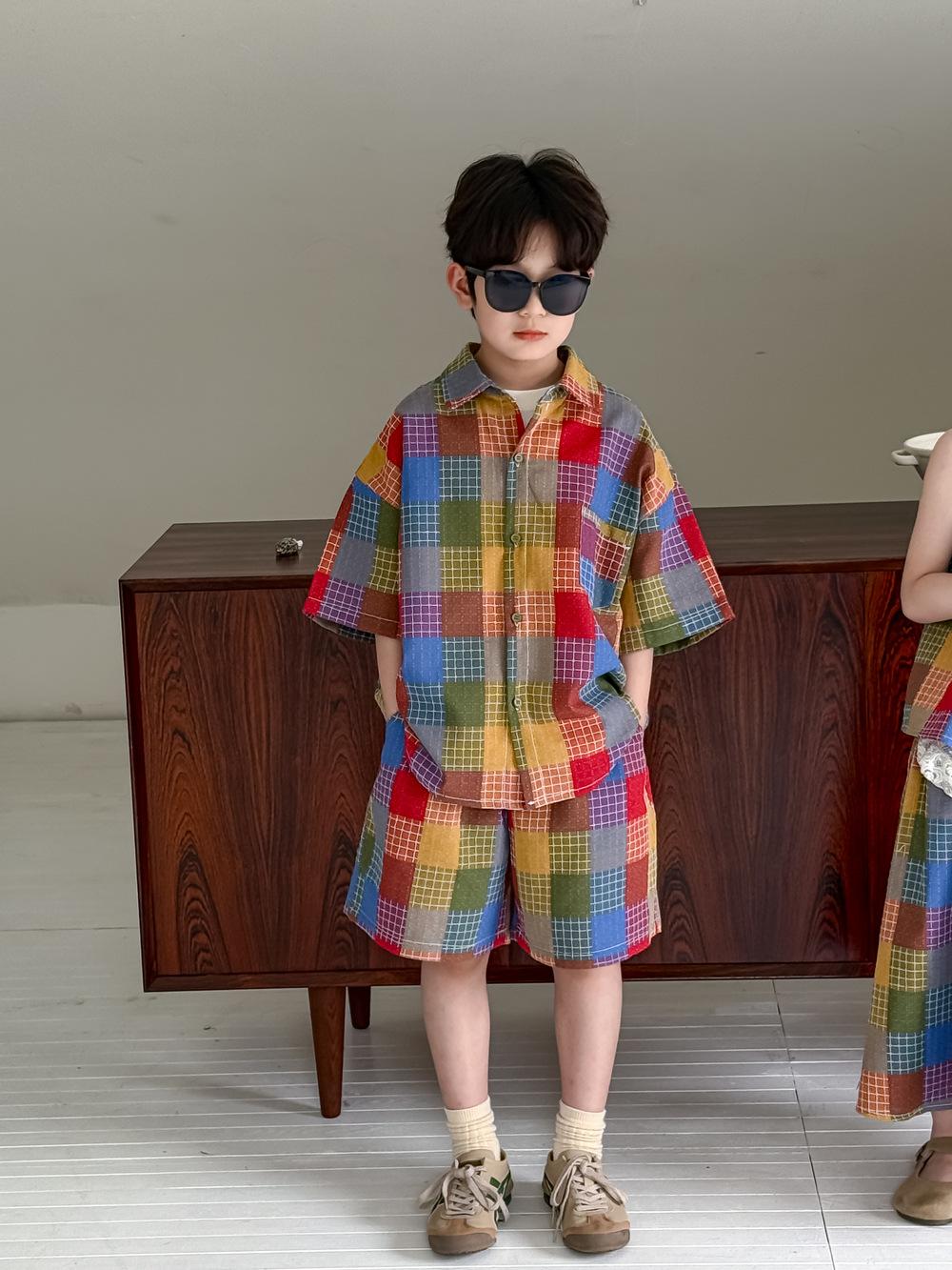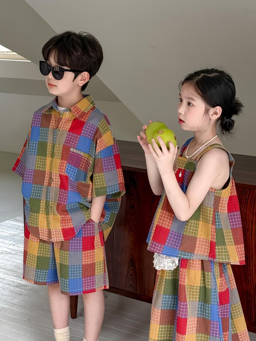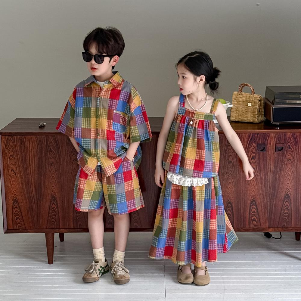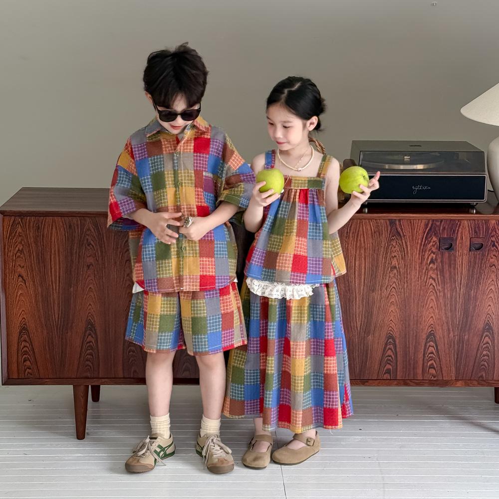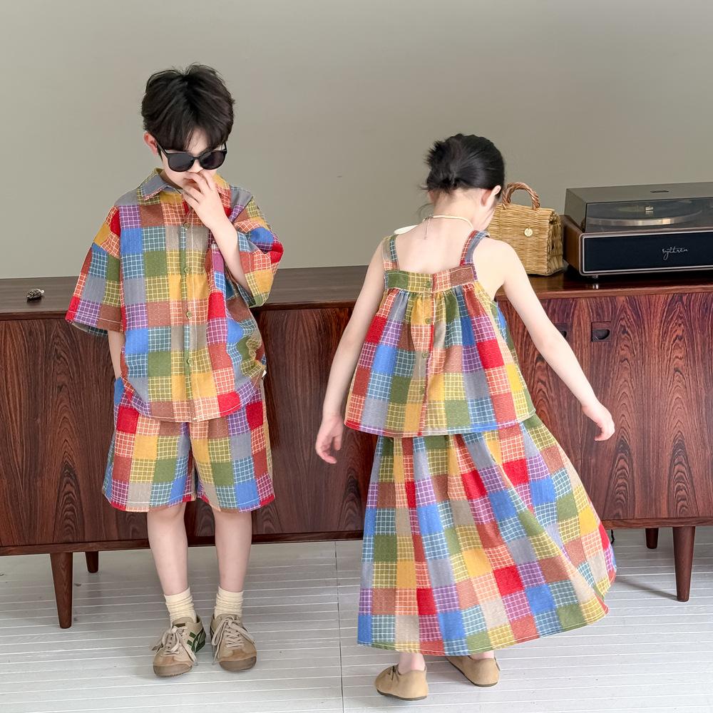 Traje para niños 2025 Verano Niños y Niñas Coreano Color Cuadros Camisa Shorts Dos Piezas Traje de Tirantes para Niños