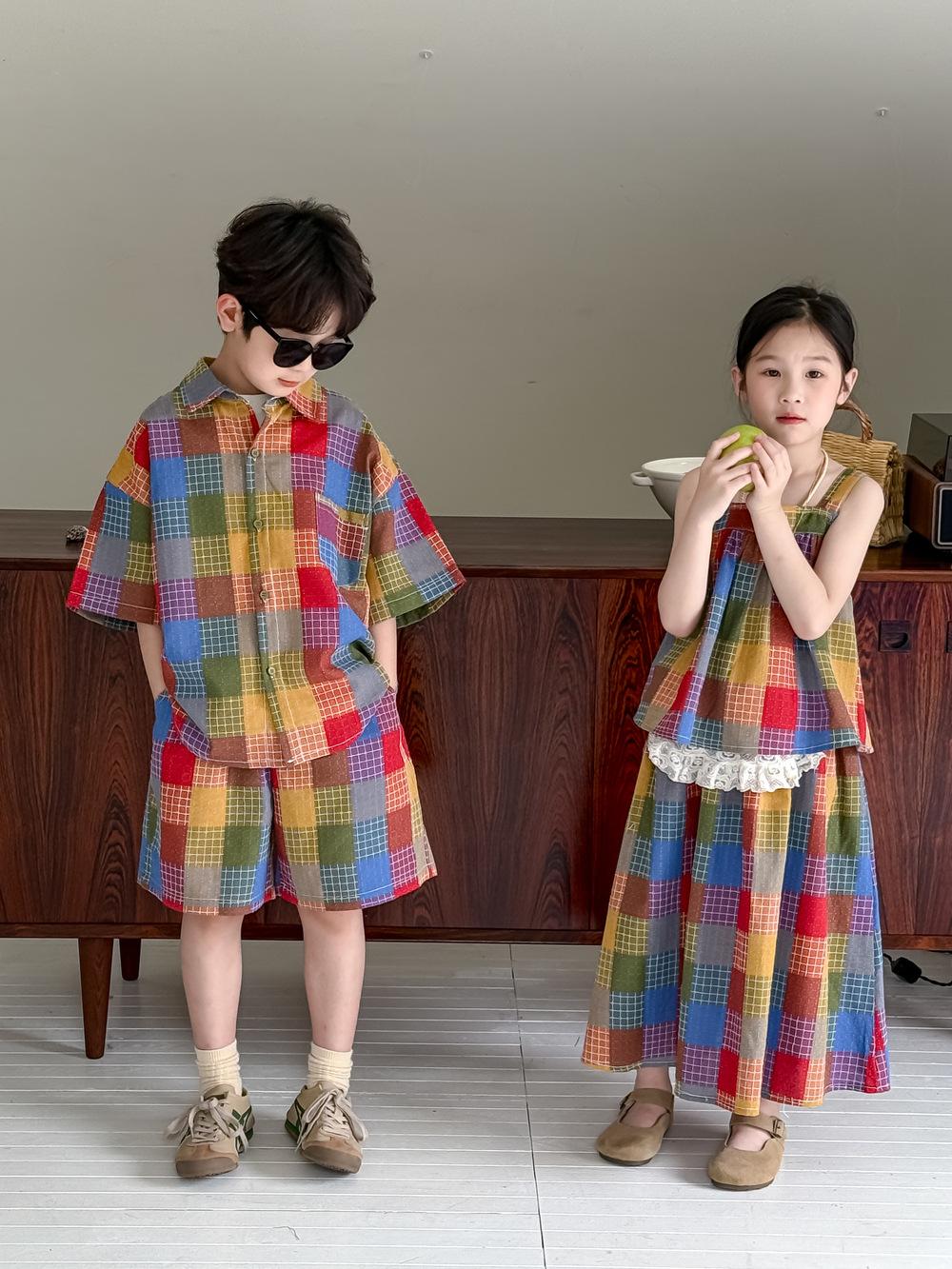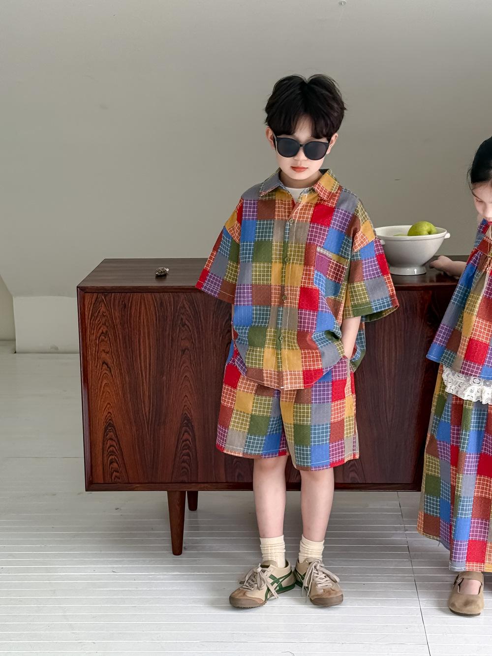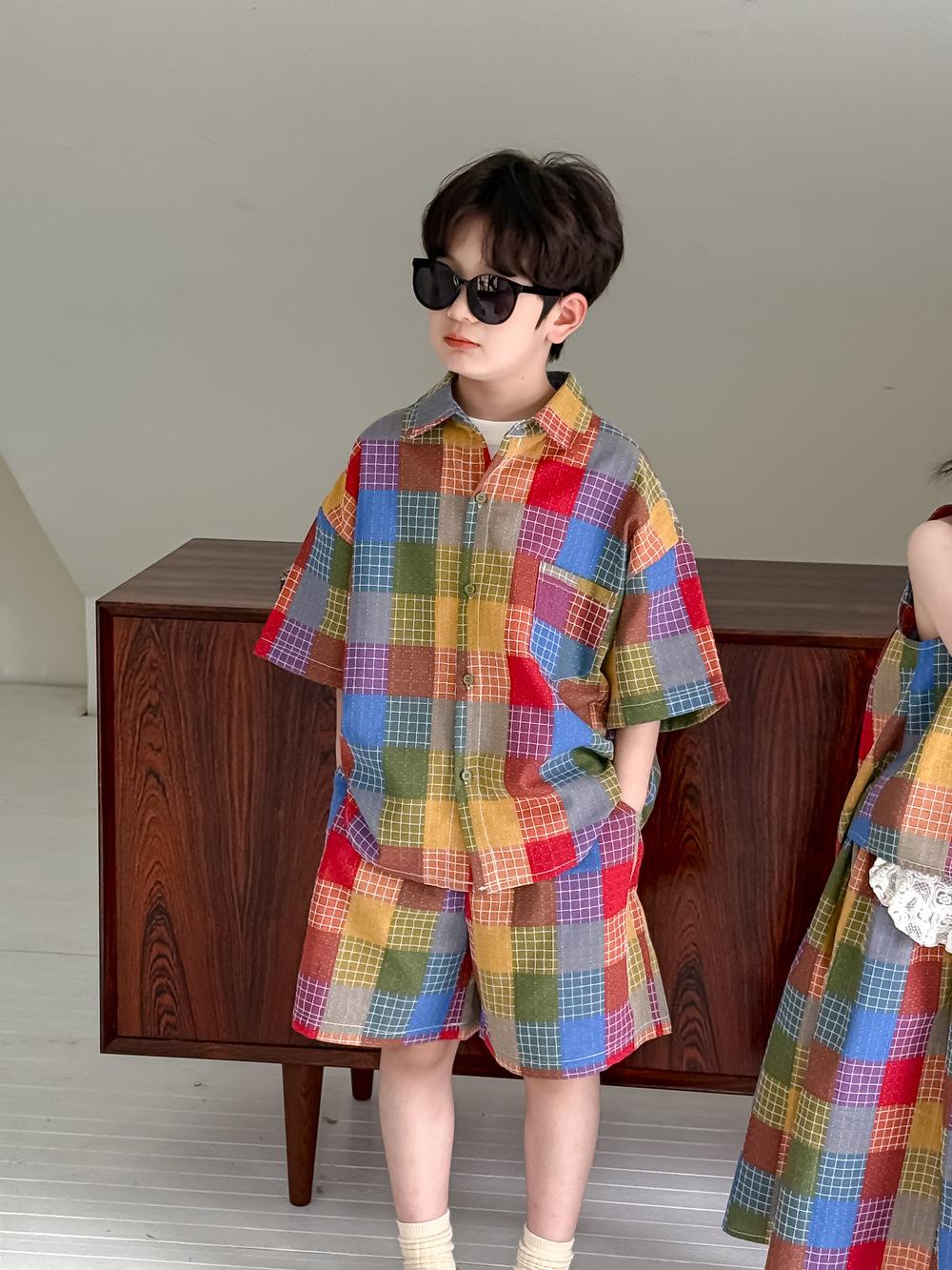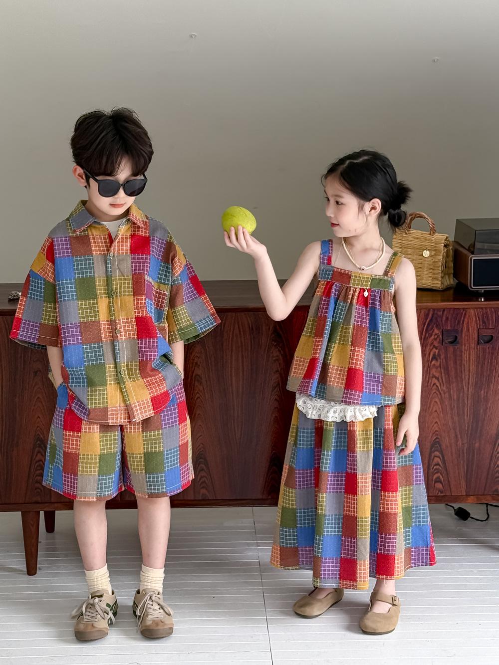 Traje para niños 2025 Verano Niños y Niñas Coreano Color Cuadros Camisa Shorts Dos Piezas Traje de Tirantes para Niños