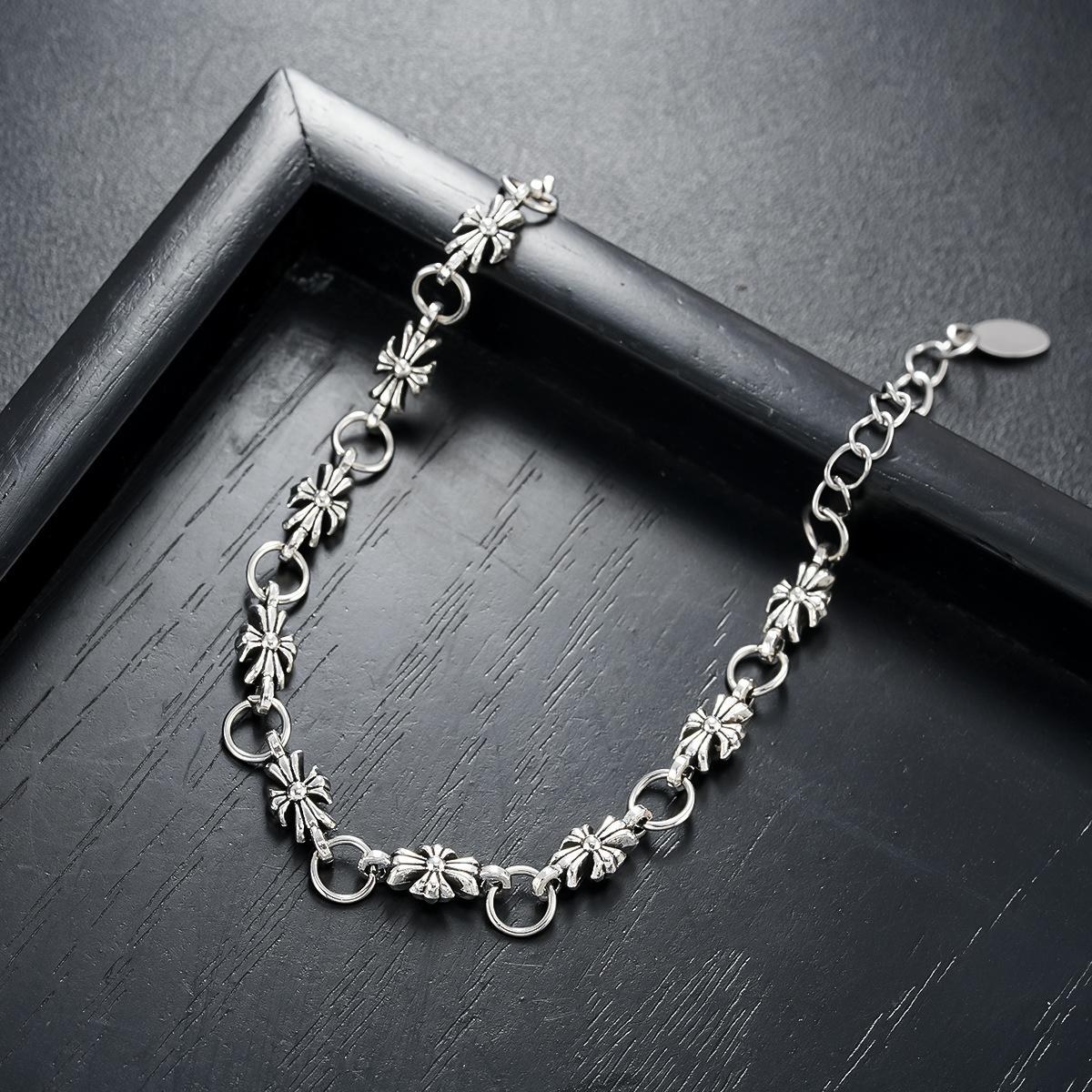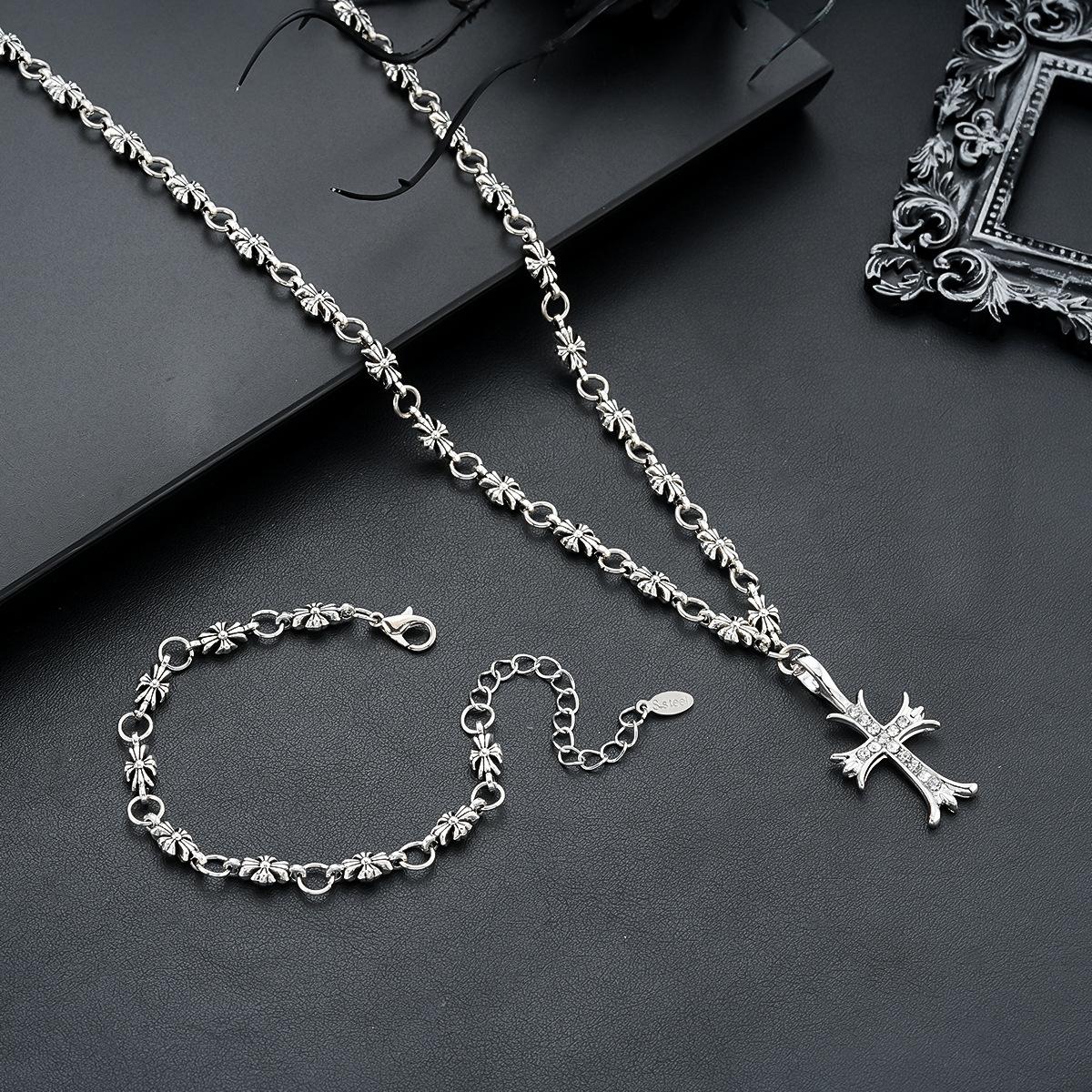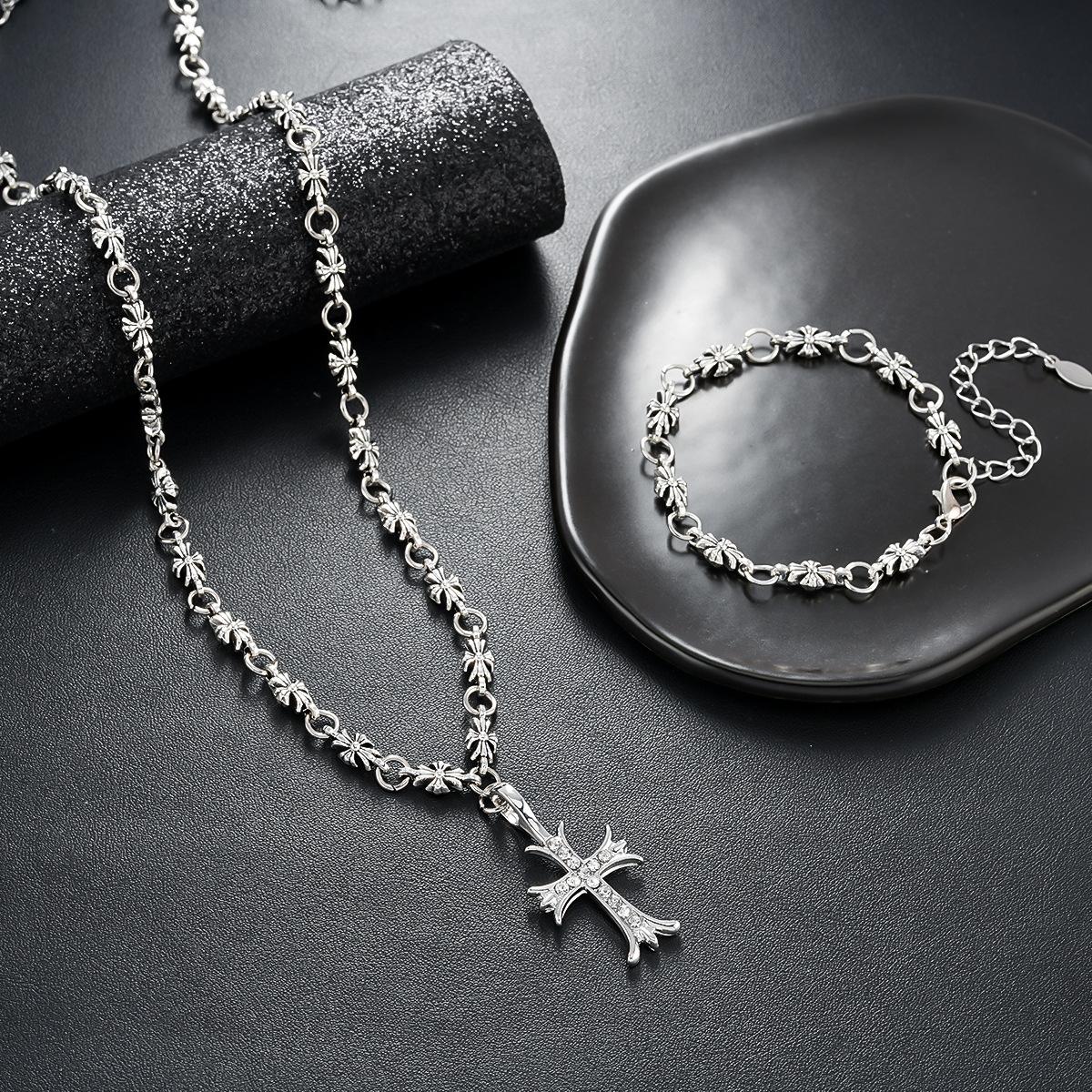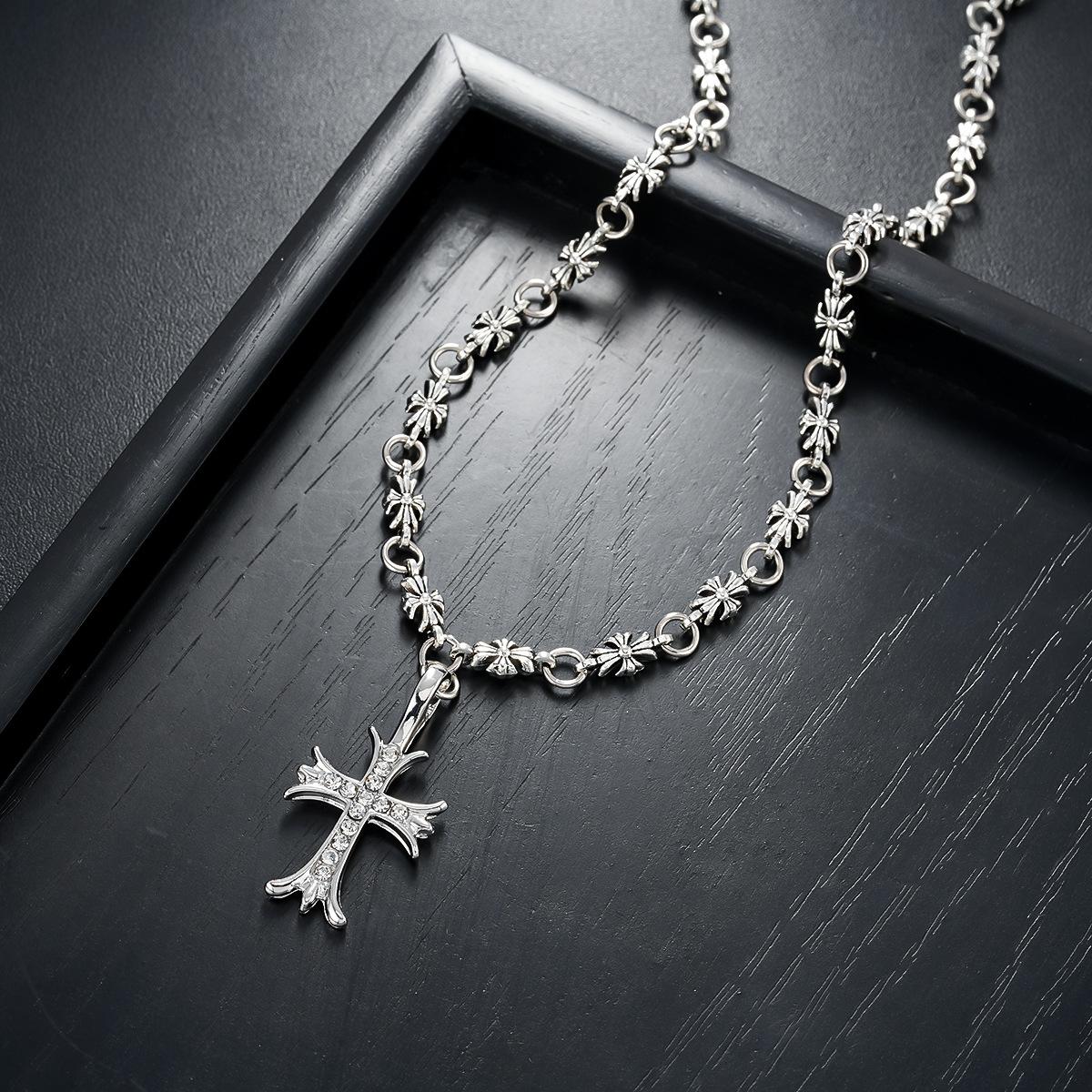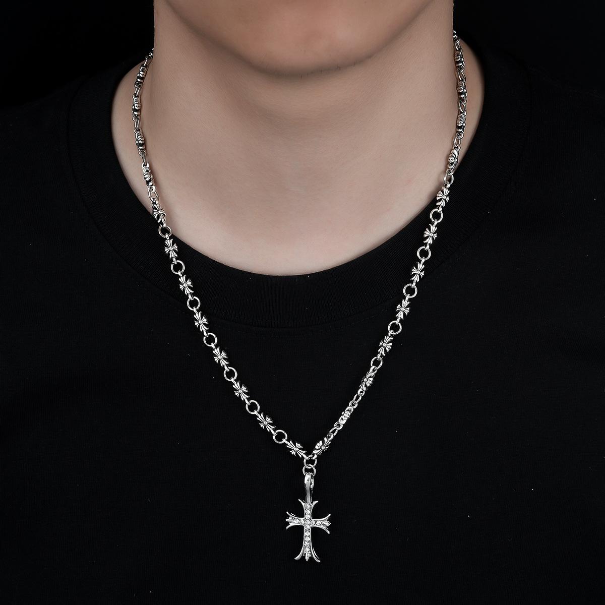Pulsera Collar Cruz de Oro Blanco Diamante para Hombres y Mujeres, Colgante Retro de Plata Tailandesa Moderno y Versátil, Venta al por Mayor de Joyería de Estilo Europeo