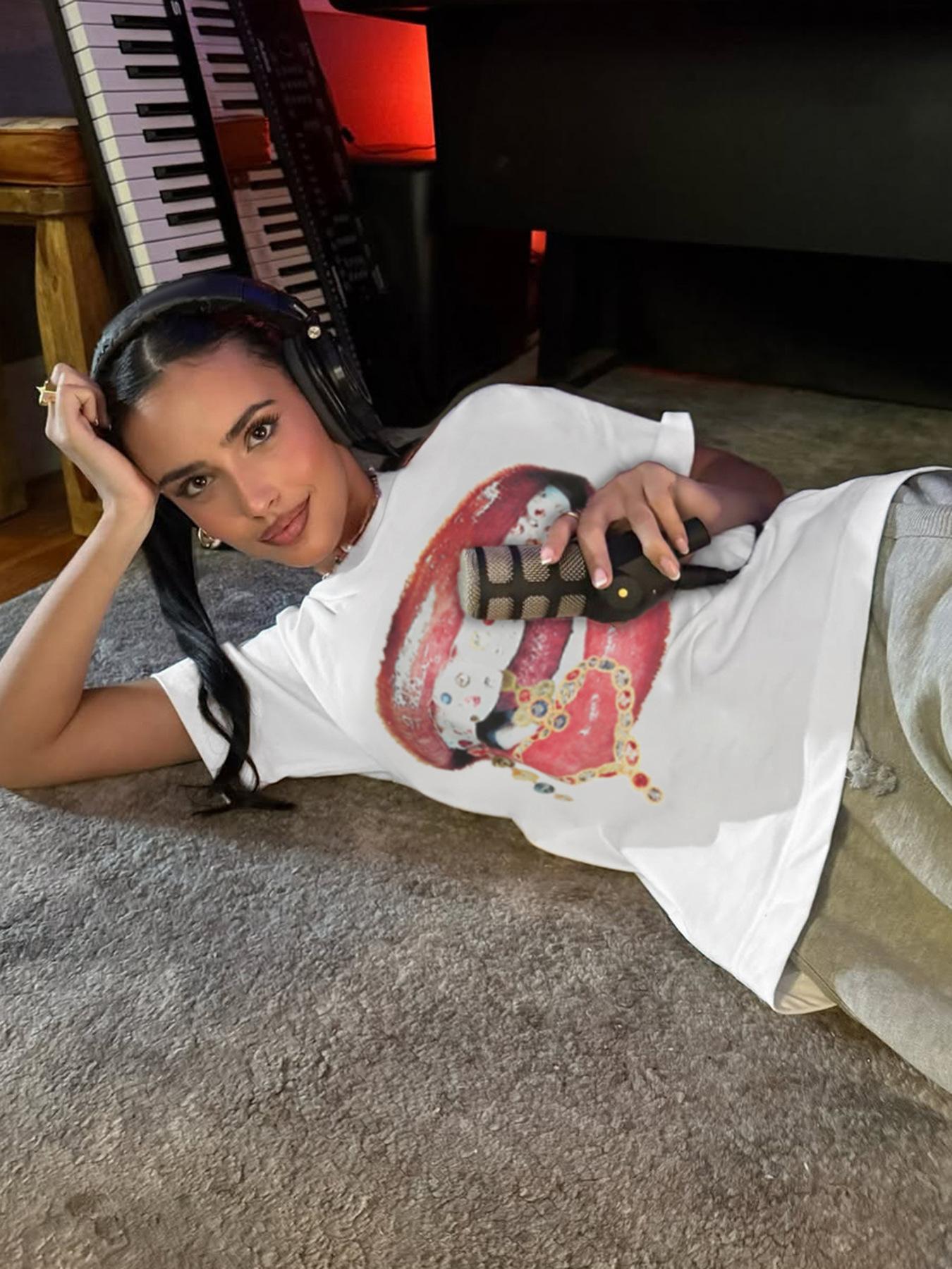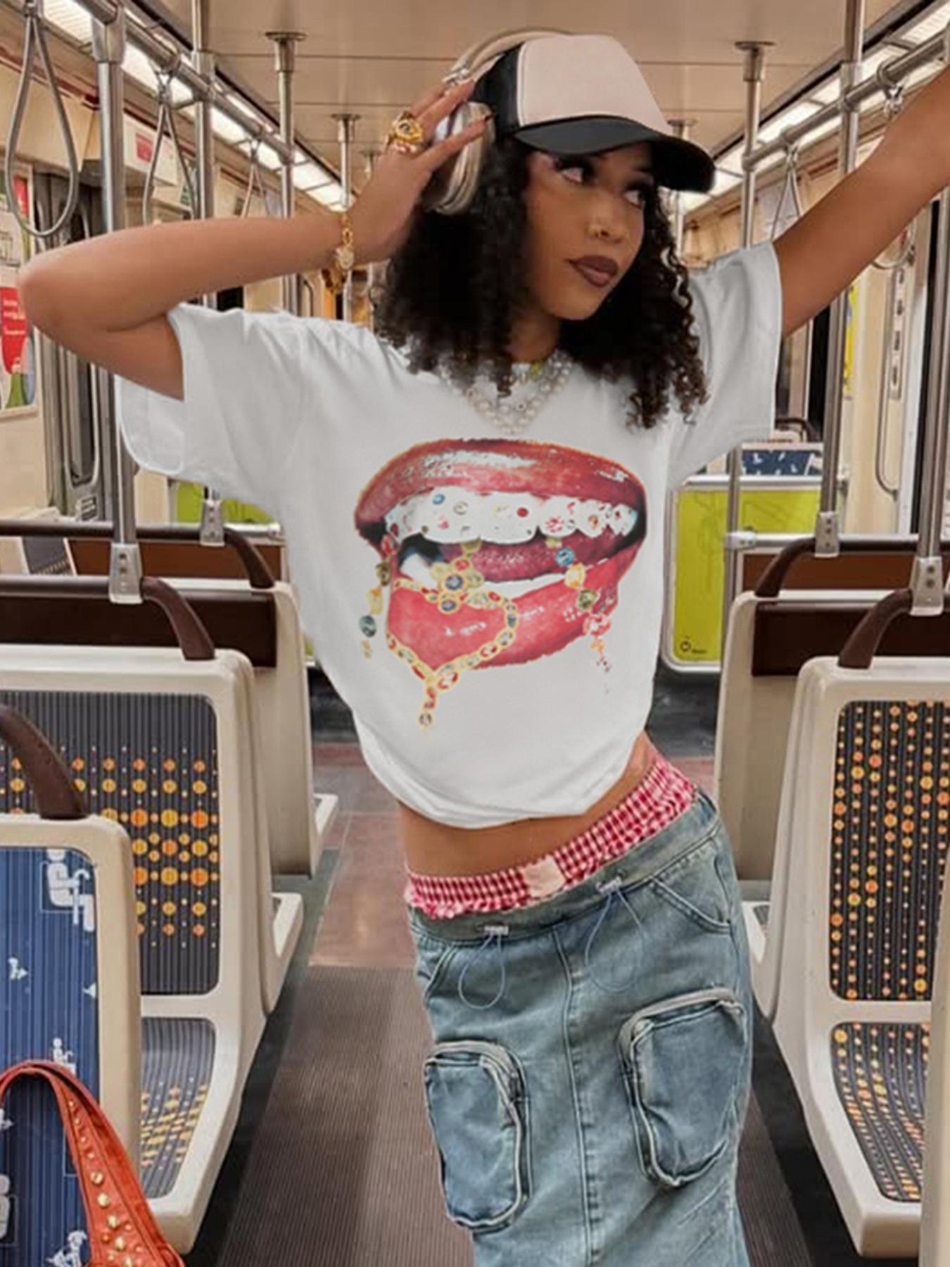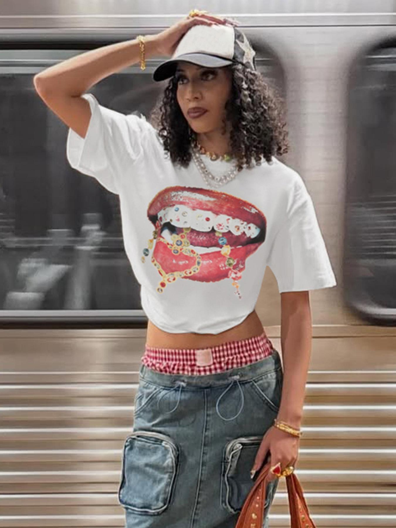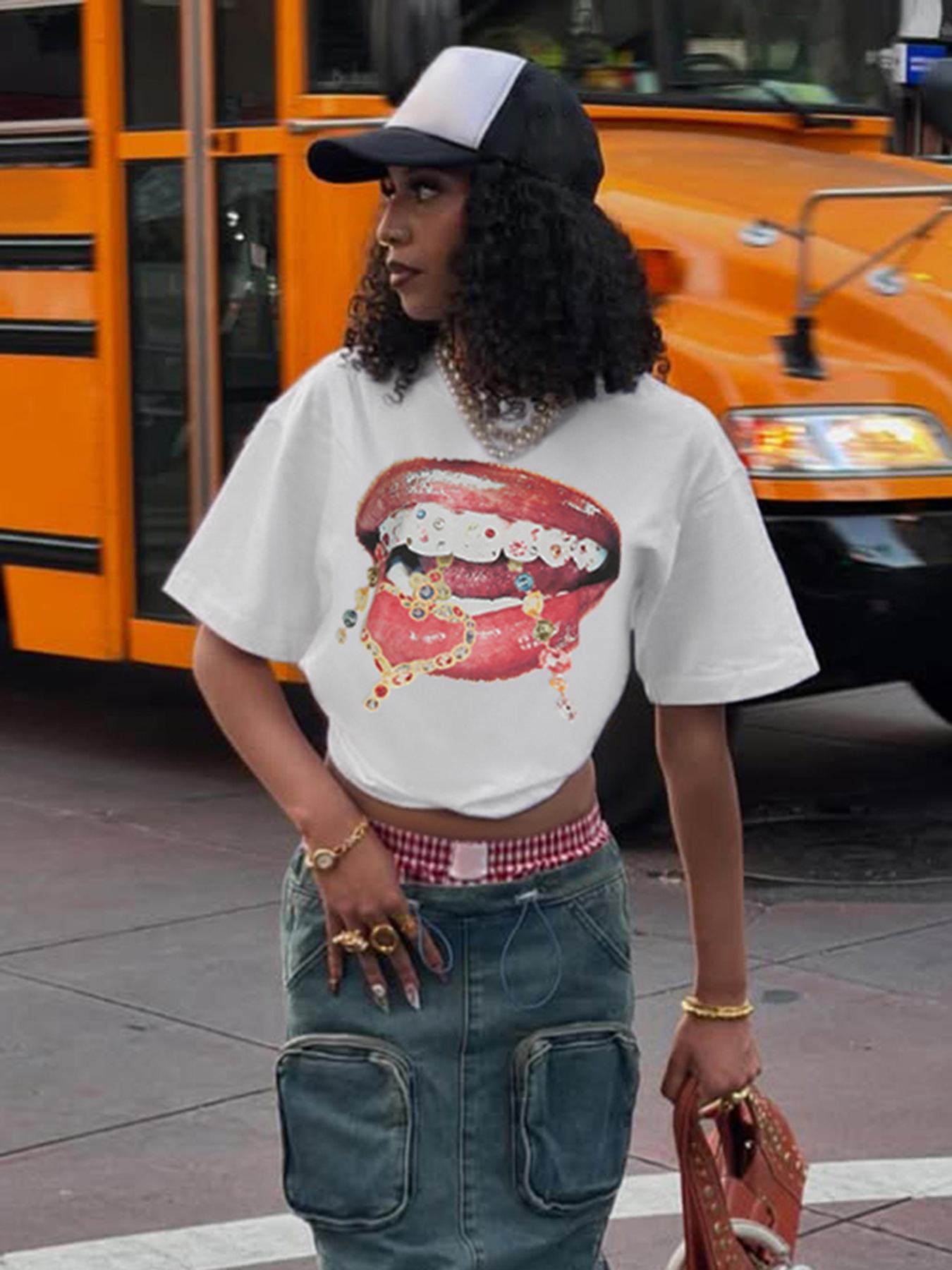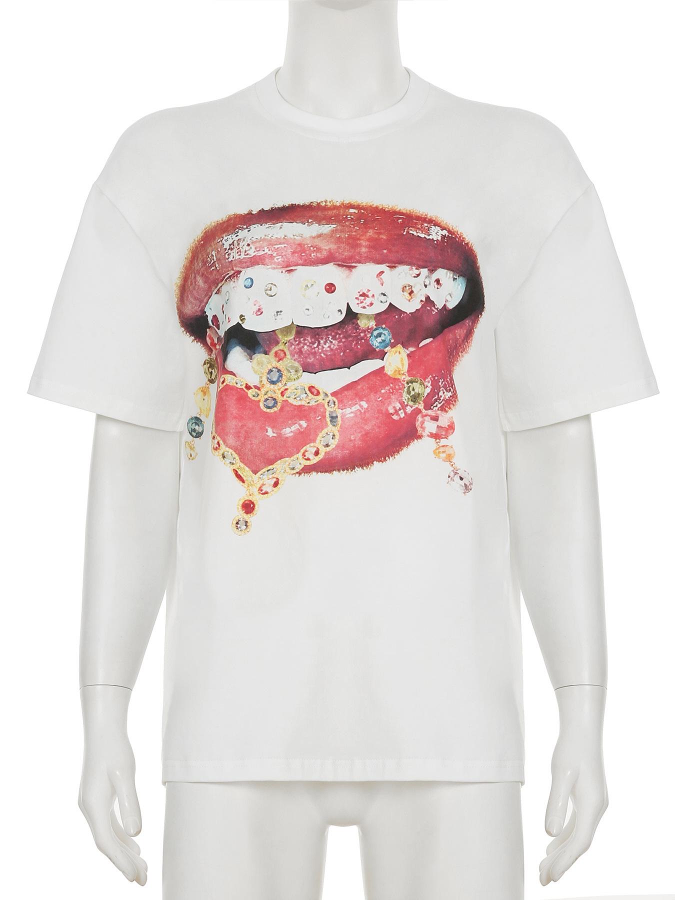 Camiseta Estampada de Boca Grande Personalizada de AliExpress, Moderna, Holgada, a la Moda, Combinable con Todo, Cuello Redondo, Manga Corta, Top de Comercio Exterior Europeo y Americano