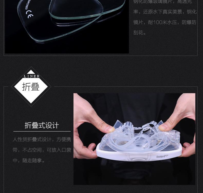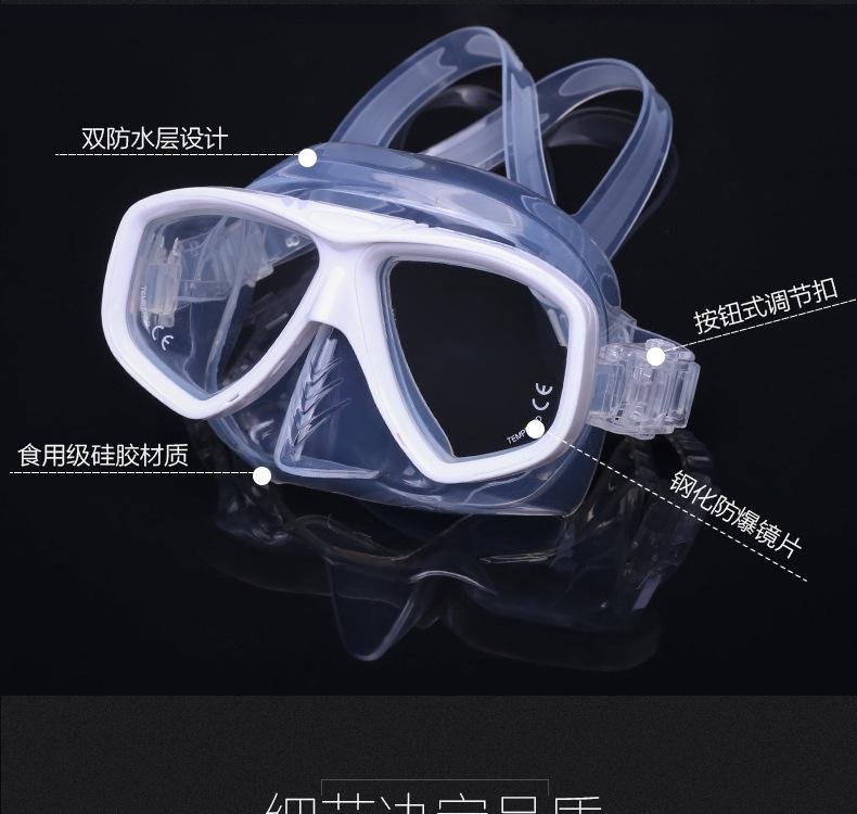 Máscara: Hecha de silicona líquida de grado alimenticio de Toshiba, es cómoda y suave. No produce alergias en la piel, no envejece y tiene una larga vida útil. No envejecerá ni se agrietará debido a la inmersión en agua de mar durante muchos años. La máscara de silicona es más gruesa que las ordinarias y es más adecuada para el buceo en aguas profundas.