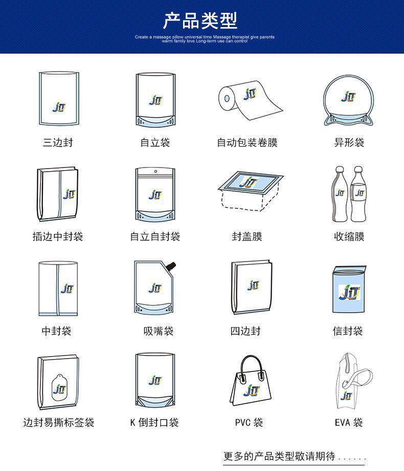 (Por ejemplo: sello de tres lados, sello central, bolsa de pie, bolsa de pie con cremallera, rollo de película para embalaje automático, etc.)