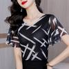 Camiseta de Malla Estampada Estilo Western Chic de Manga Corta para Mujer Verano Nuevo Diseño Sentido Ajustada Elástica Top para Vestido de Baile