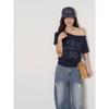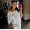Camiseta de manga corta de color liso, holgada, con cuello de un solo personaje y diseño de hombros descubiertos para mujer, verano 2024, nueva camiseta de alta gama con hombros oblicuos