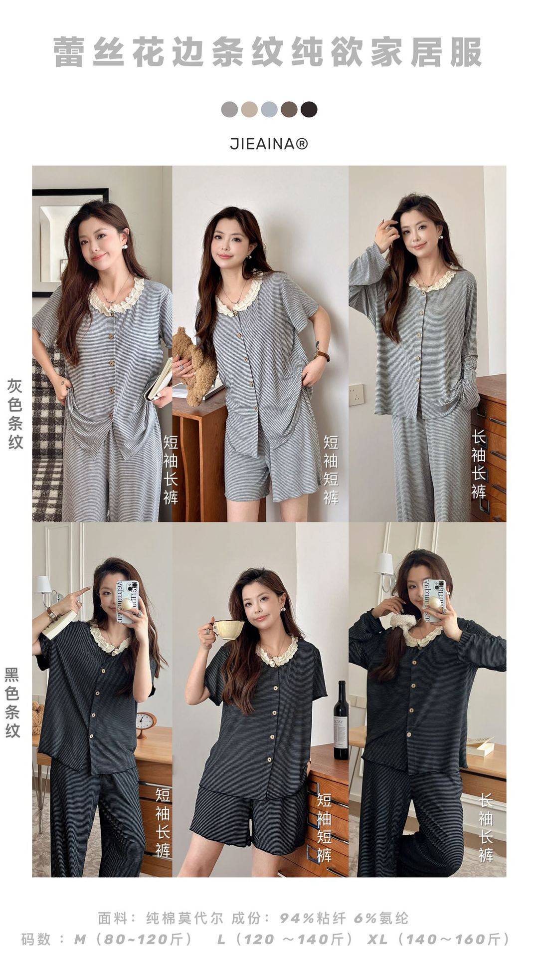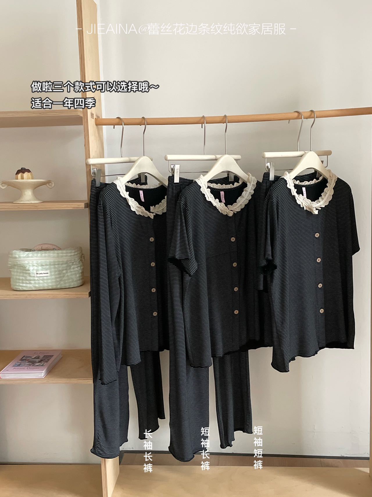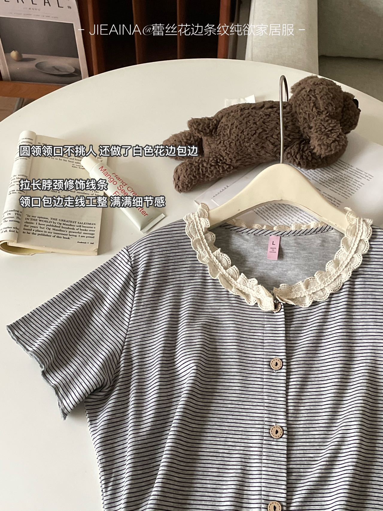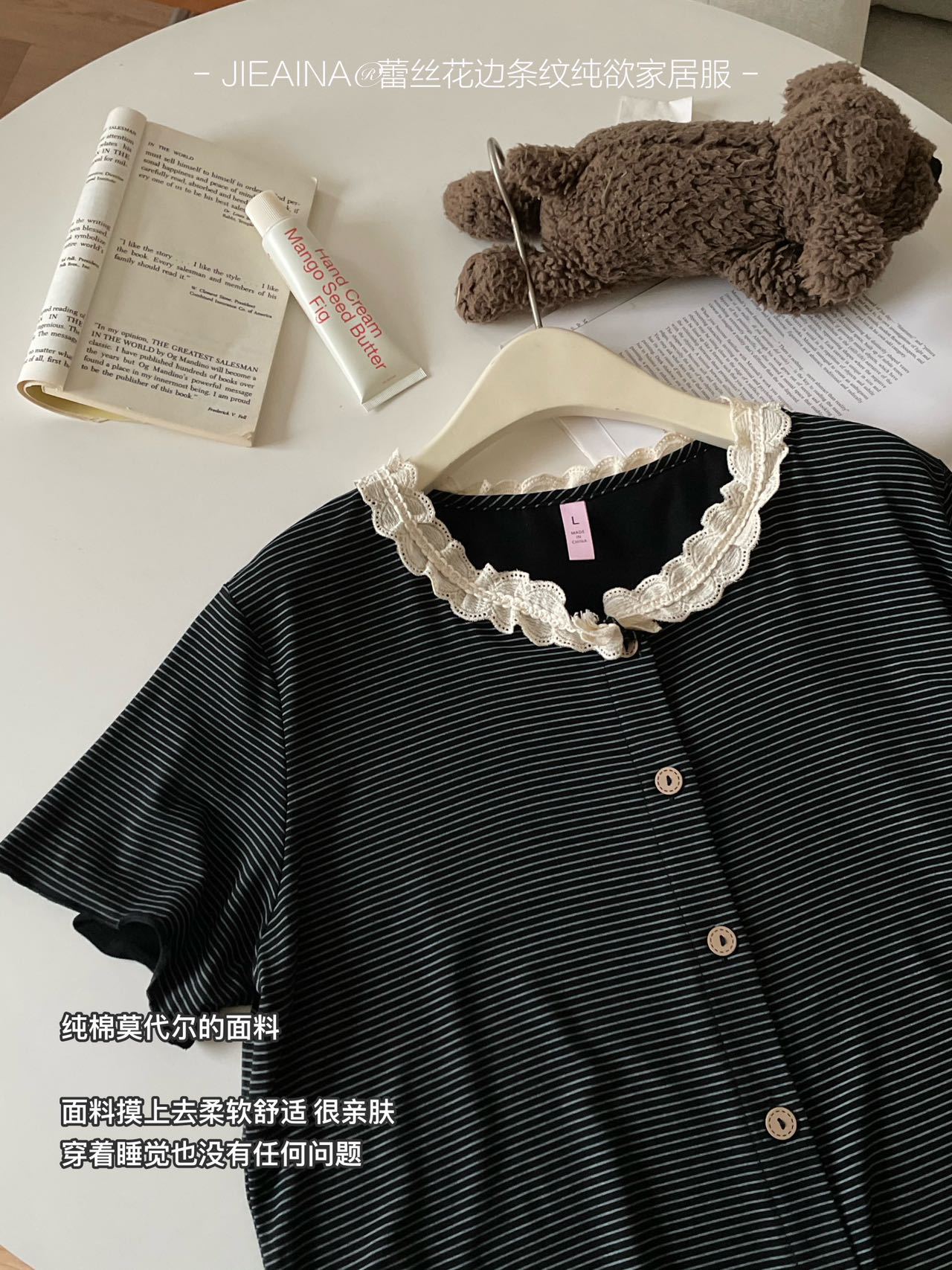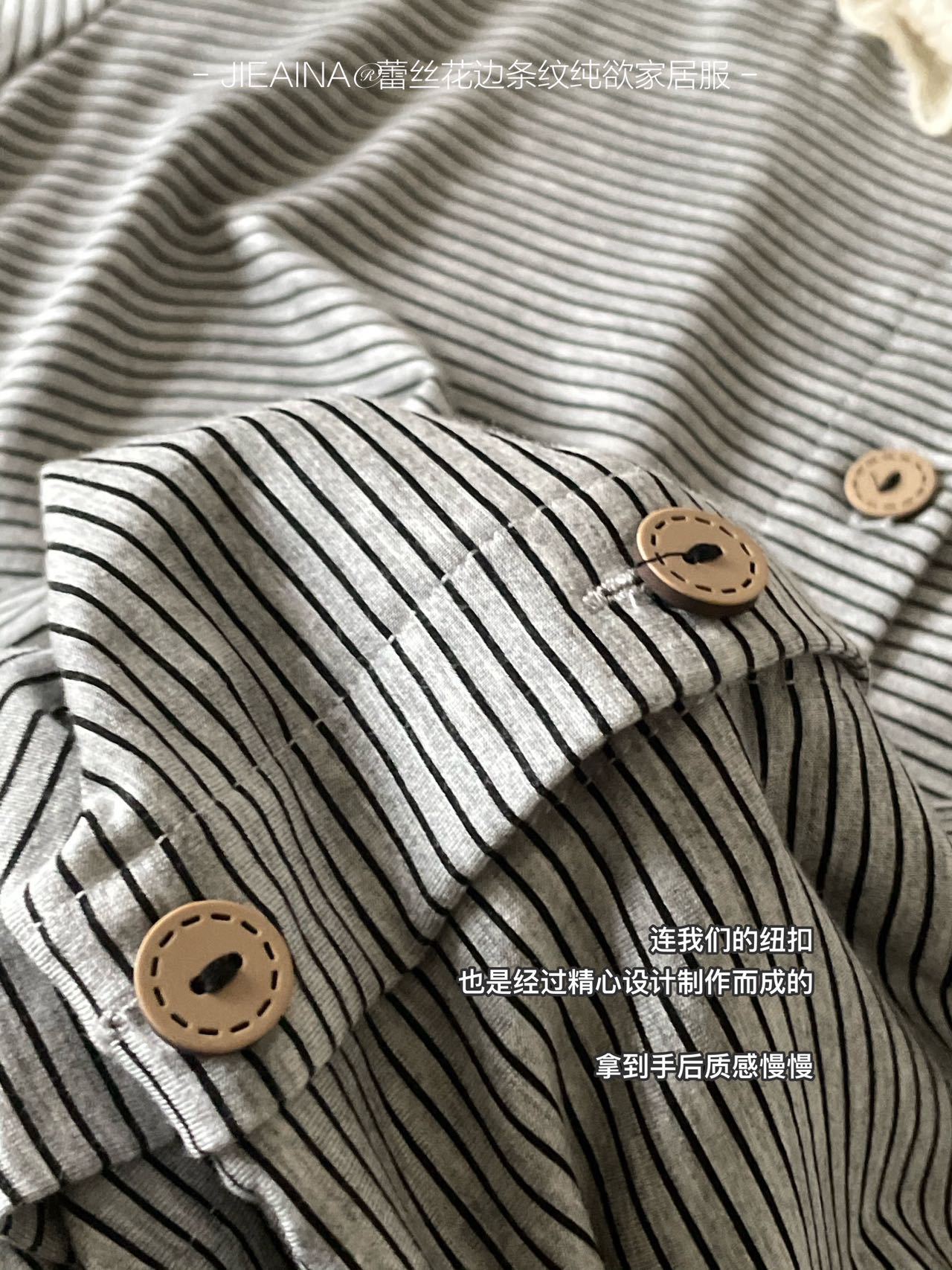 Cárdigan de manga corta y manga larga con encaje a rayas para primavera y verano, ropa de casa, pijama de algodón modal para mujer