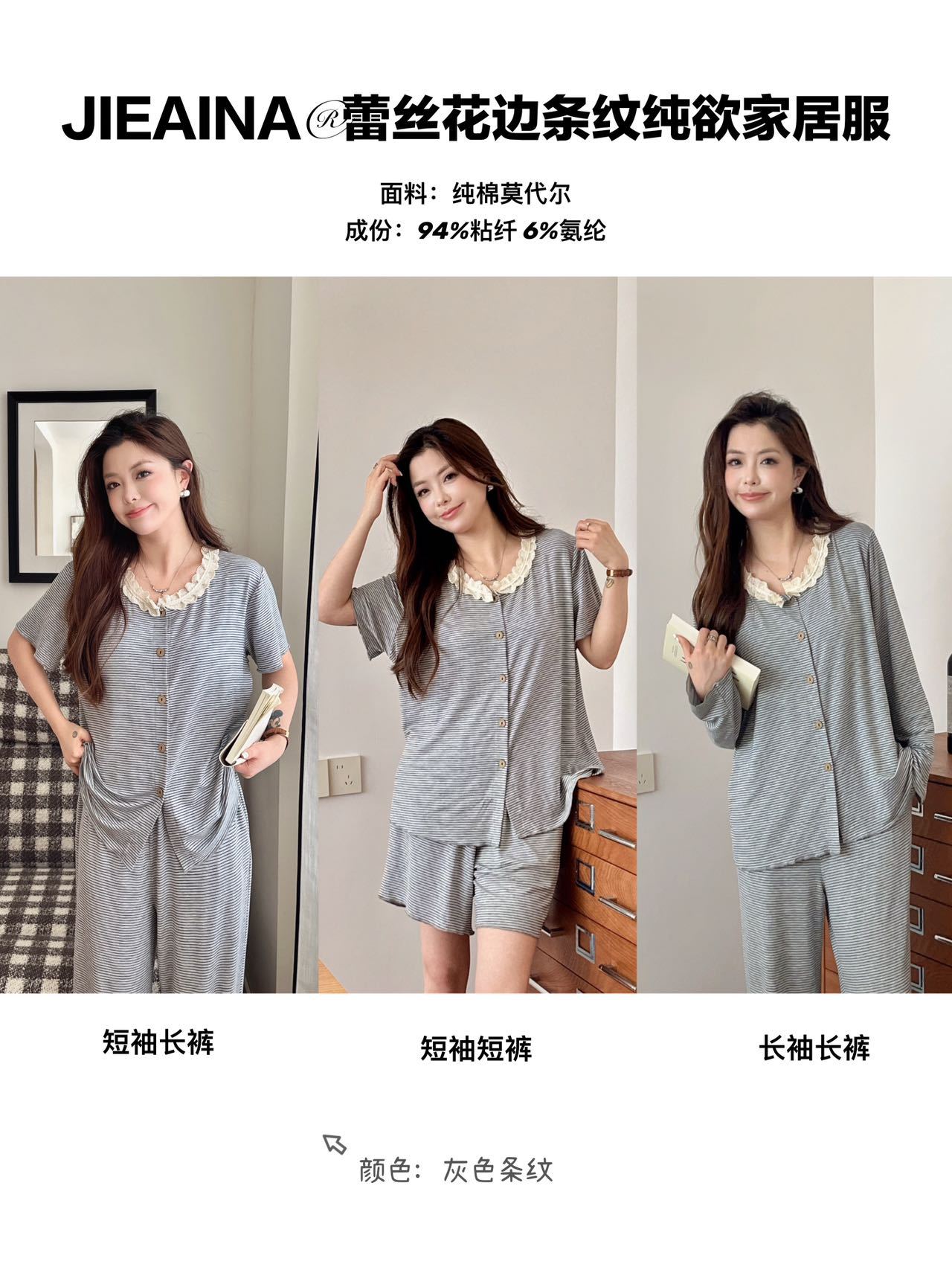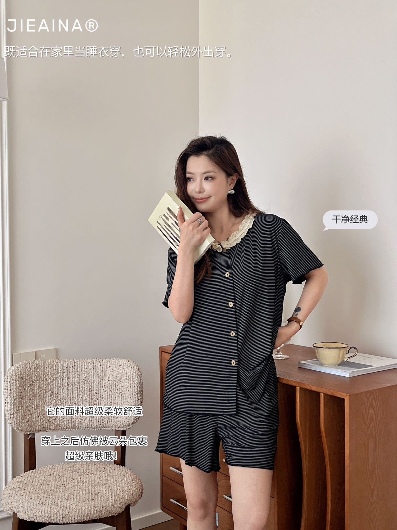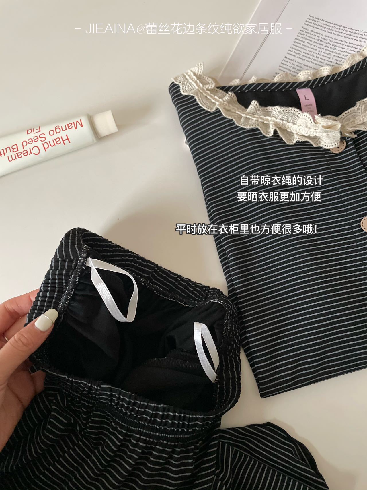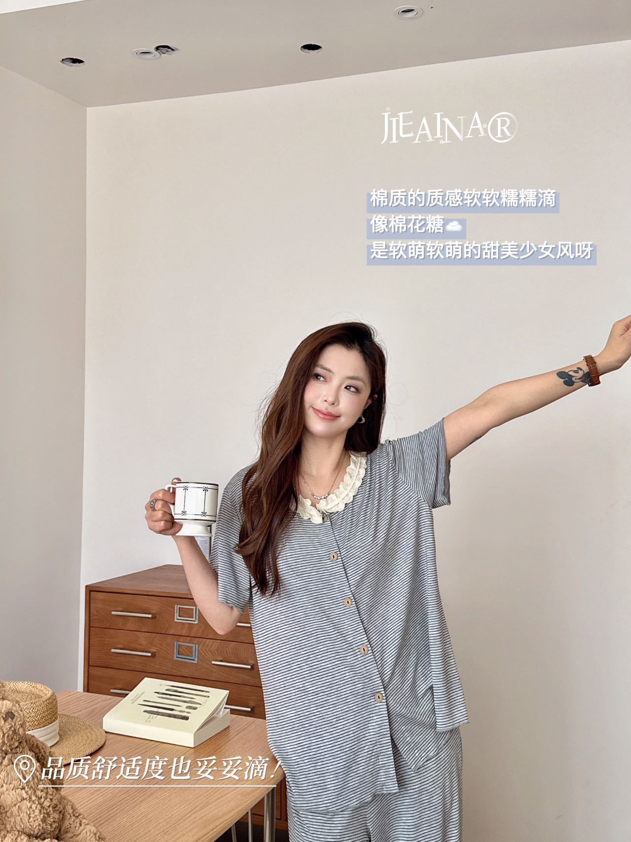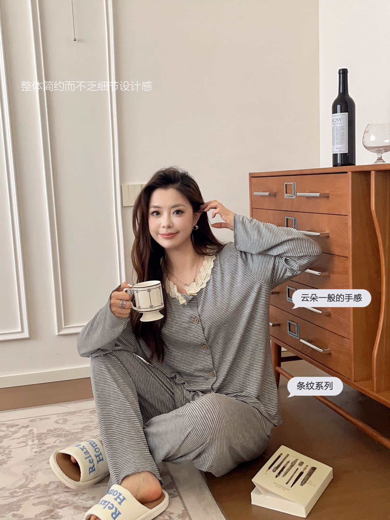 Cárdigan de manga corta y manga larga con encaje a rayas para primavera y verano, ropa de casa, pijama de algodón modal para mujer