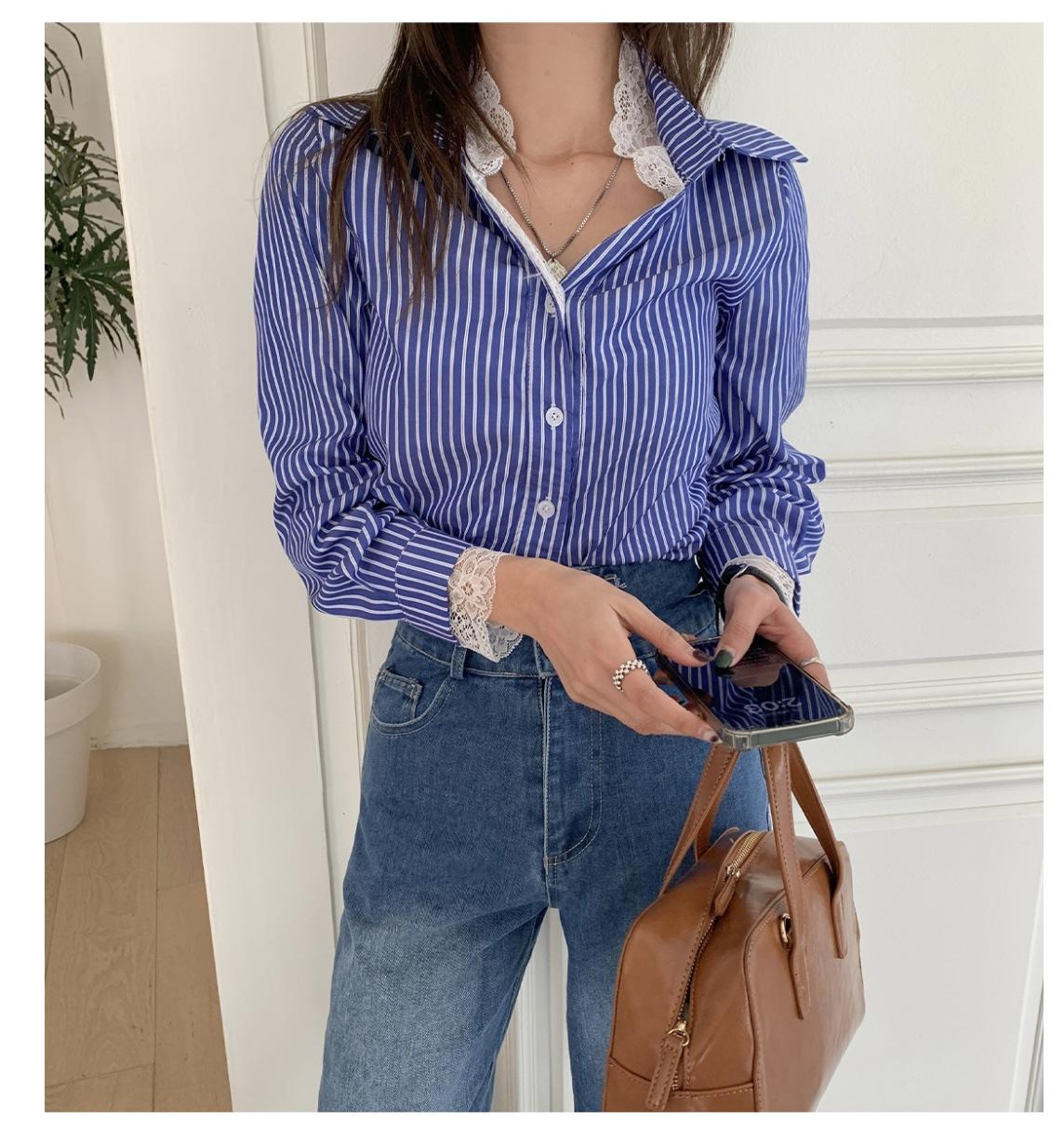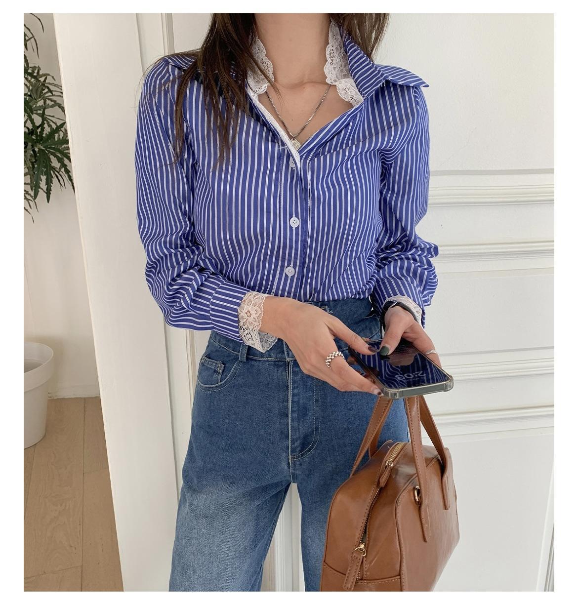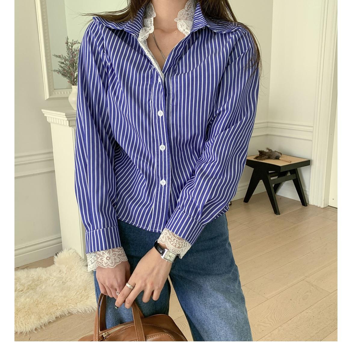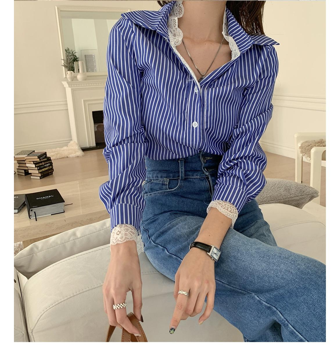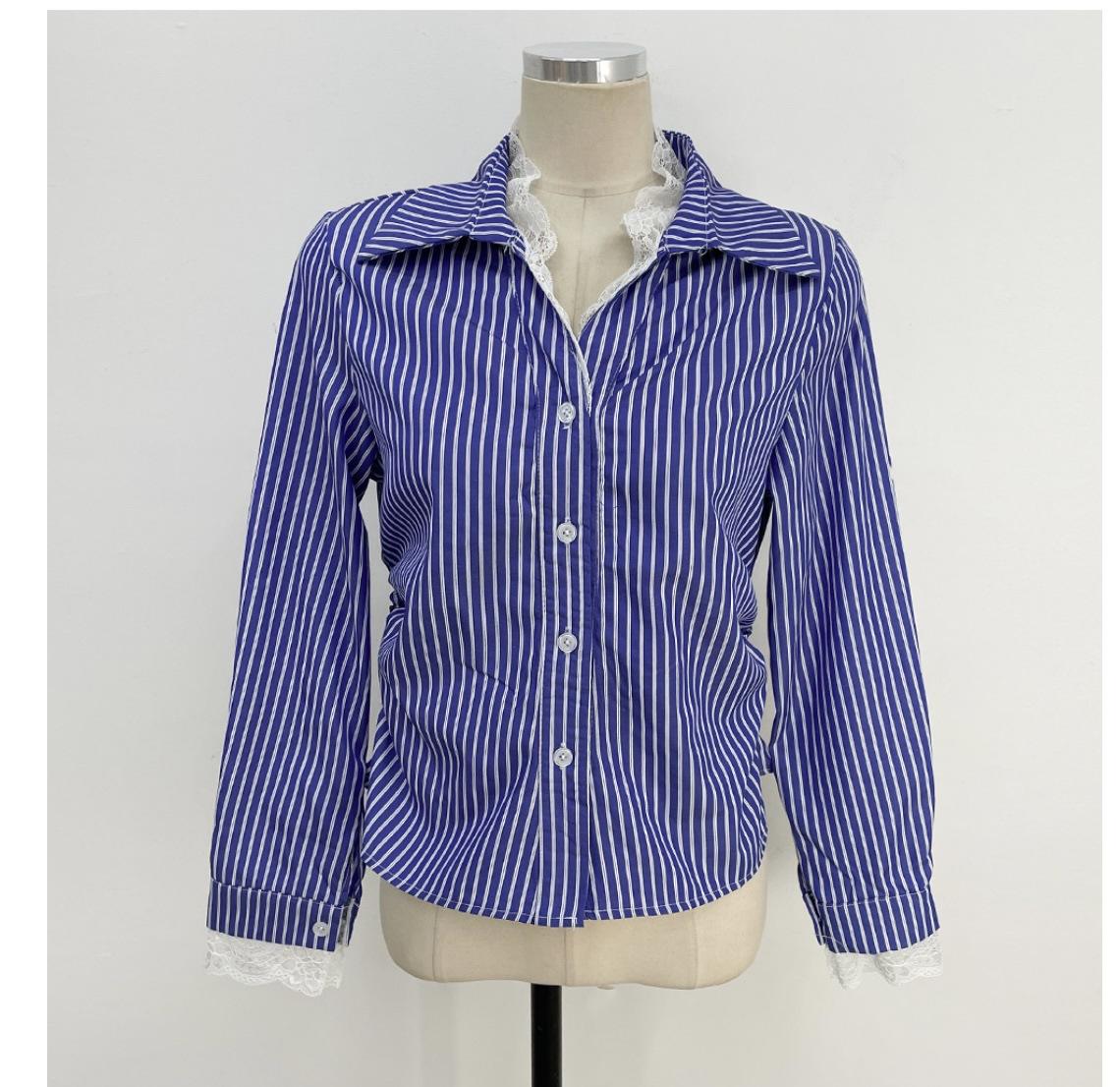 Primavera y Otoño 2025 Principios de Primavera Nueva Camisa de Diseño a Rayas con Dulce Encaje Calado para Mujer