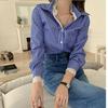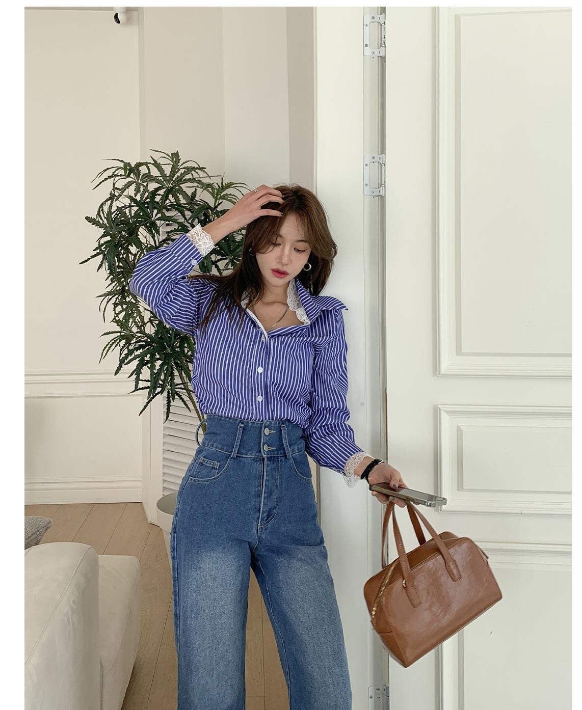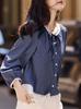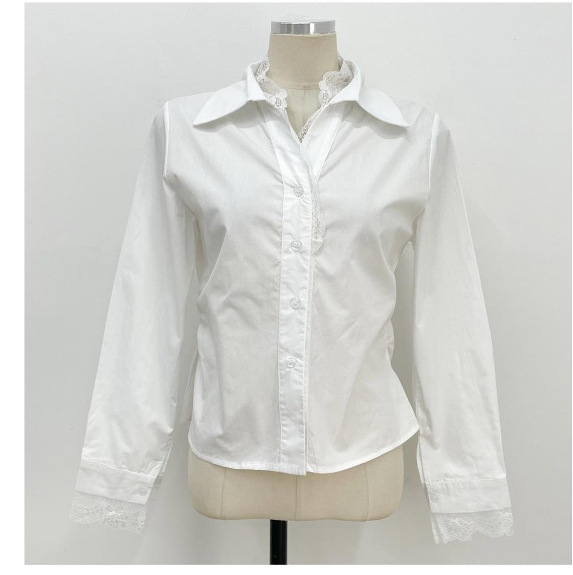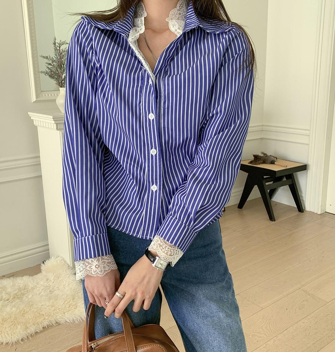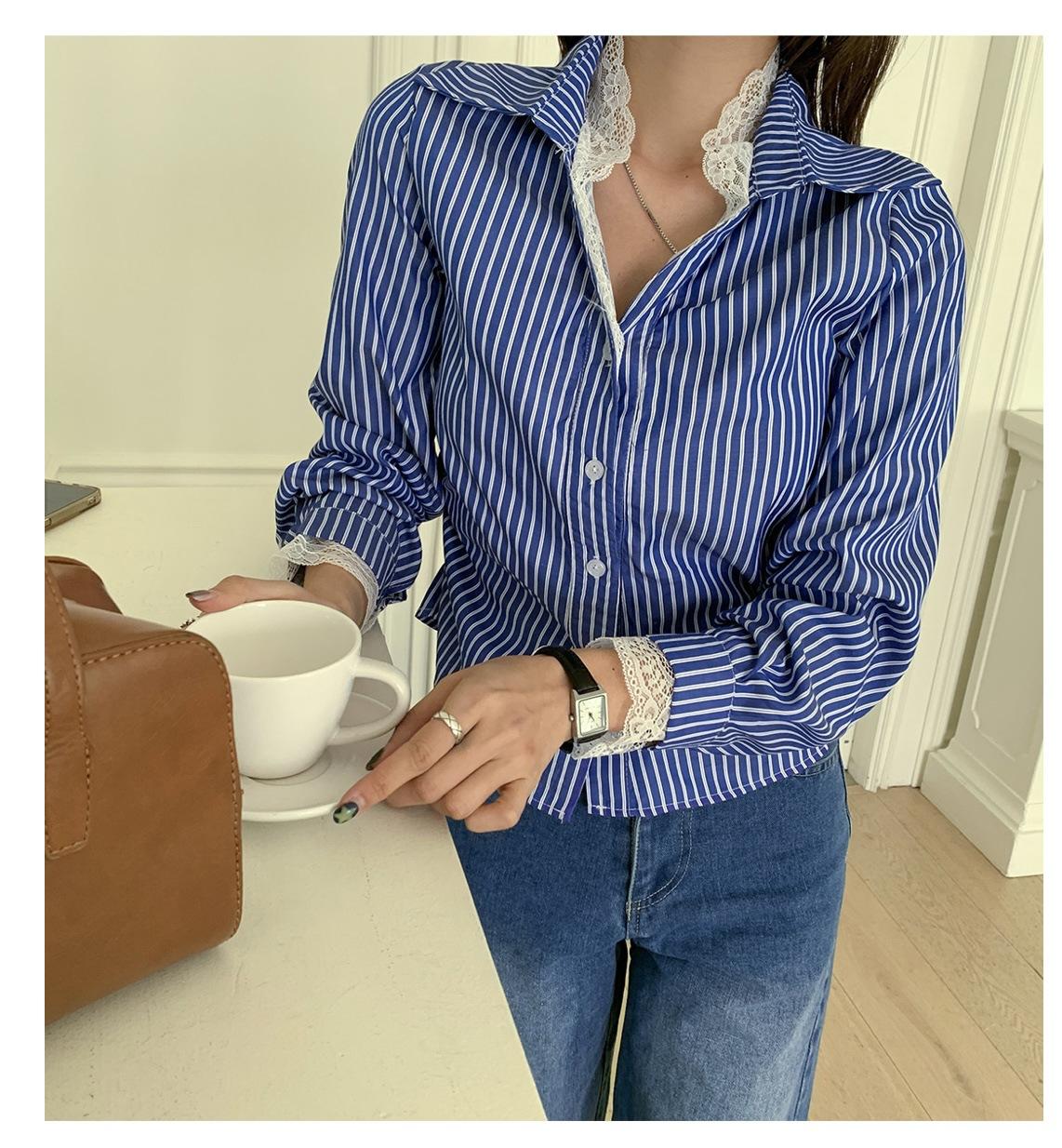Primavera y Otoño 2025 Principios de Primavera Nueva Camisa de Diseño a Rayas con Dulce Encaje Calado para Mujer