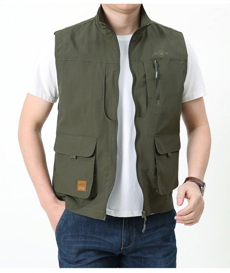Cárdigan de color sólido de primavera para pesca con fotografía personalizada, chaleco casual para hombre, holgado, multibolsillo, con cuello alto, chaleco de trabajo