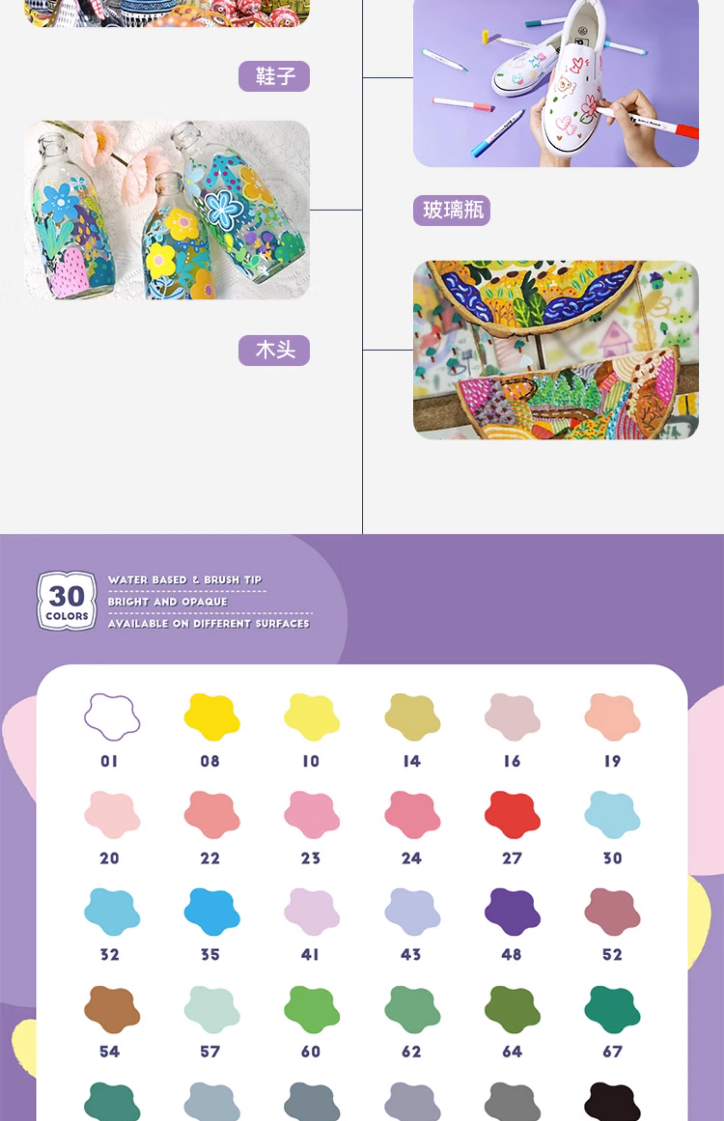 Set de Marcadores Acrílicos 30 Colores Morado Impermeable Punta Suave DIY Manualidades Graffiti Pluma para Tarjetas Goo