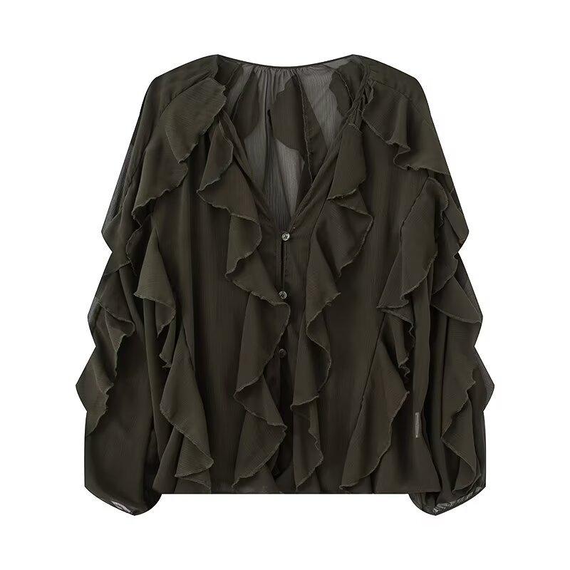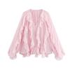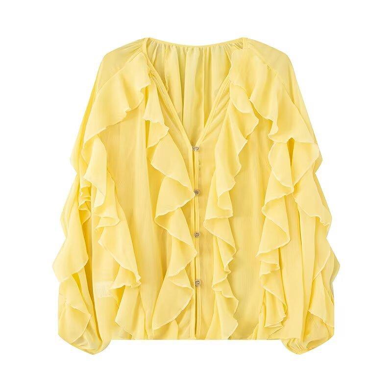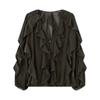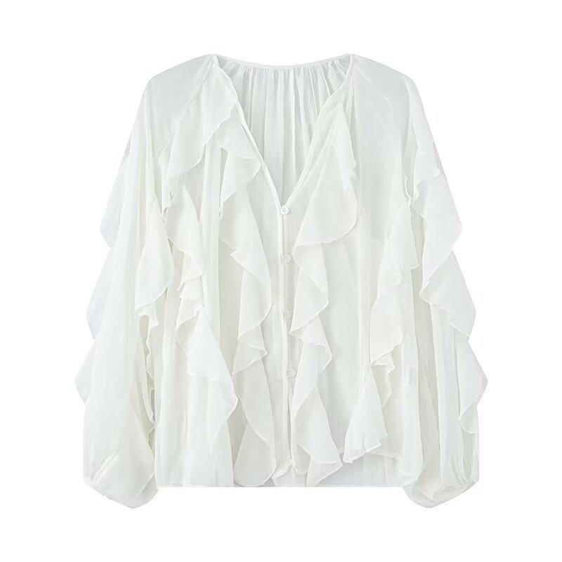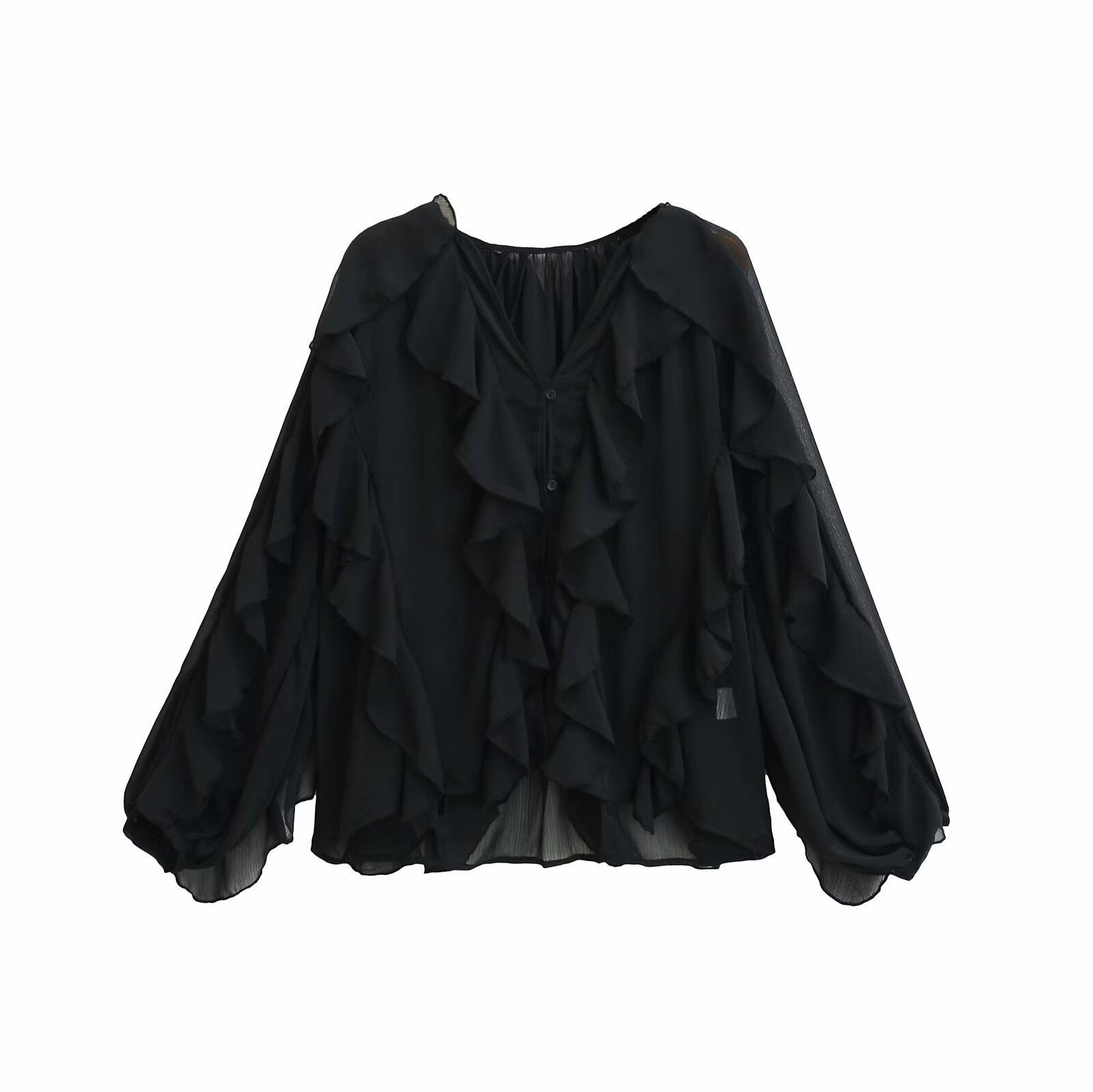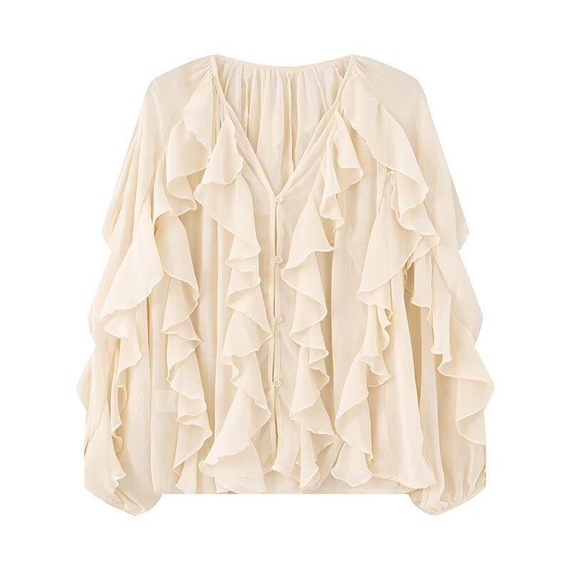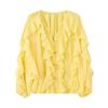 2025 primavera nuevo estilo europeo y americano transfronterizo moda femenina laminado decorativo cuello en V manga larga camisa w034 25035