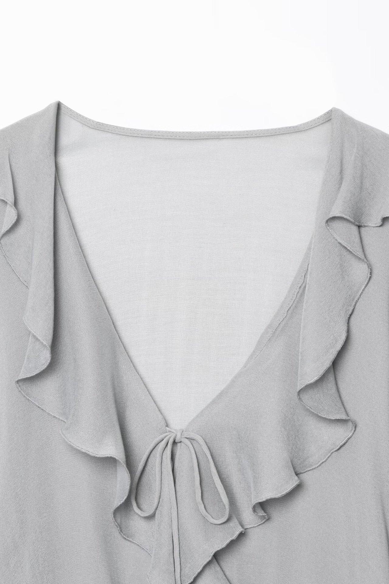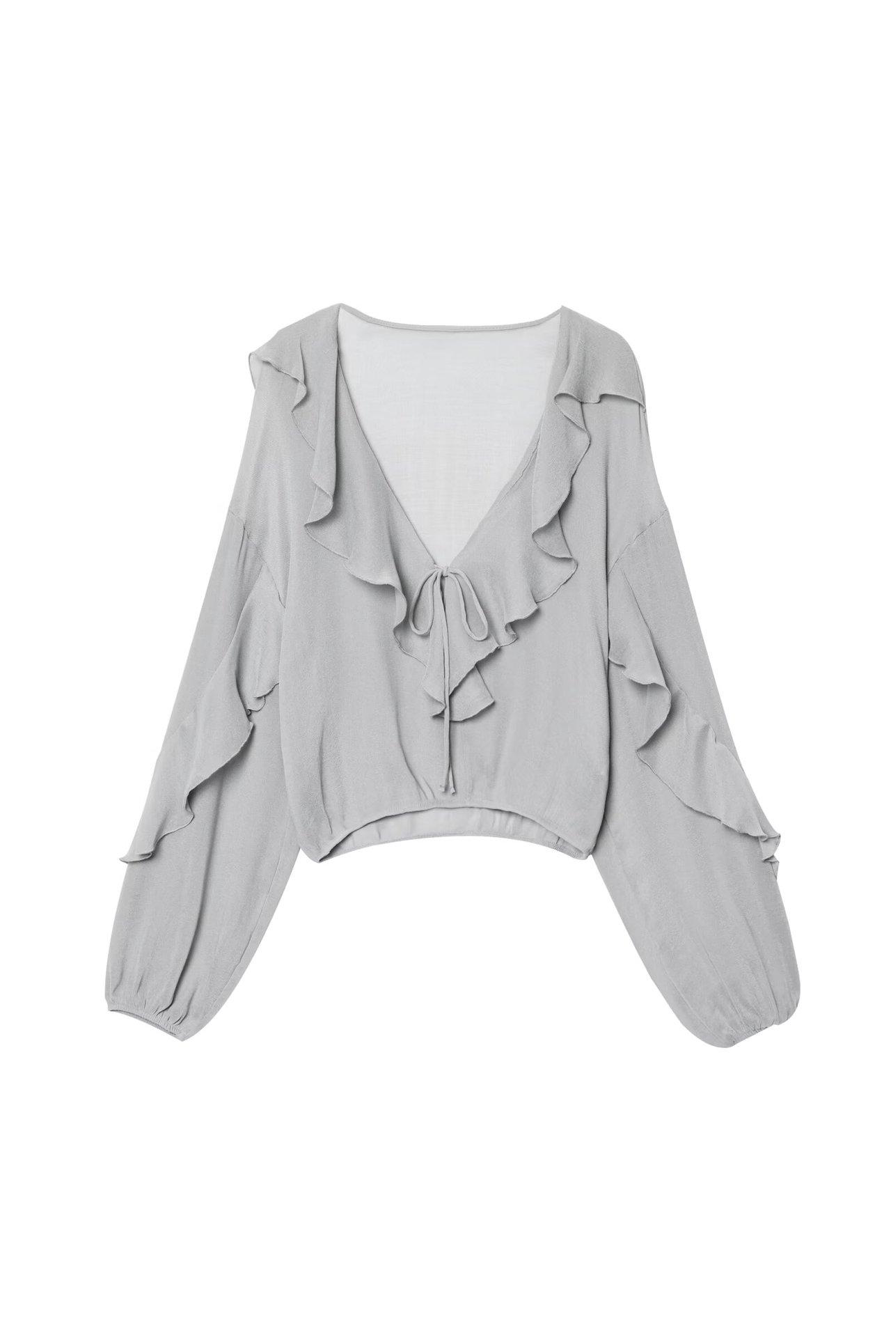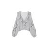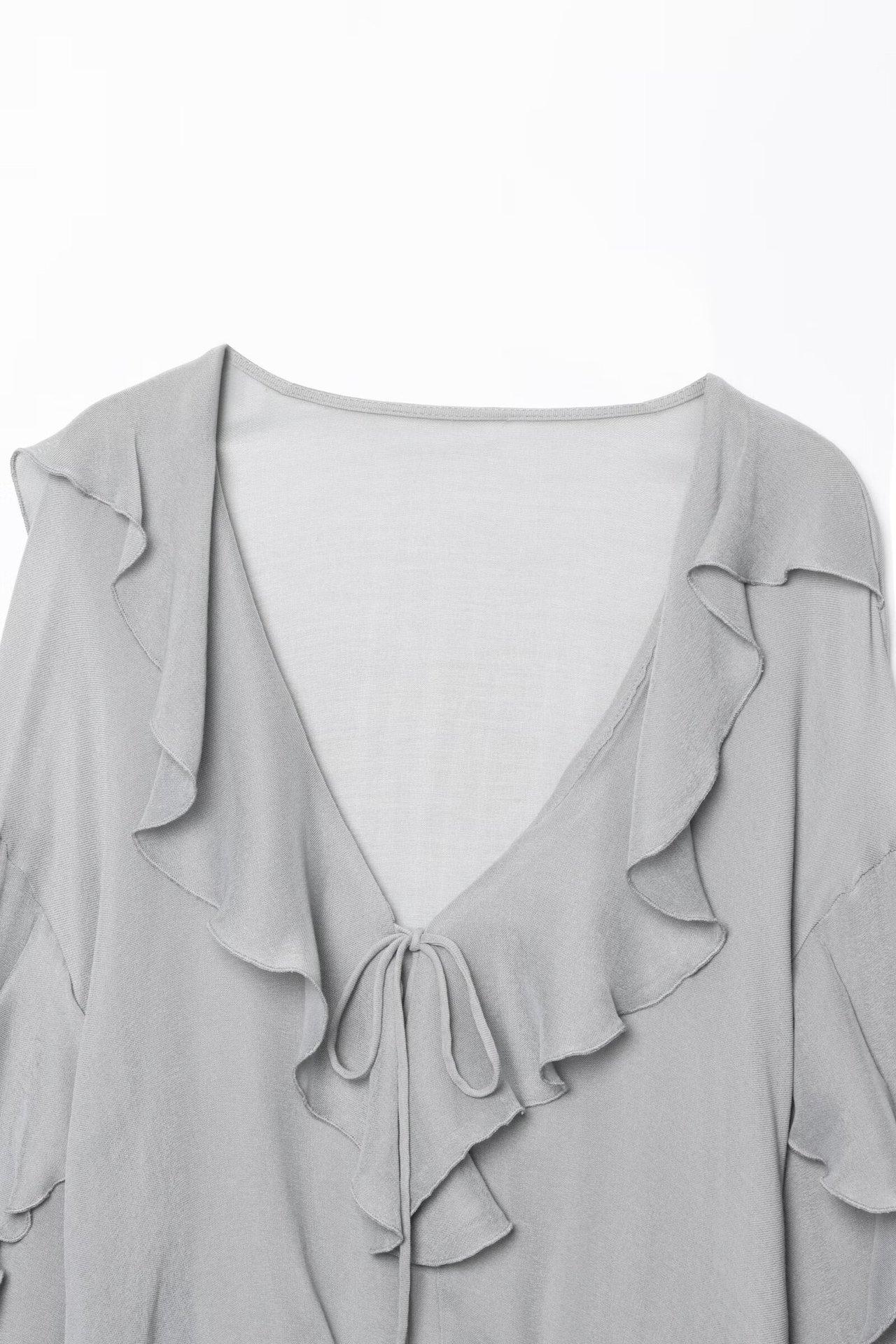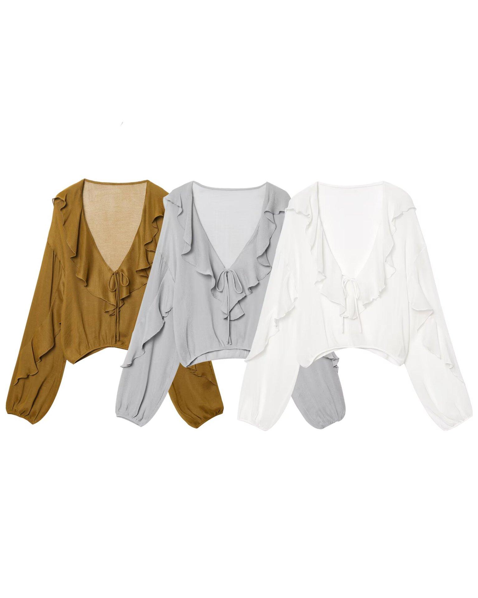 Primavera 2025 Nuevo Europeo y Americano Transfronterizo Moda Femenina Cuello en V Laminado Decorativo Drapeado Manga Larga Camisa w063 9310