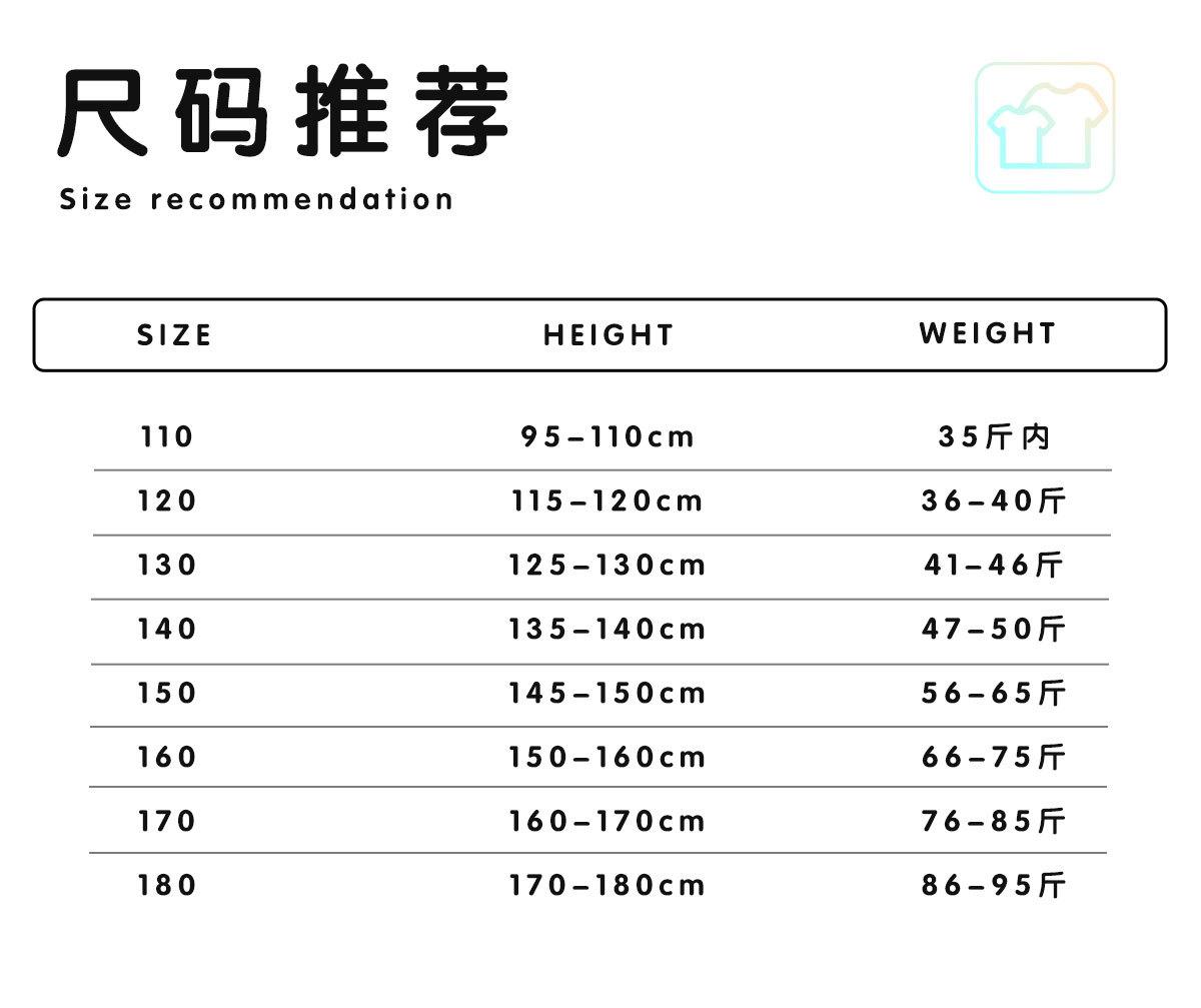 S size (suitable for 110-120), M size (suitable for 130-140), L size (suitable for 150-160), Xl size (suitable for 170-180)