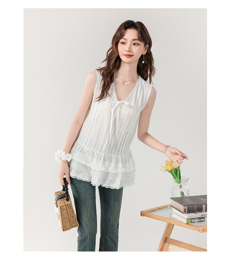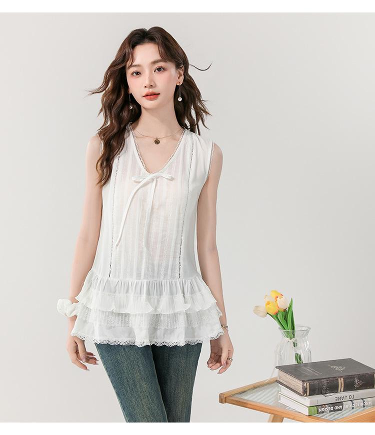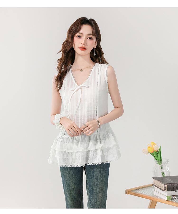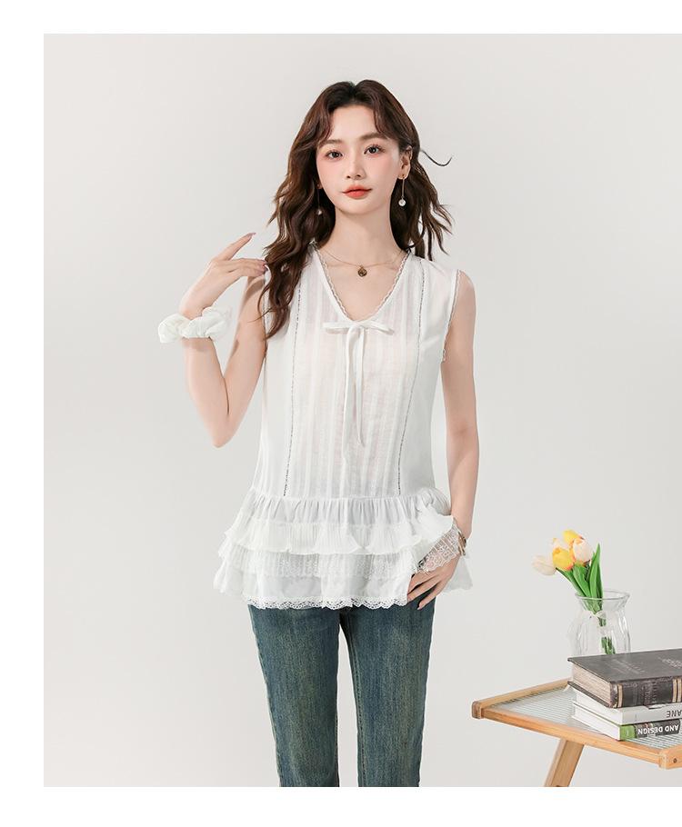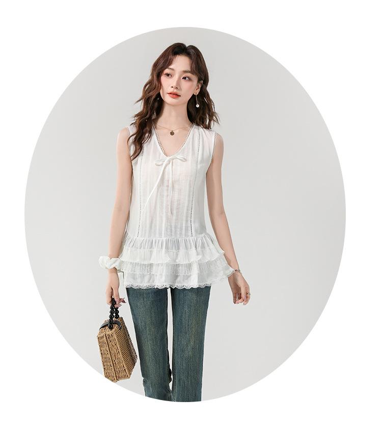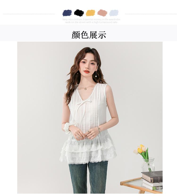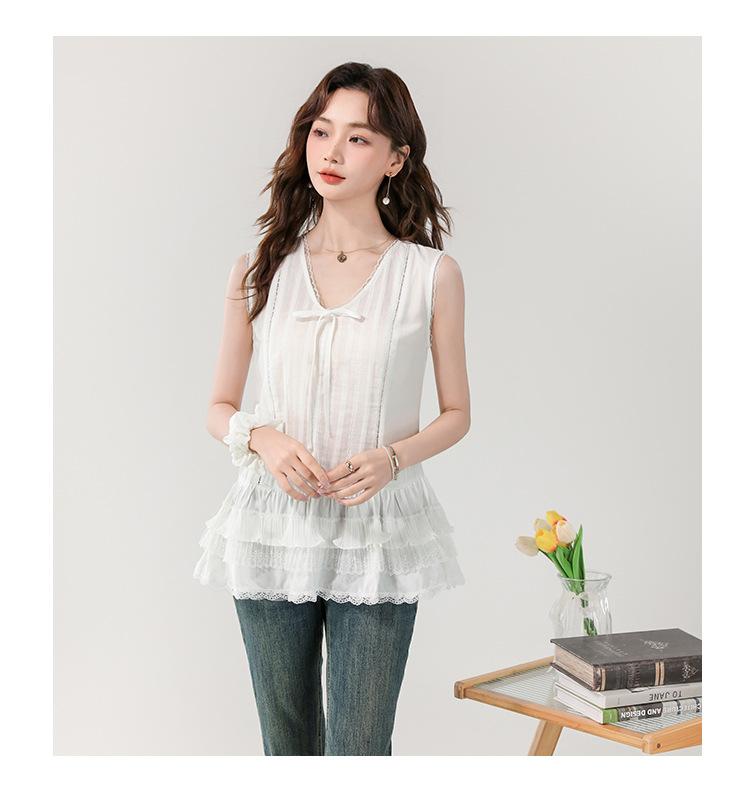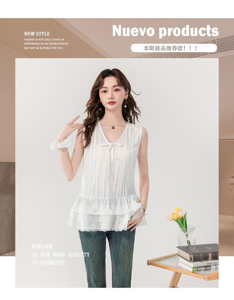 Compra Foto Real del Nuevo Estilo de Verano Top Chaleco Blanco de Capas con Encaje con Lazos y Borde de Encaje sin Mangas con Cuello Francés al por mayor en Joom.pro