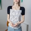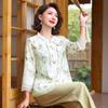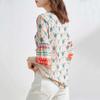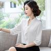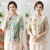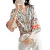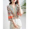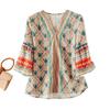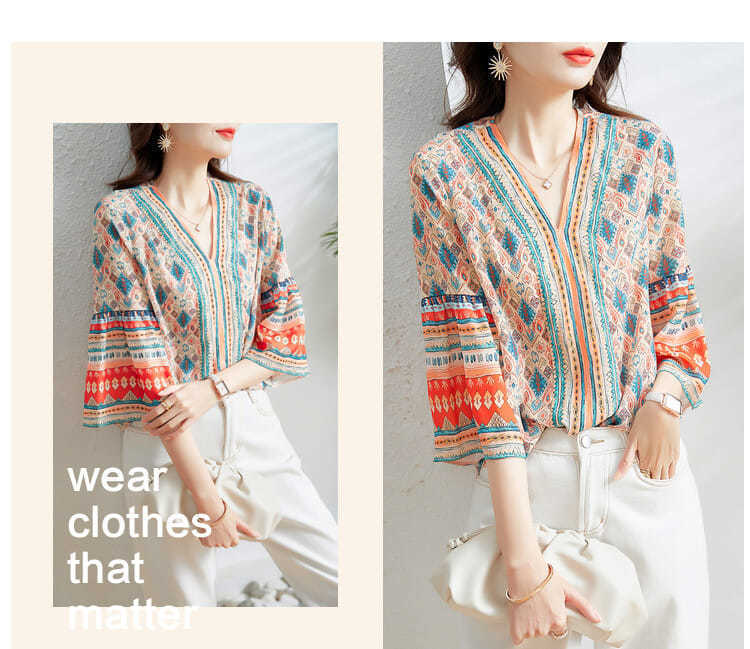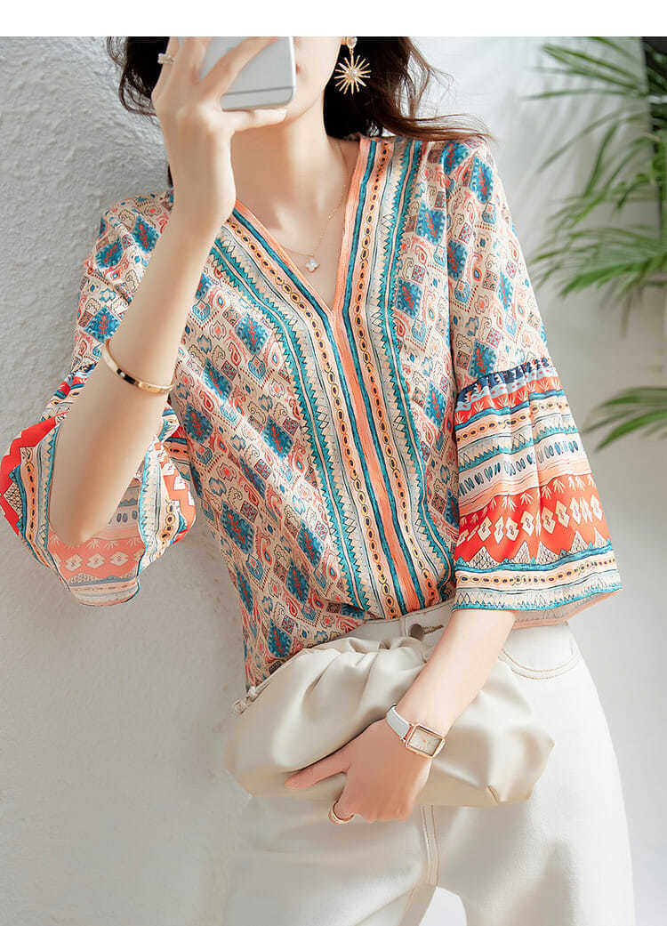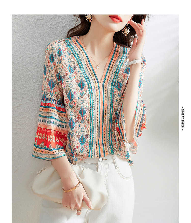 2024 Verano Nuevo Cuello en V Suelta Manga Acampanada Siete Mangas Camisa Top de Mujer Estilo Étnico Camisa de Gasa Estampada