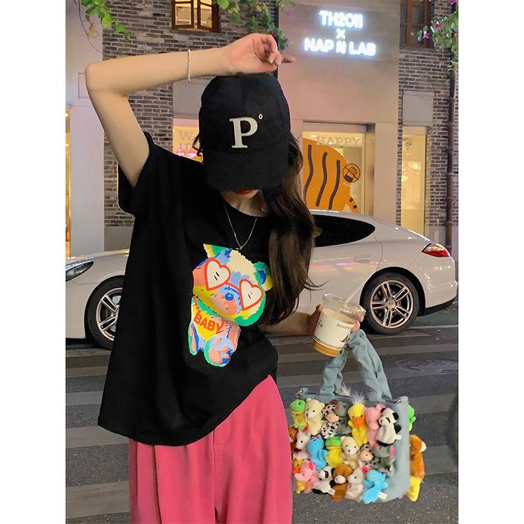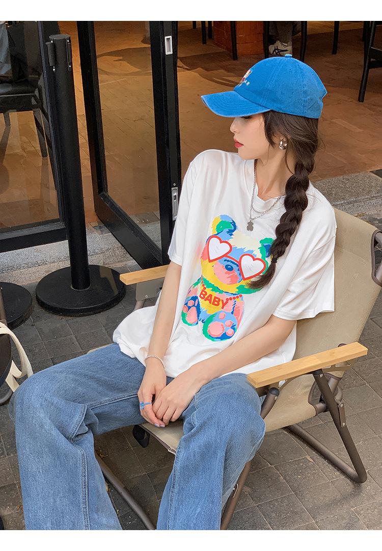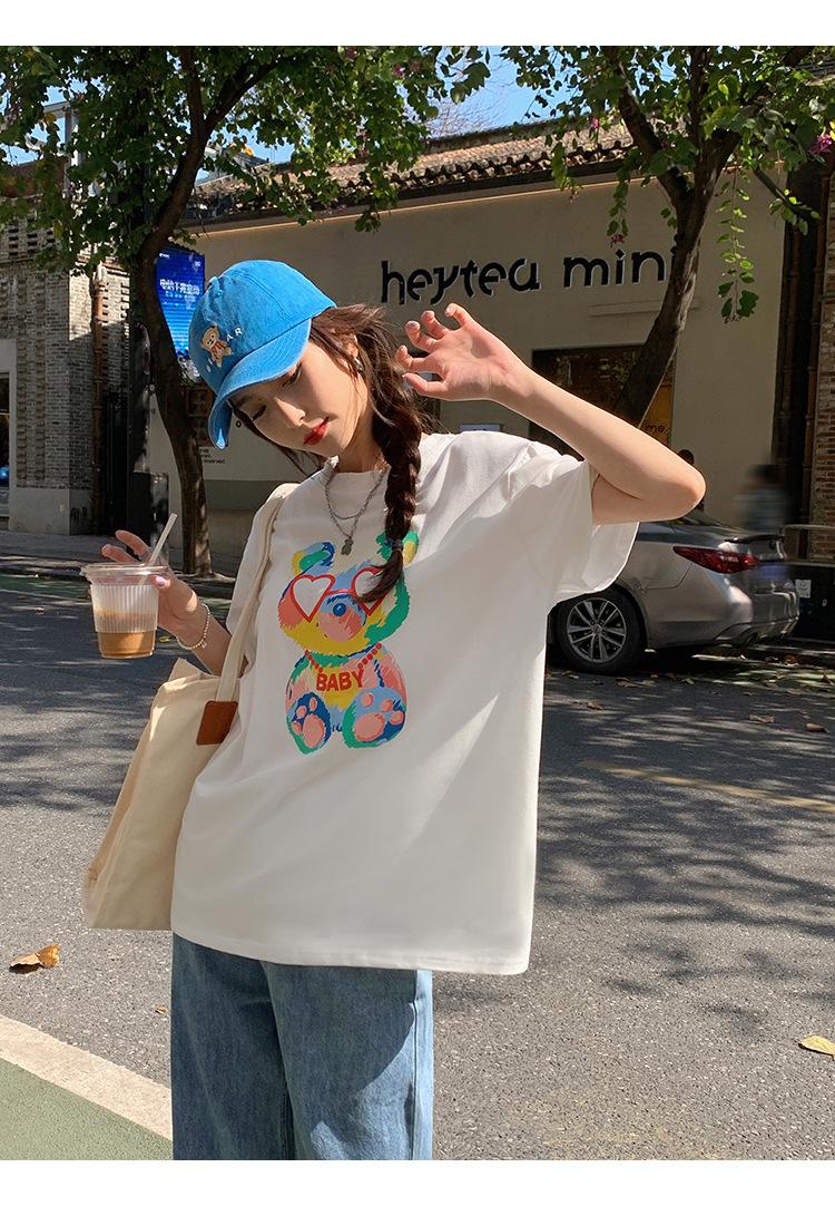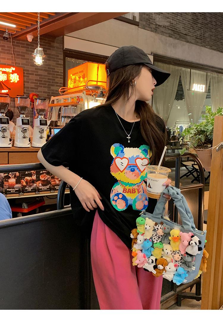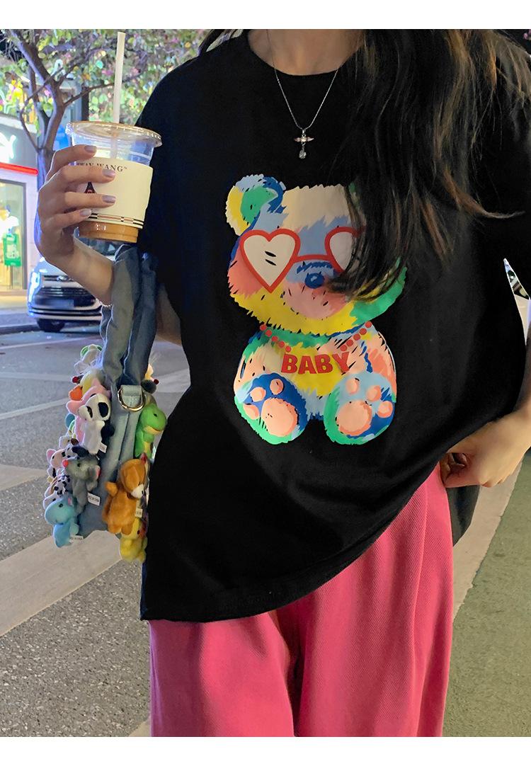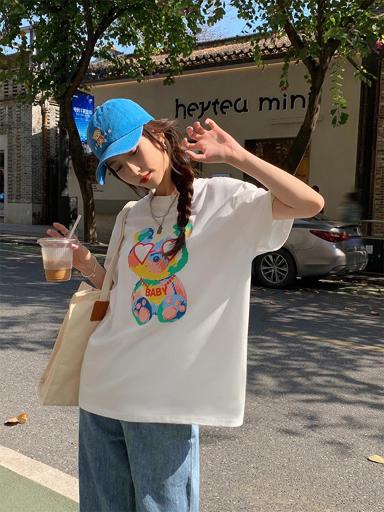 Dropshipping 2025 Nuevo Diseño Camiseta de Manga Corta con Estampado de Oso para Mujer Verano Nueva Holgada Estilo Coreano Top de Hombro Derecho t