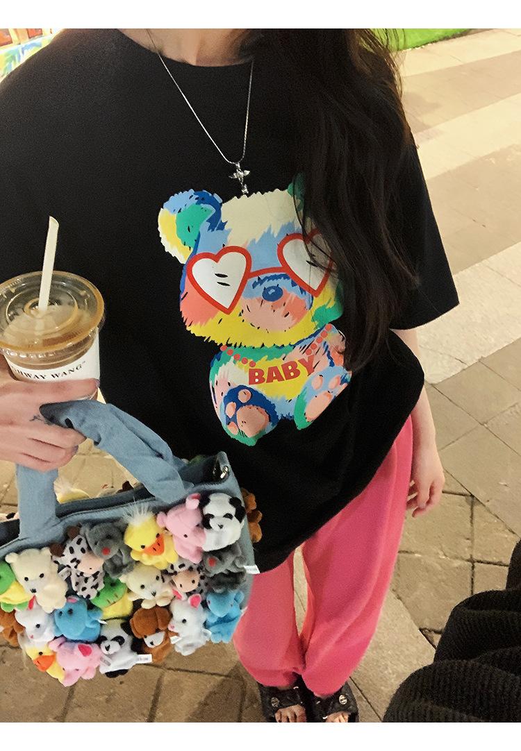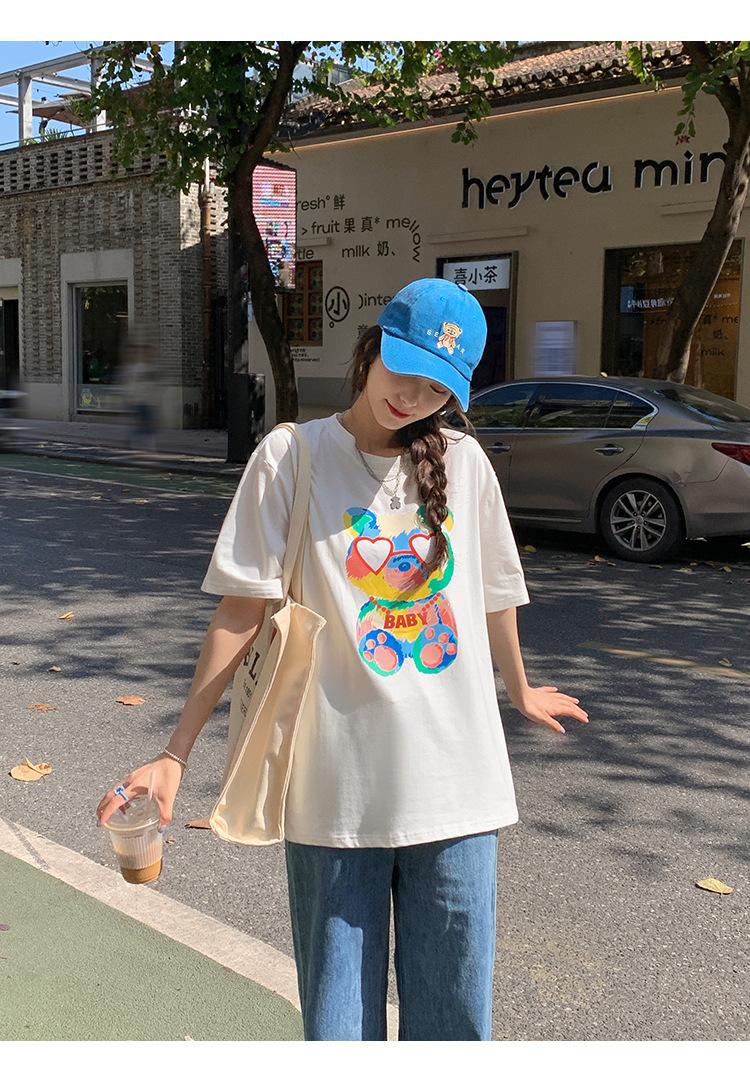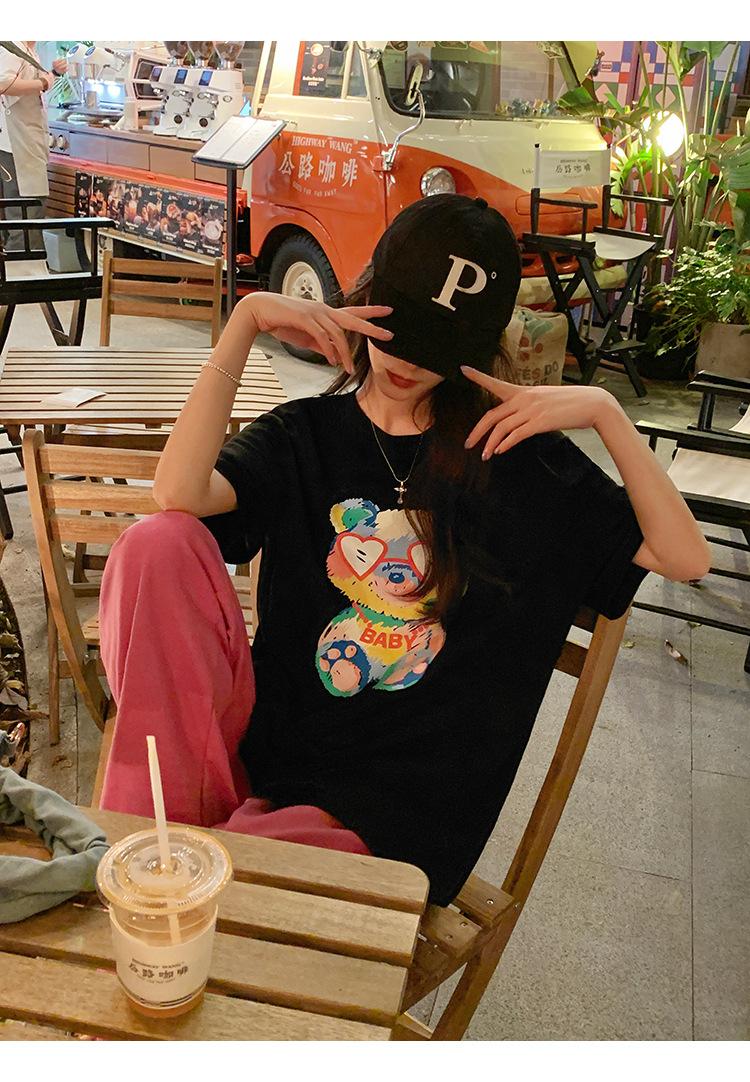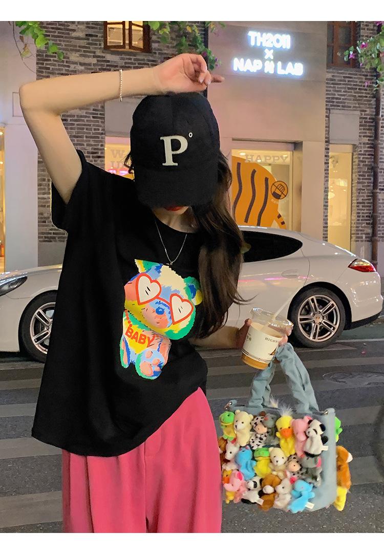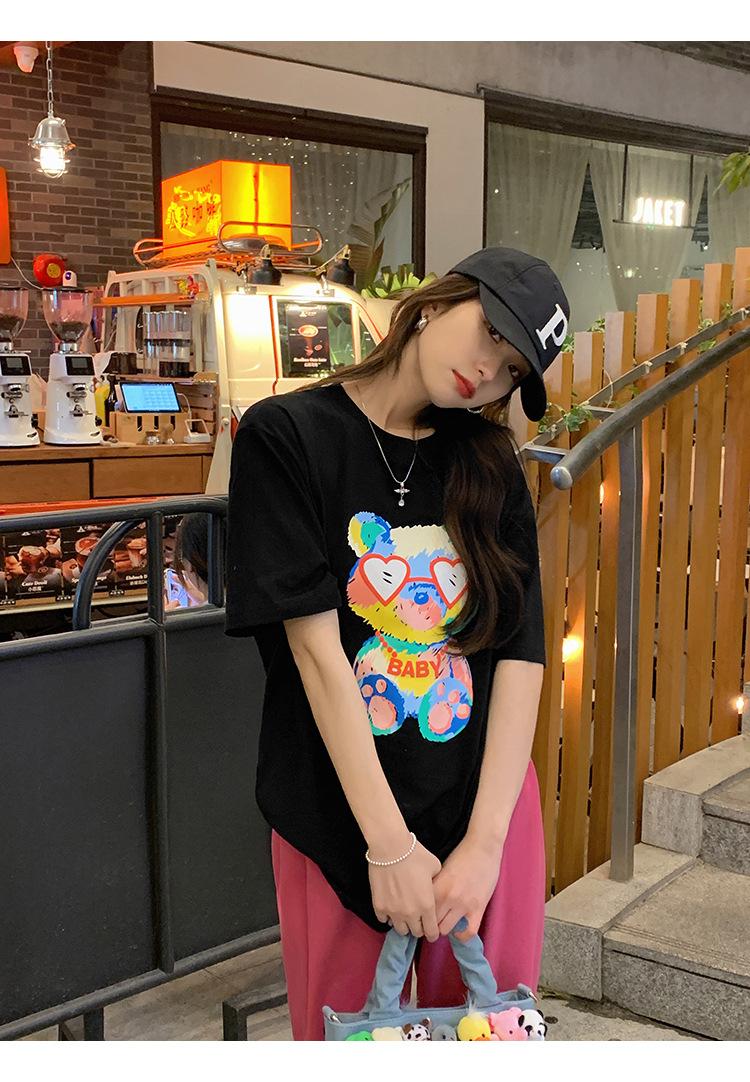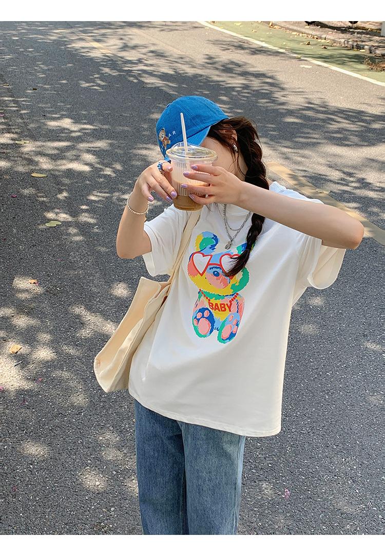 Dropshipping 2025 Nuevo Diseño Camiseta de Manga Corta con Estampado de Oso para Mujer Verano Nueva Holgada Estilo Coreano Top de Hombro Derecho t