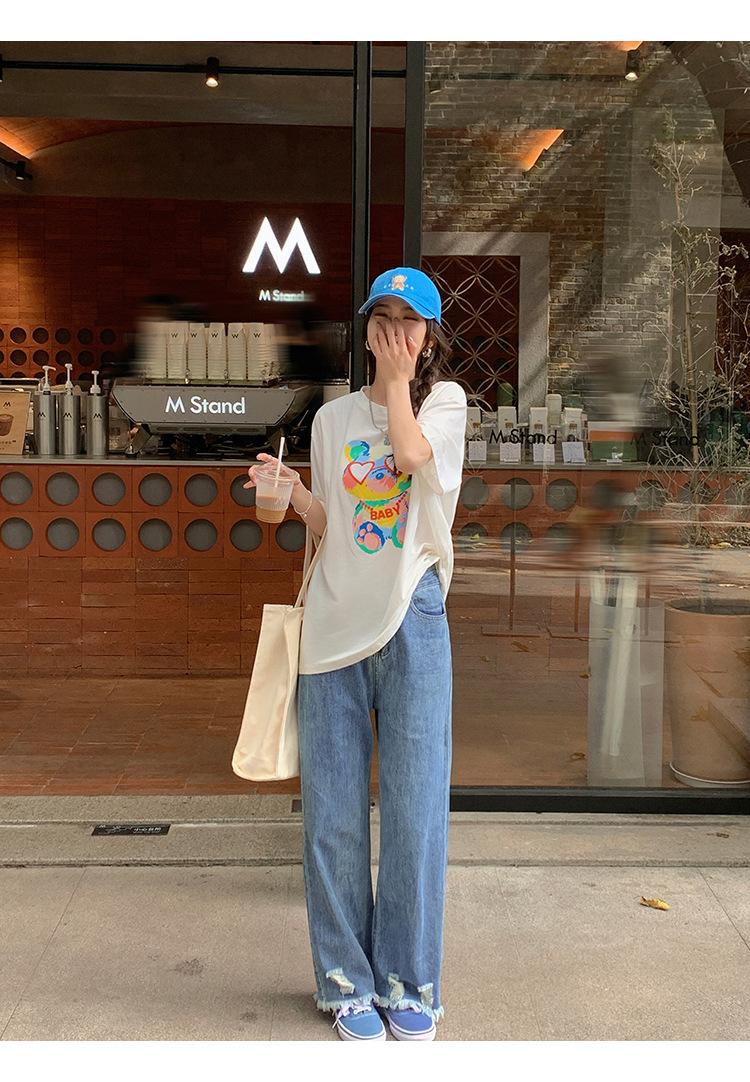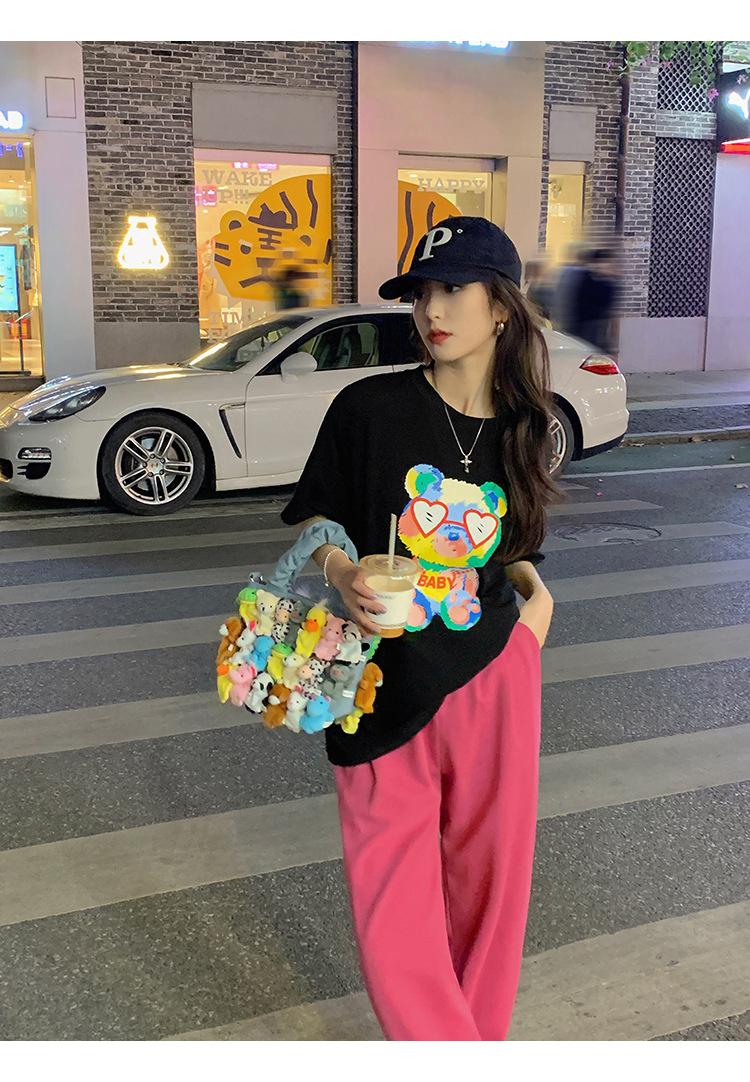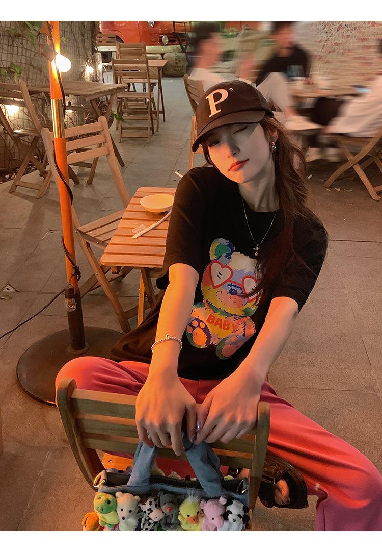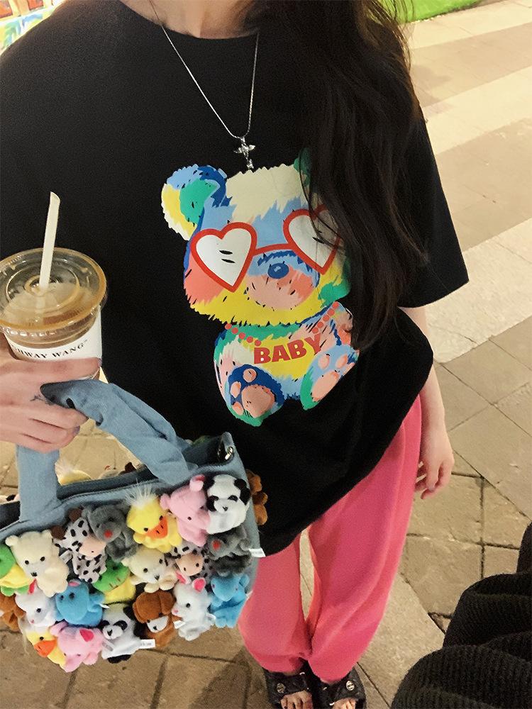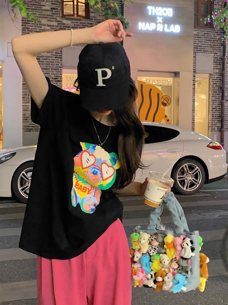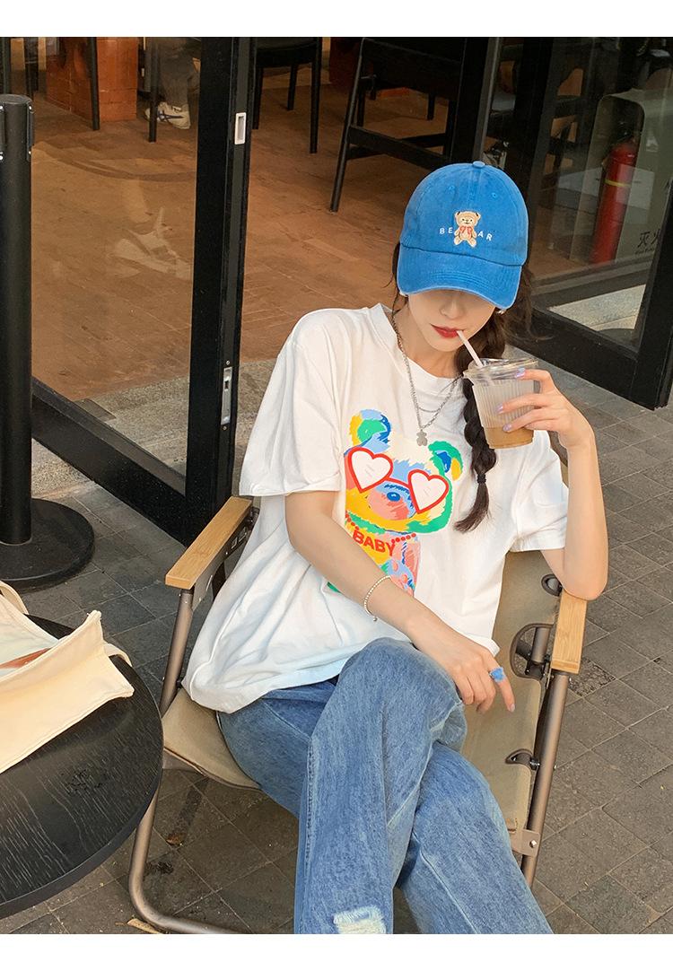 Dropshipping 2025 Nuevo Diseño Camiseta de Manga Corta con Estampado de Oso para Mujer Verano Nueva Holgada Estilo Coreano Top de Hombro Derecho t