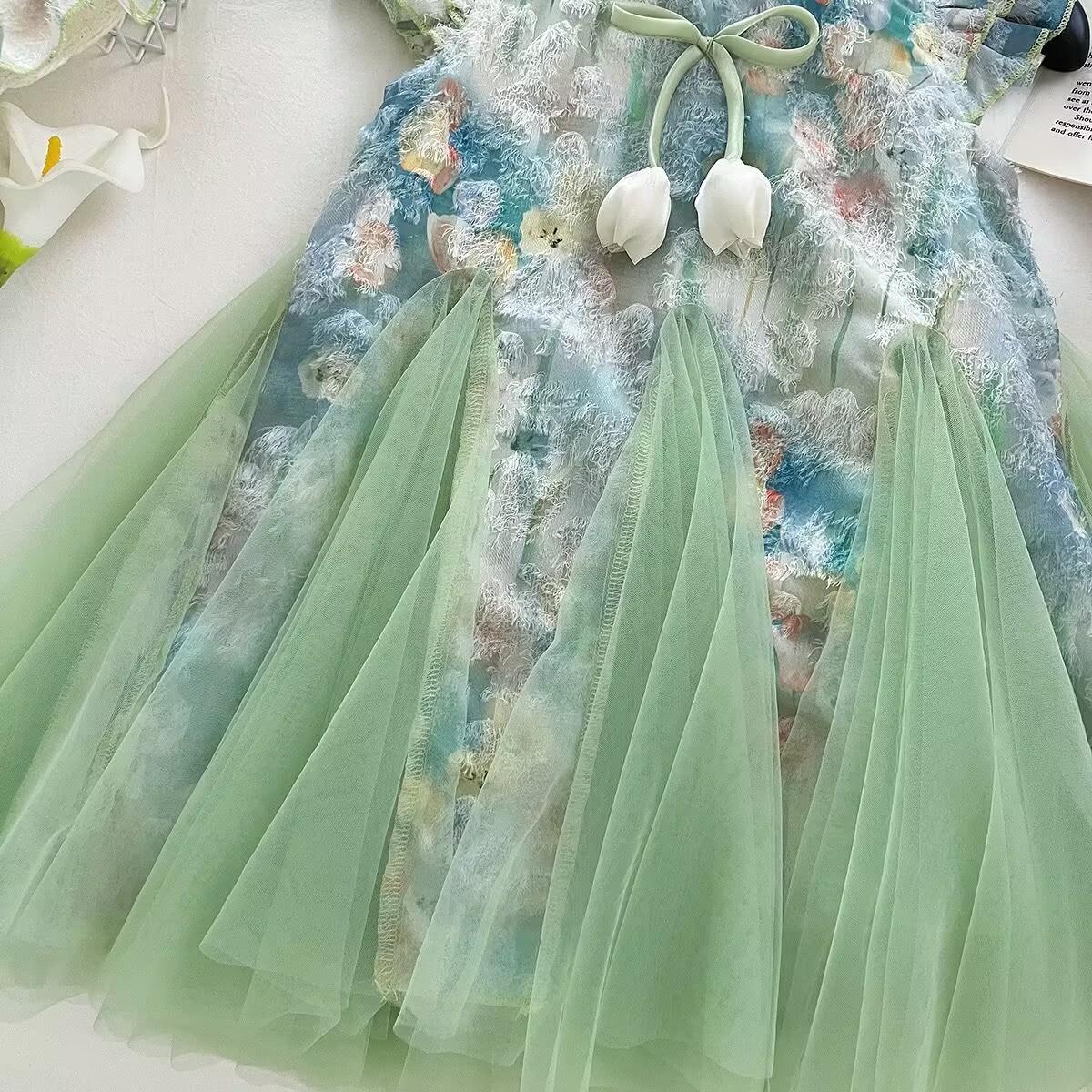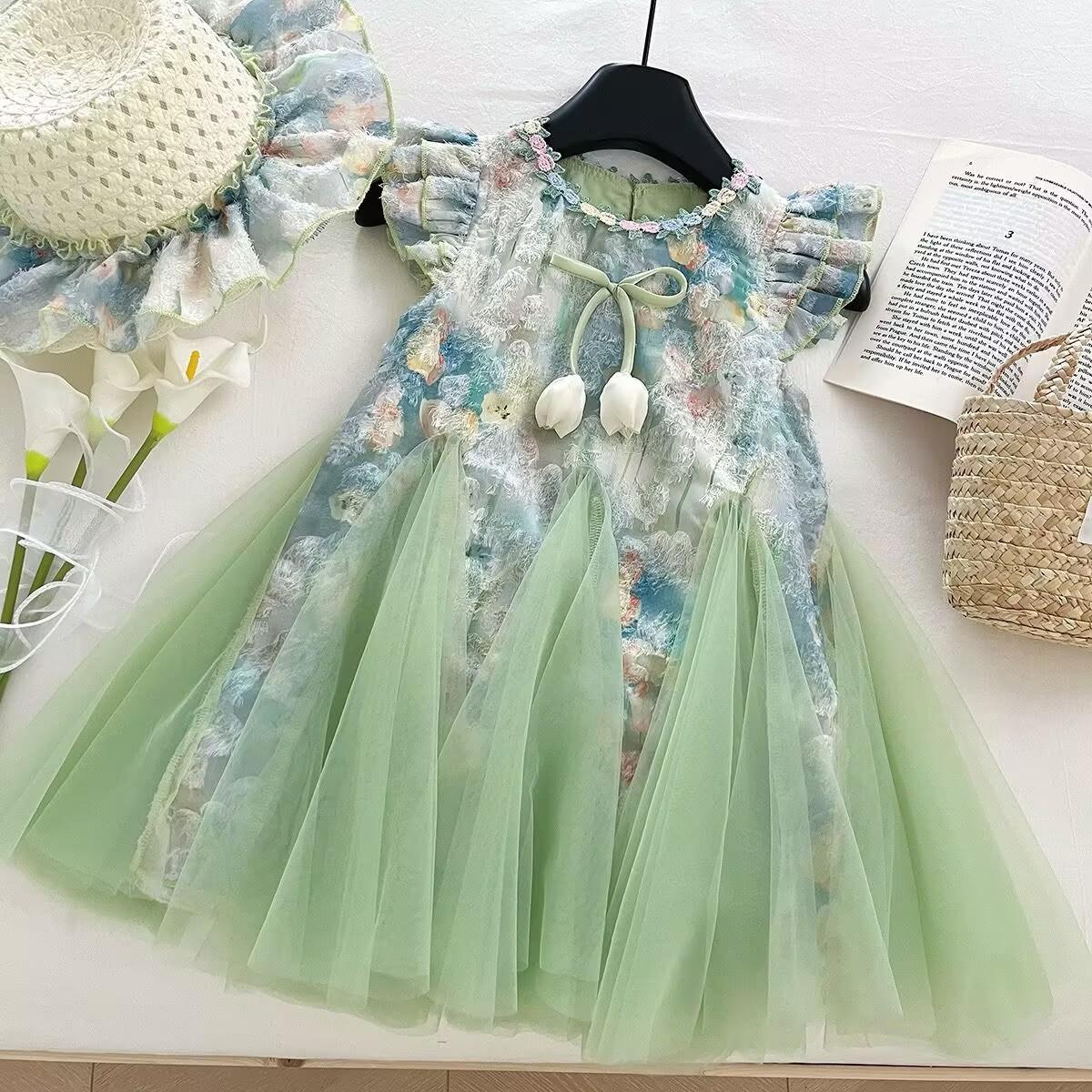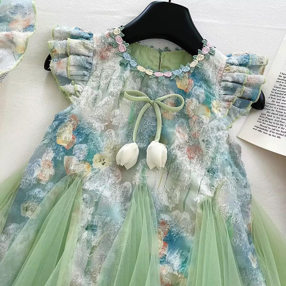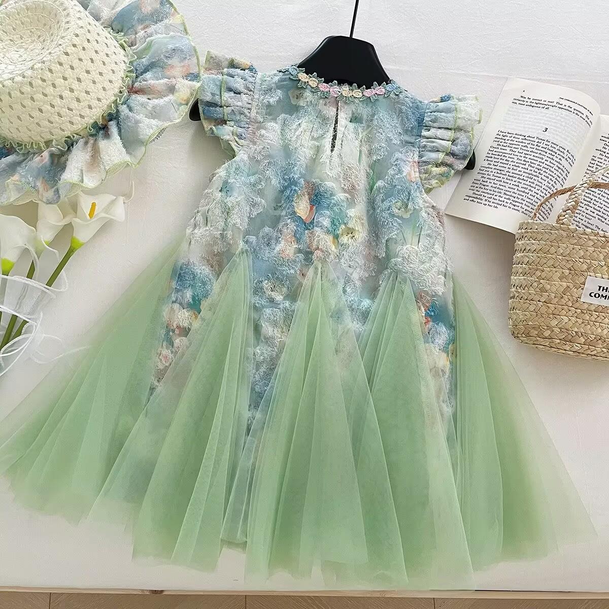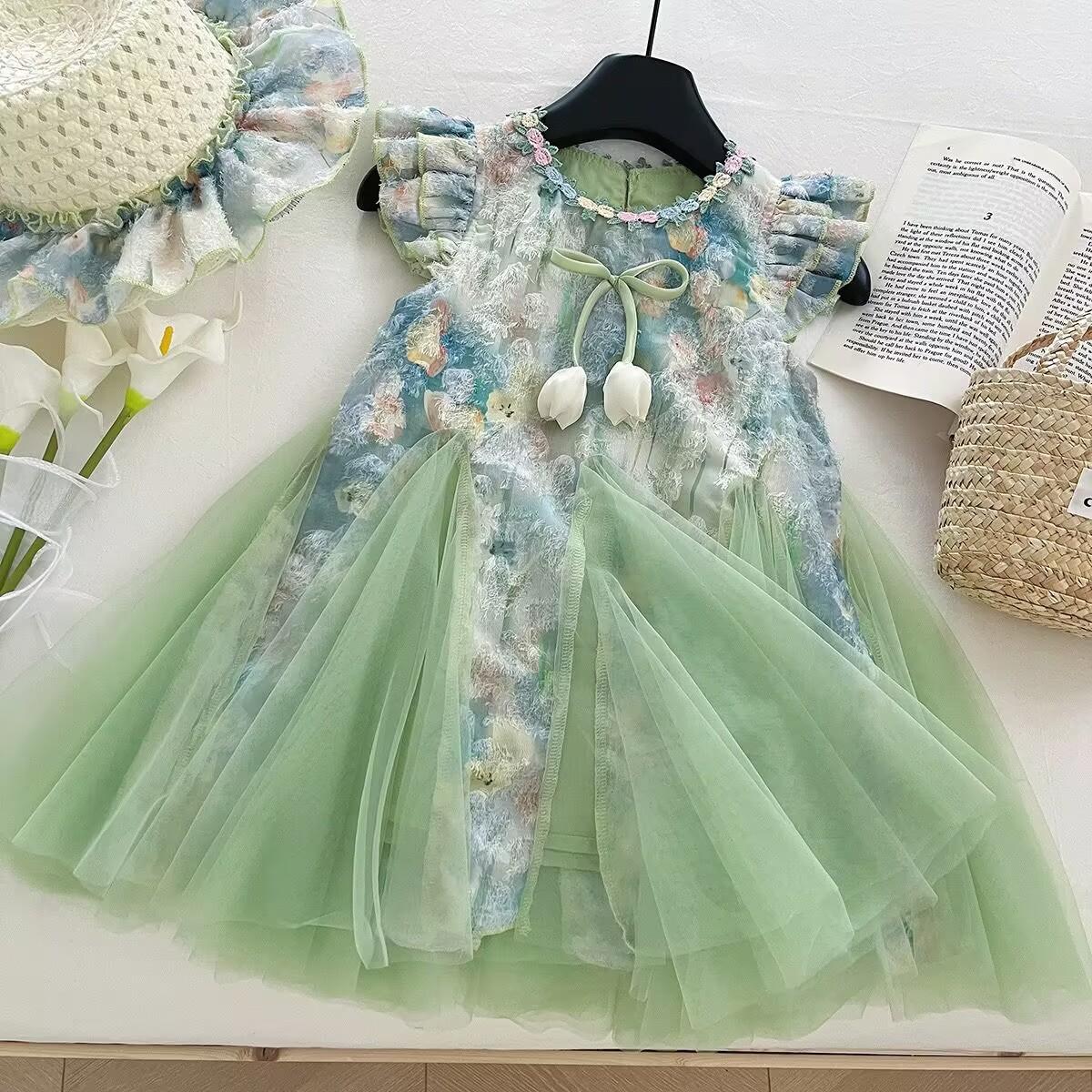 Vestido de Verano para Niñas 2025 Vestido Vat de Malla con Flores para Niñitas Vestido de Princesa Occidental para Niños