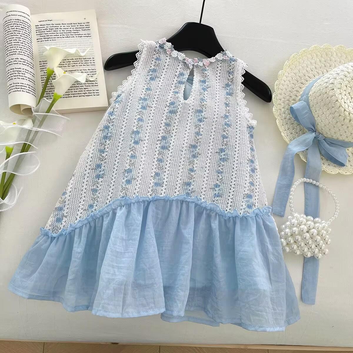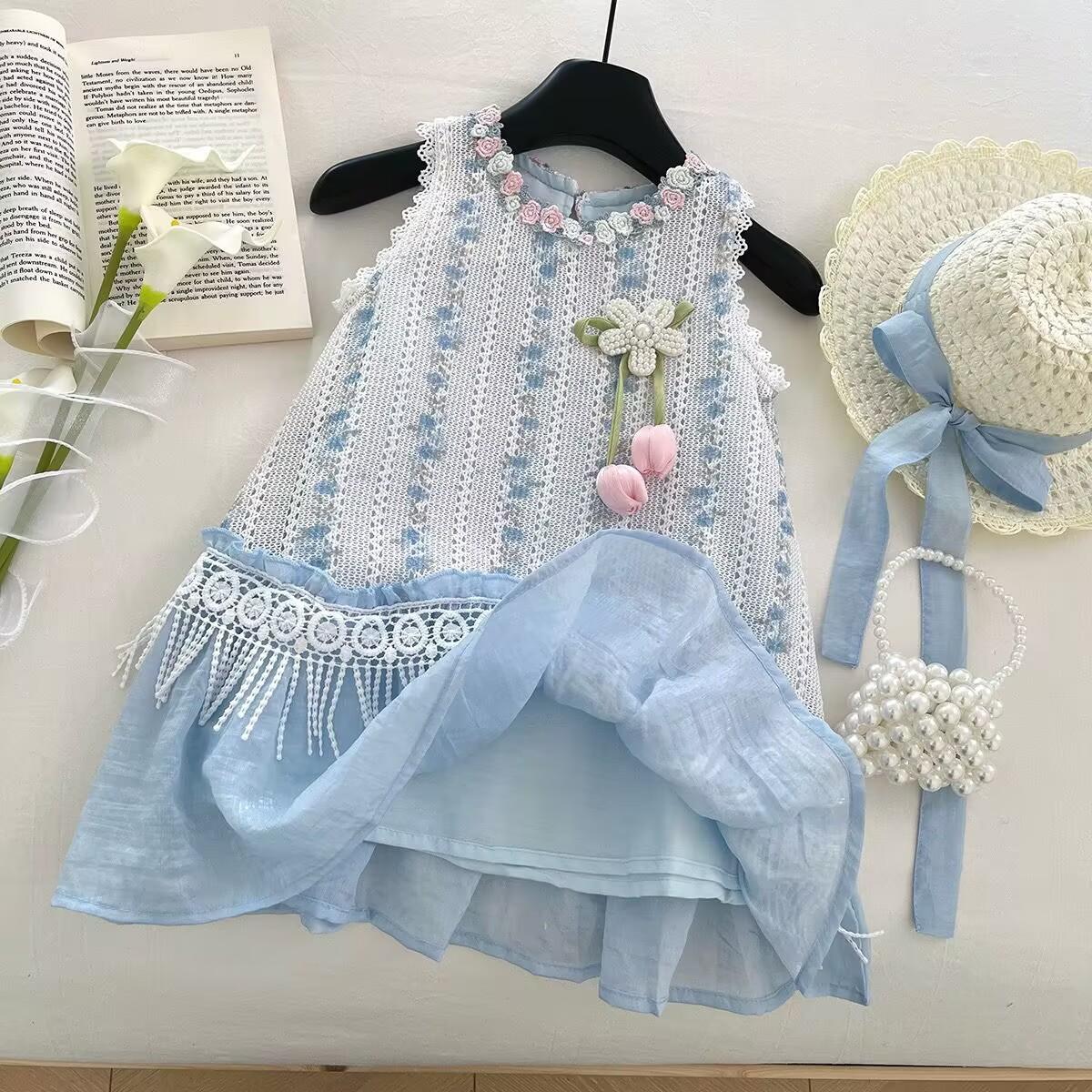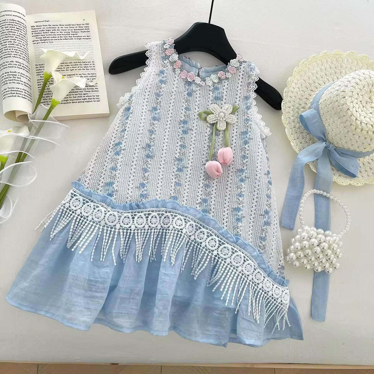 Vestido de verano para niñas 2025, nuevo vestido de princesa sin mangas con encaje y estilo vacacional para niñas.