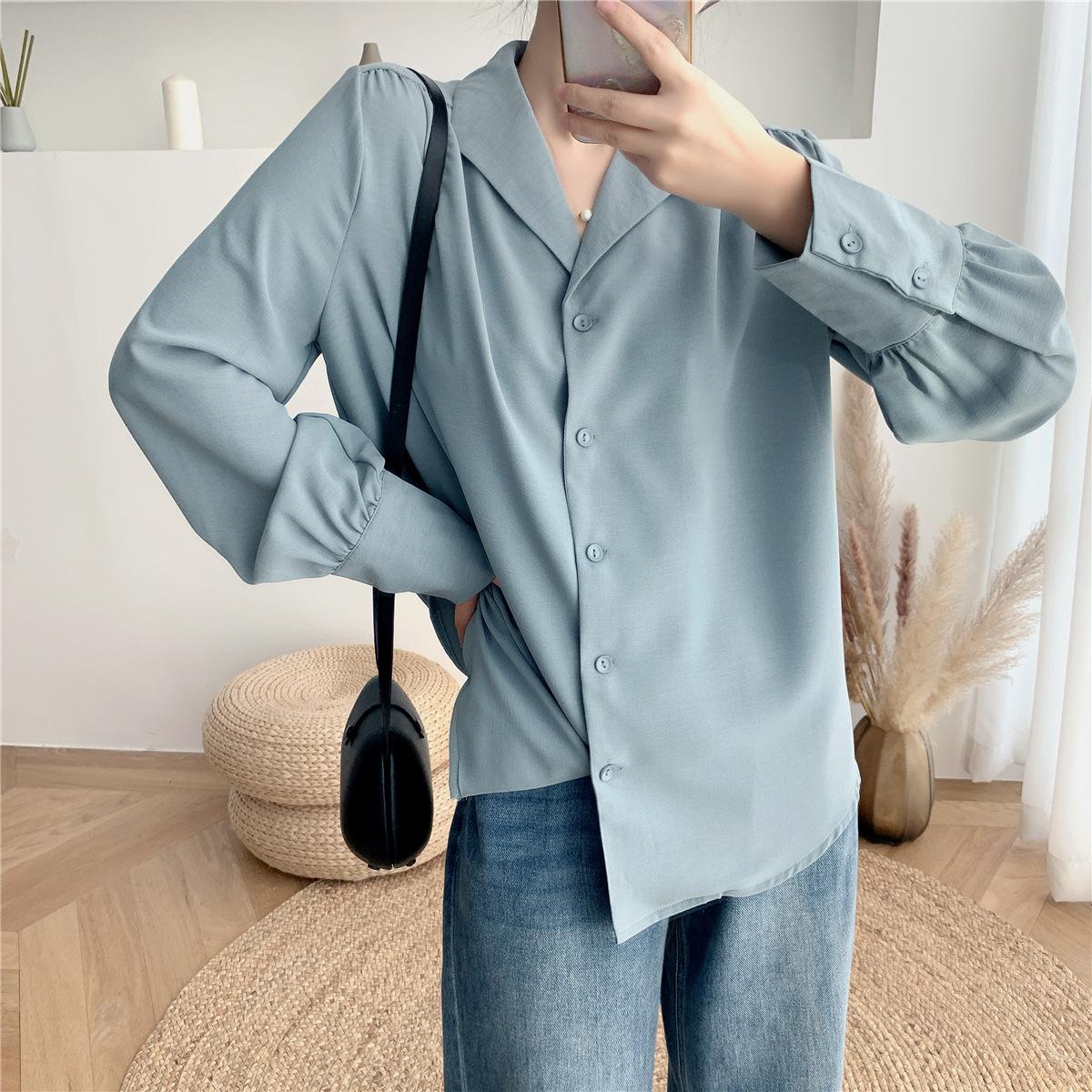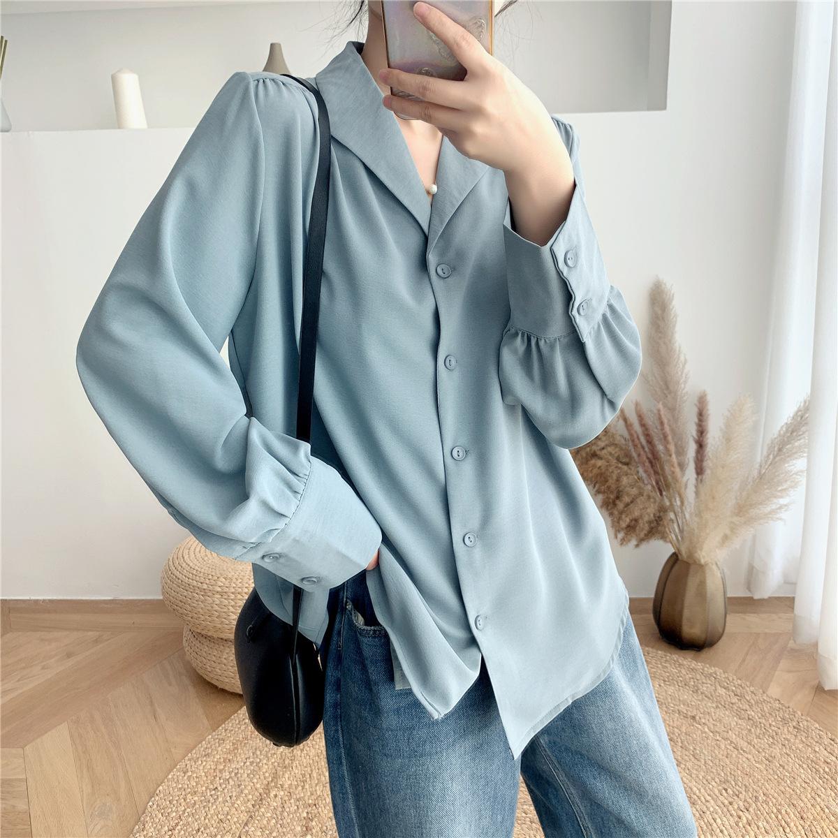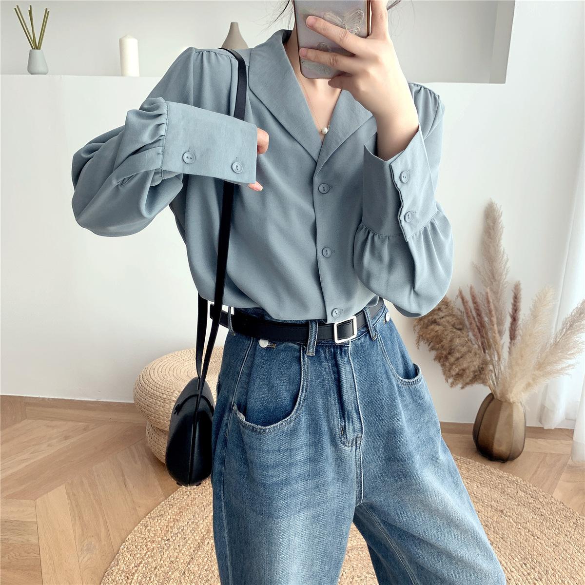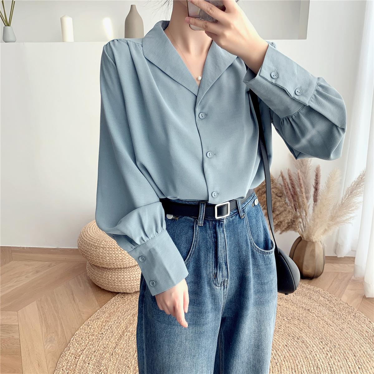 Compra Camisa francesa retro de color sólido, diseño para mujer, estilo coreano, primavera y otoño 2023, blusa holgada de manga larga para mujer al por mayor en Joom.pro