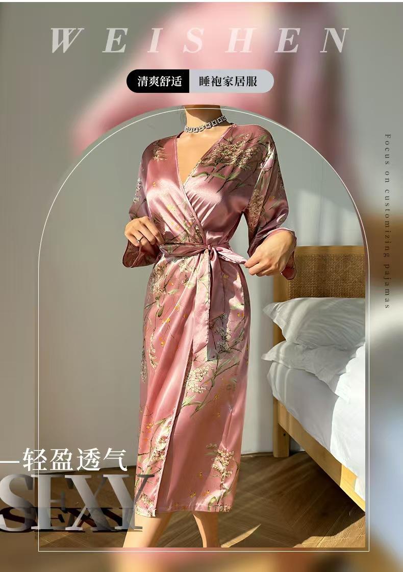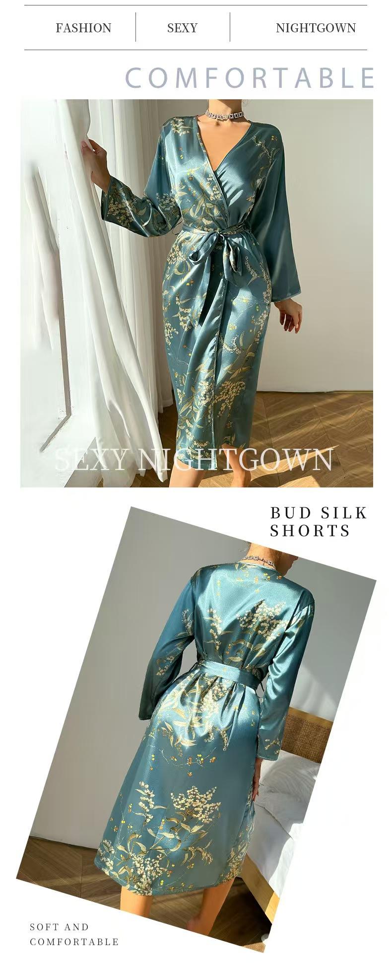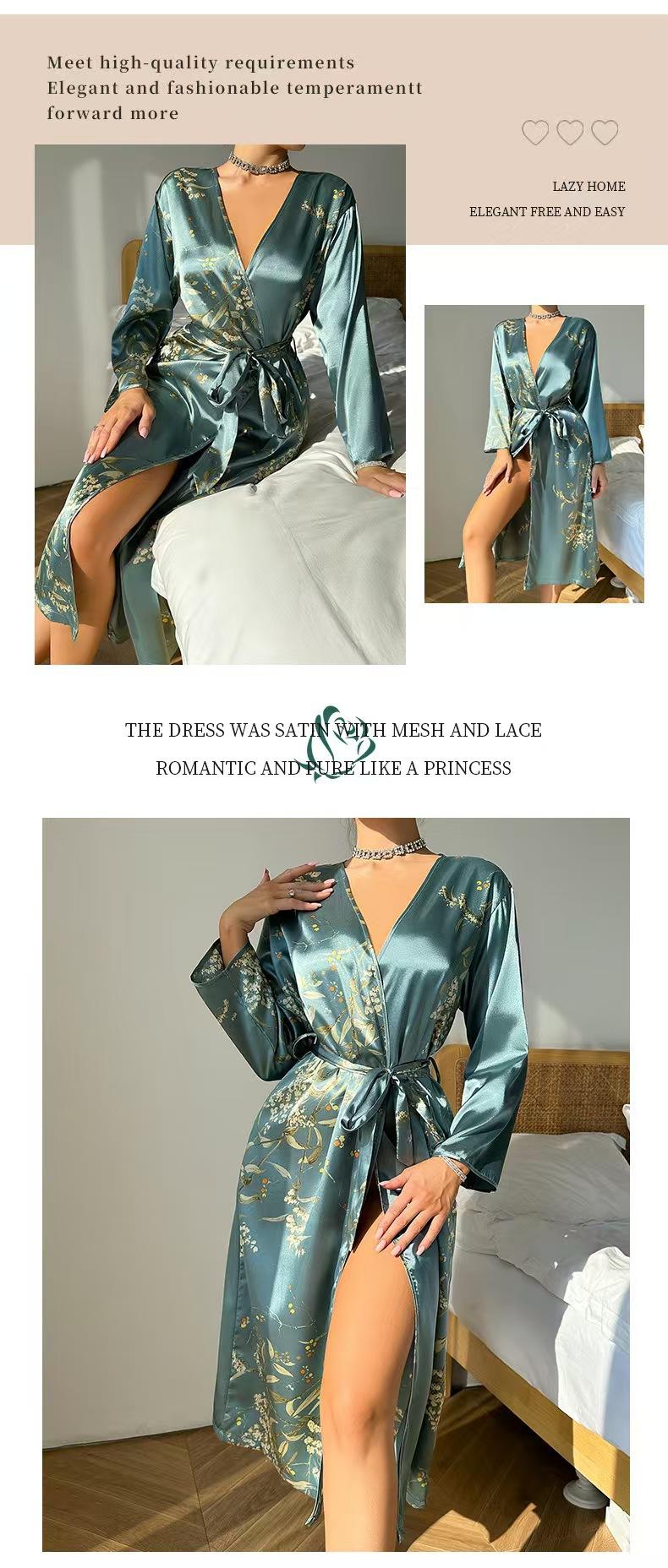 Pijama sexy europeo y americano con tirantes finos, cárdigan estampado de primavera y verano, de seda de manga larga, ropa de casa para mujer