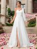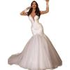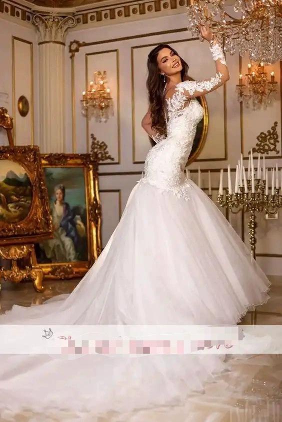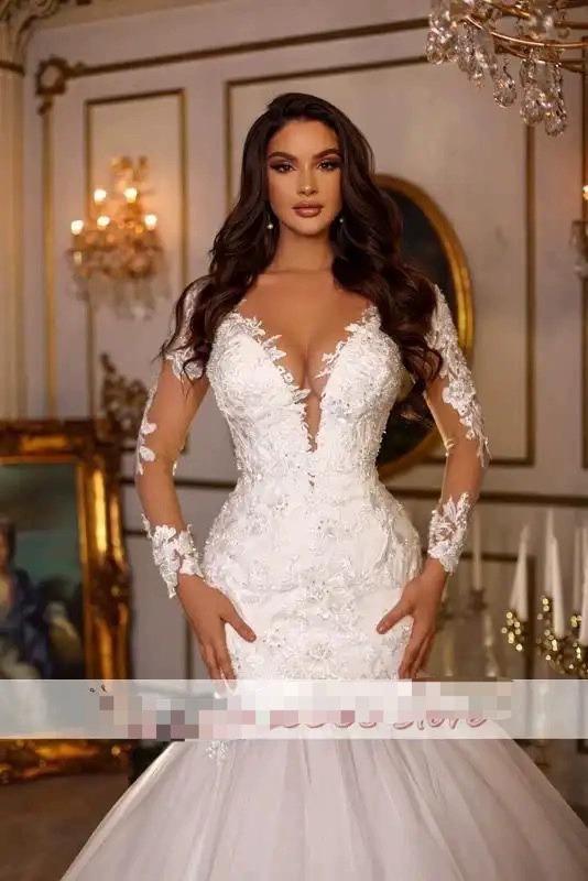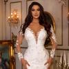 Verano Nuevo Vestido de Novia Blanco Slim Cola de Pez Sexy Escote en V Manga Larga Encaje Banquete Vestido de Noche