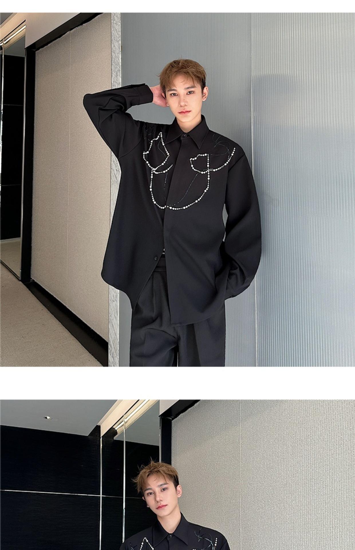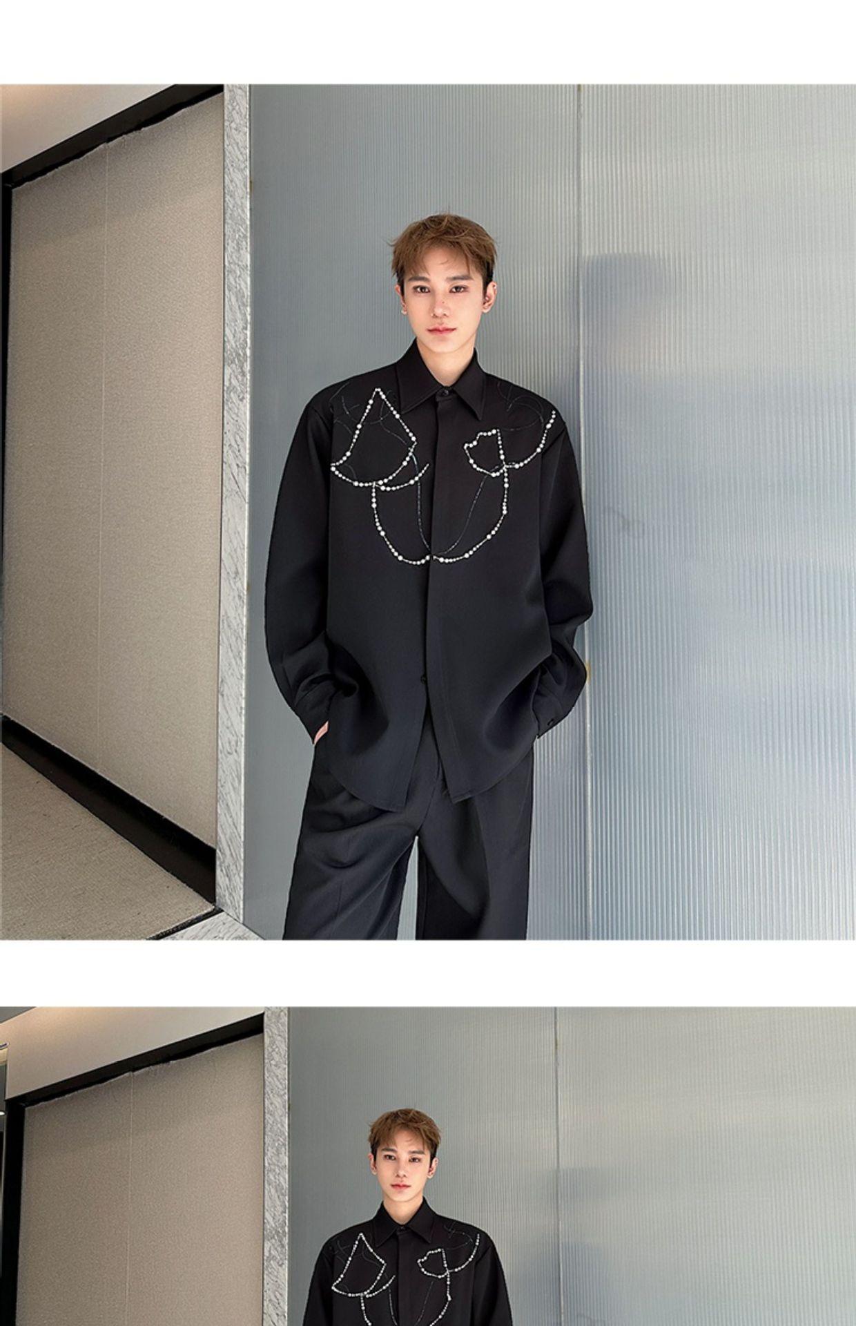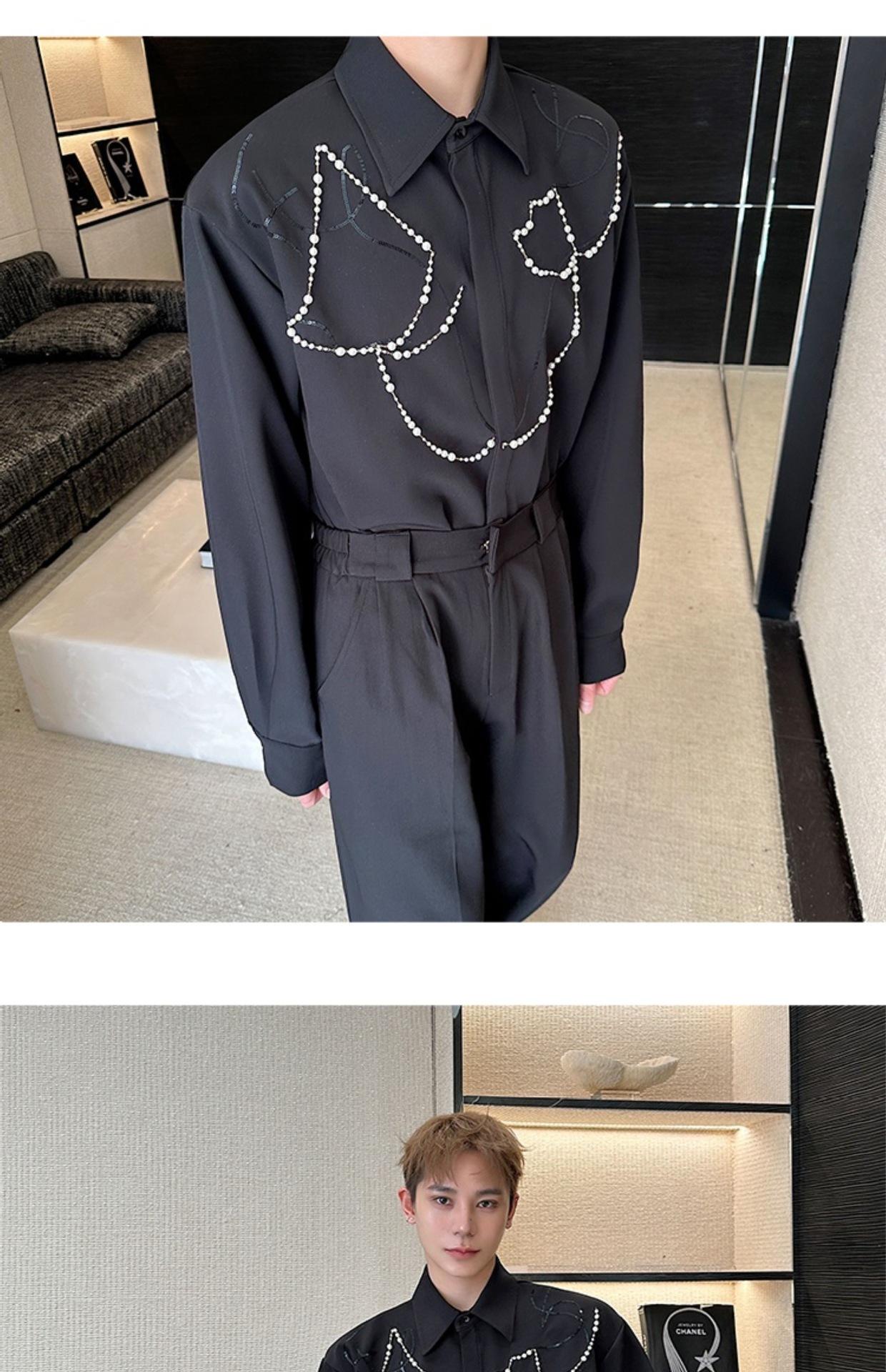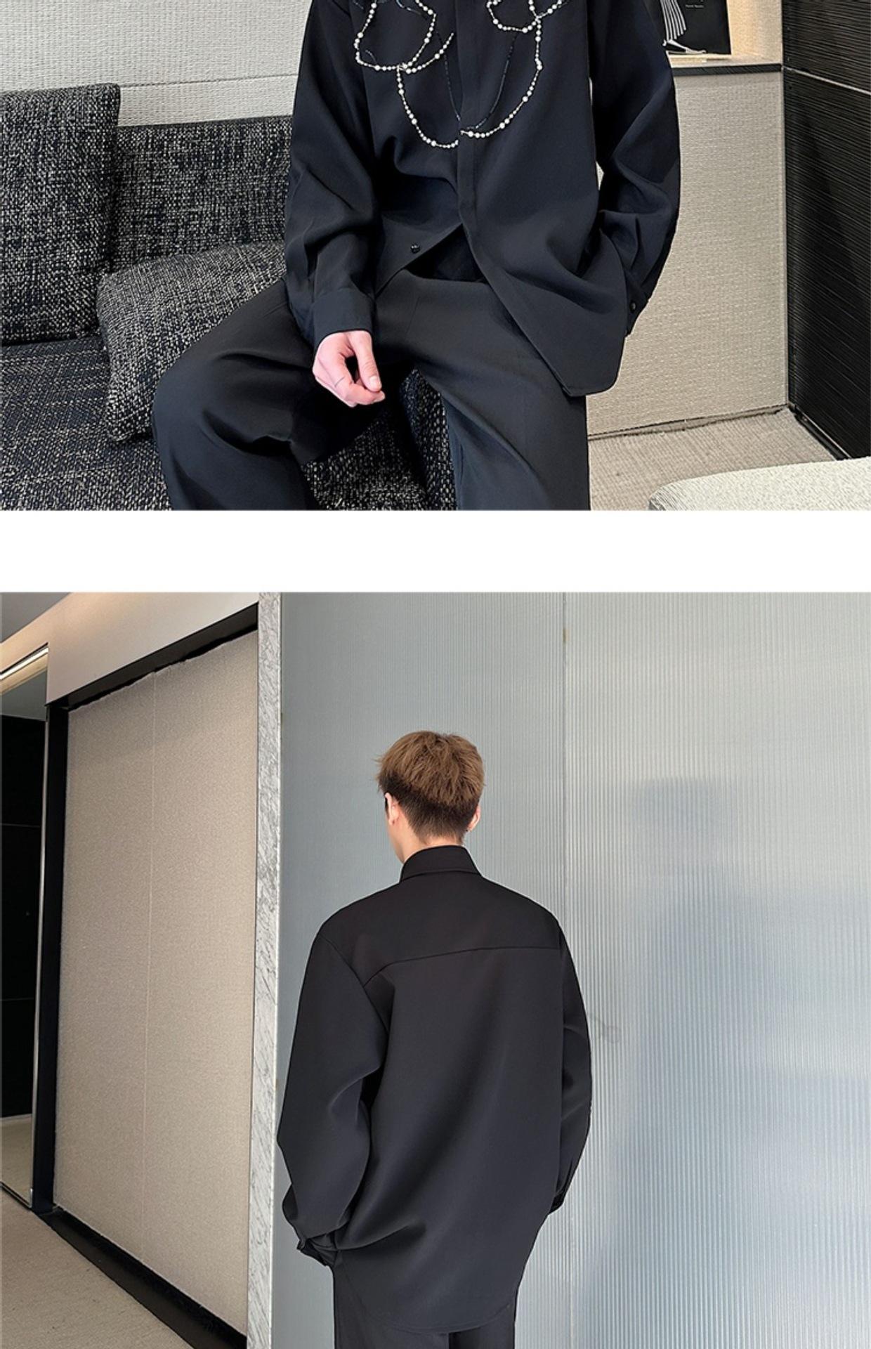 Primavera 2025 Nuevo Diseño Original de Alta Gama para Hombre Camisa de Manga Larga con Solapa de Lentejuelas y Cadena de Cuentas Hecha a Mano Trendy