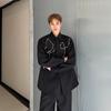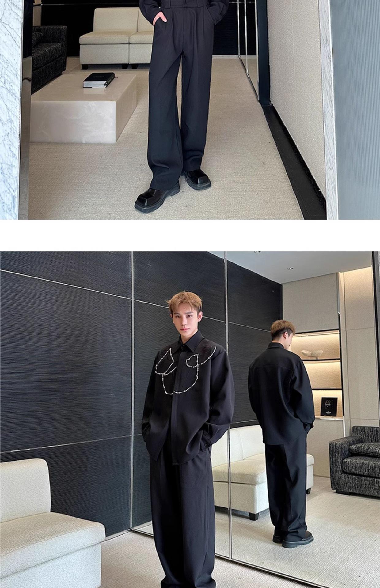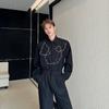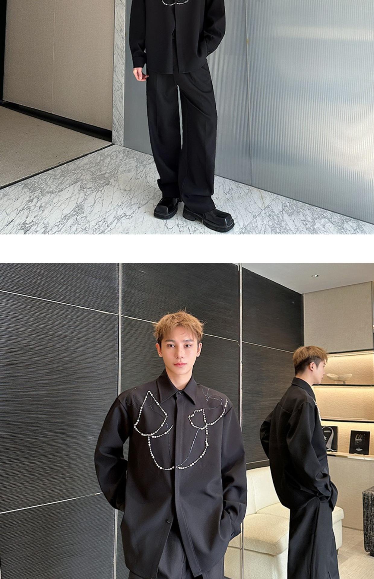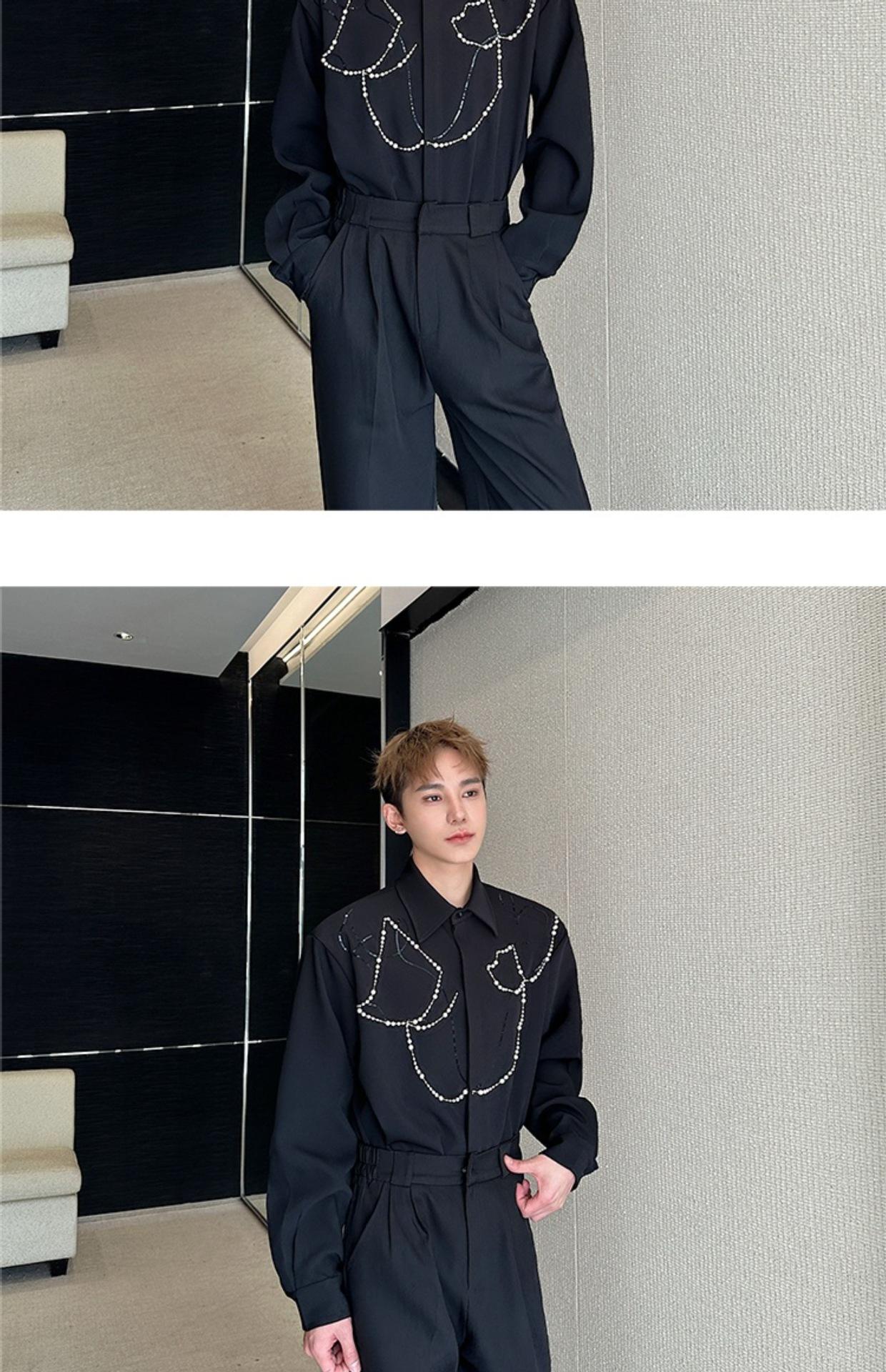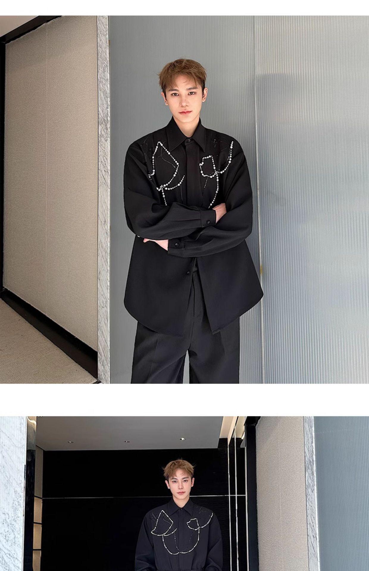 Primavera 2025 Nuevo Diseño Original de Alta Gama para Hombre Camisa de Manga Larga con Solapa de Lentejuelas y Cadena de Cuentas Hecha a Mano Trendy