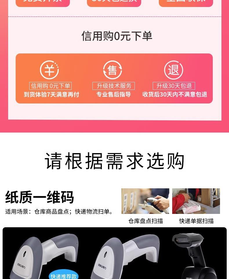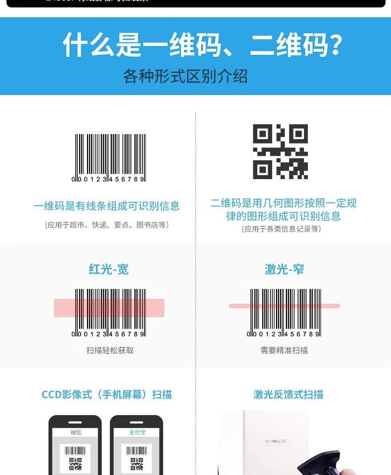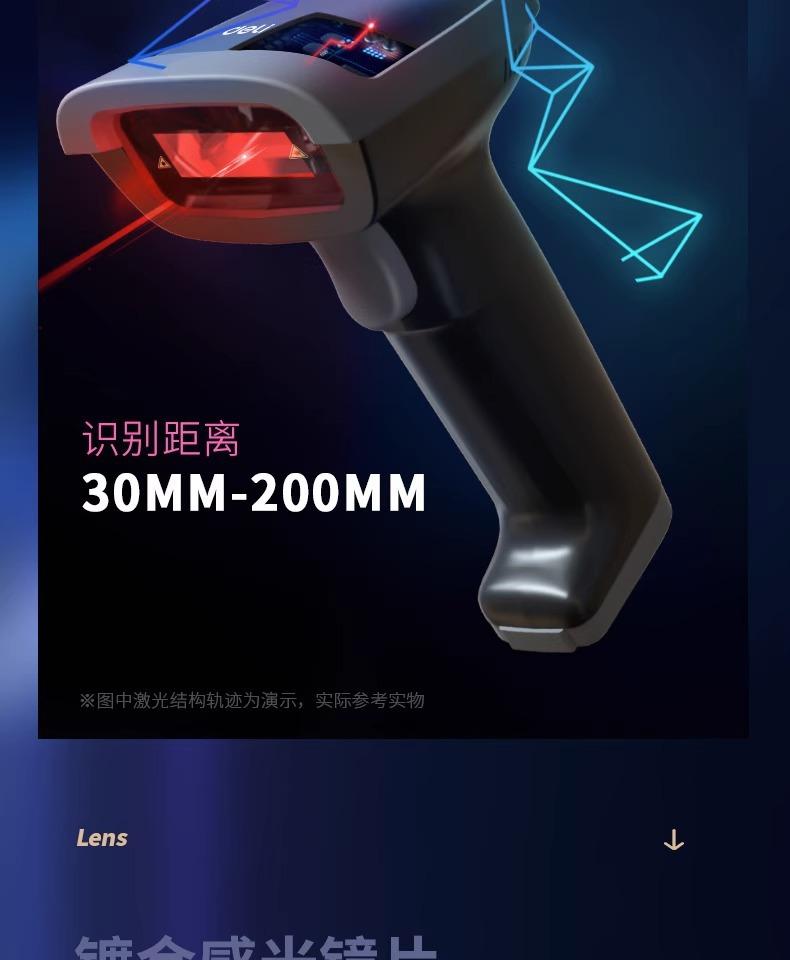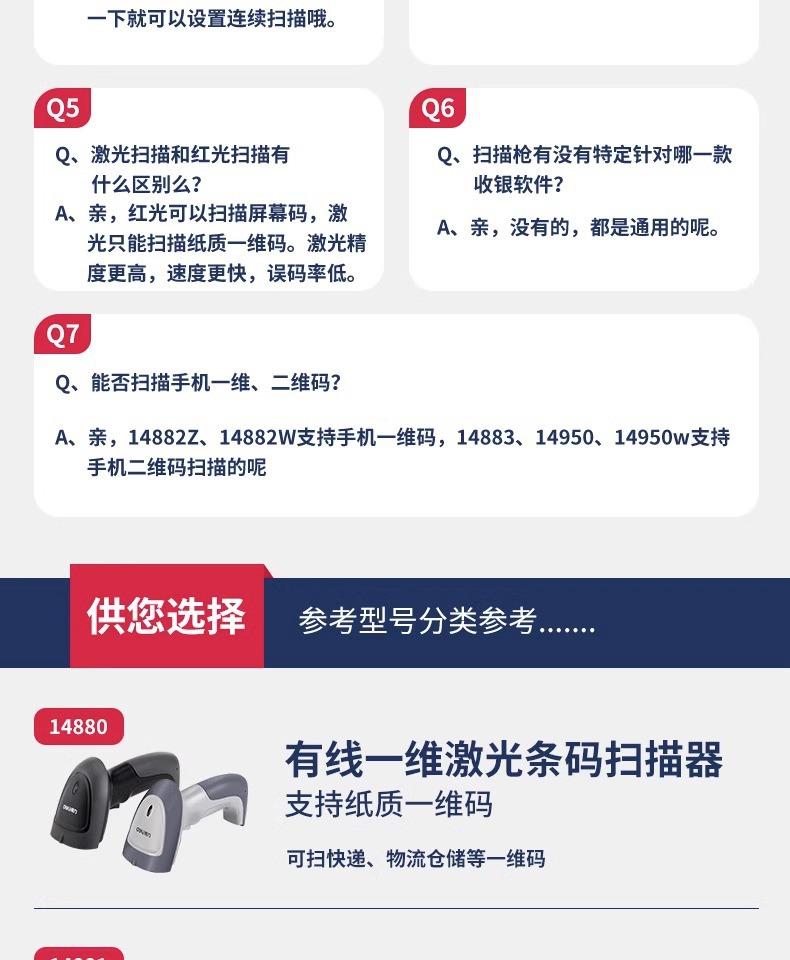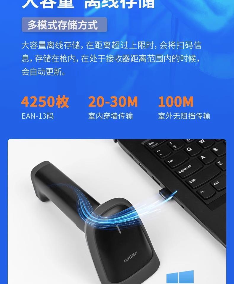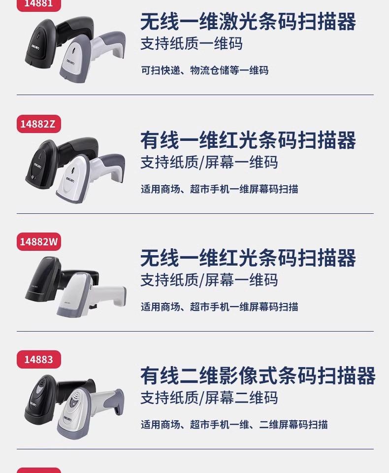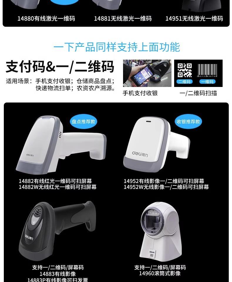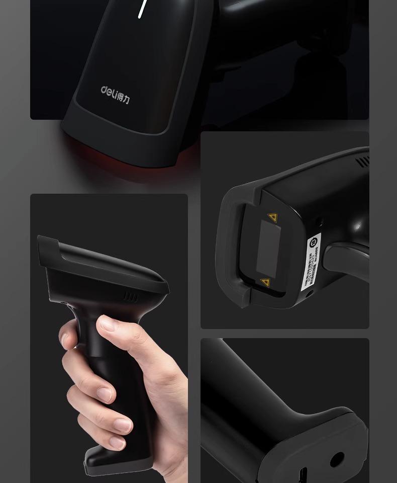 Pistola de escaneo de códigos Deli alámbrica inalámbrica código unidimensional código bidimensional escáner de código de barras expreso único supermercado caja registradora almacén